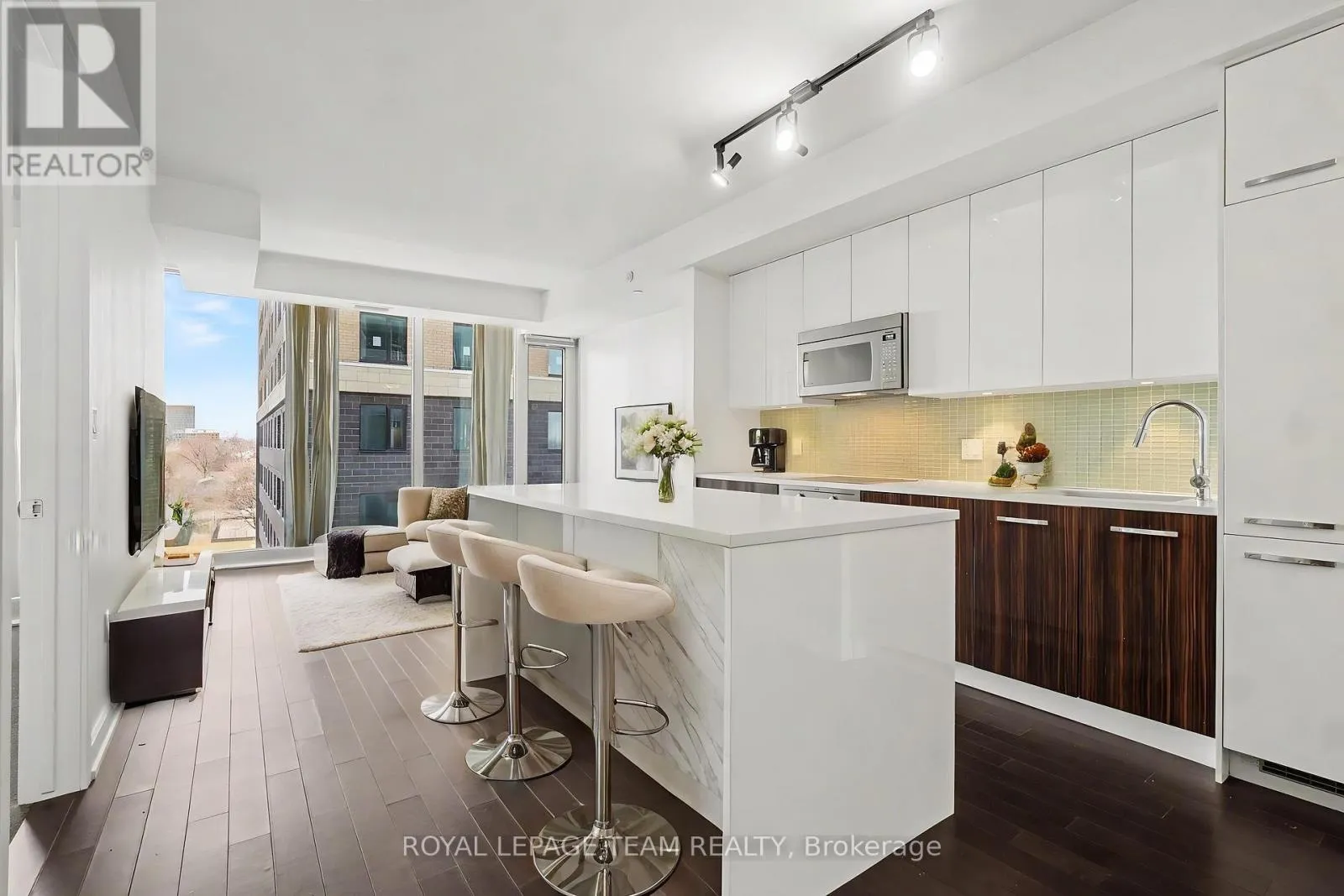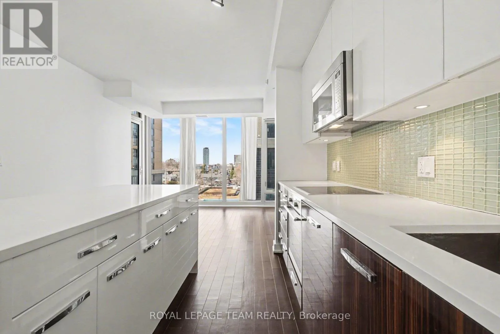 Welcome to 111 Champagne #404, where the sophisticated SOHO lifestyle meets the vibrant energy of Little Italy. This sleek, freshly painted one-bedroom suite offers a premier urban retreat featuring an open-concept layout with engineered hardwood, quartz countertops, and premium cabinet-matched appliances. The spacious bedroom serves as a quiet haven with plush carpeting, while the three-piece bathroom features a luxurious walk-in