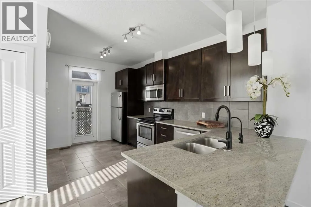 New Brighton Row. This recently painted and extensively upgraded end-unit townhouse, offering privacy, abundant natural light, and an open feel throughout. Thoughtfully designed across three levels, this home blends functionality with modern comfort in a low-maintenance setting.The entry level features a spacious tandem double attached garage, providing ample room for parking, storage, or workshop setup. It also offers the potential to turn 1/2 into additional living space for a gym, office or recreation area. A welcoming foyer creates a clean transition into the home, with access to a private outdoor patio.The main floor showcases a light and bright open-concept layout with 9’ high ceilings, creating an airy and inviting atmosphere. The living and dining areas flow seamlessly together, enhanced by large windows that fill the space with natural light. At the center, the kitchen stands out with granite countertops, stainless steel appliances, full-height cabinetry, and a side island with space for seating, designed for both everyday living and entertaining. A convenient 2-piece bathroom and access to the rear upper deck complete this level.Upstairs, the home offers a well-balanced 3-bedroom layout designed for comfort and privacy. The primary bedroom features a walk-in closet and private 3-piece ensuite, while two additional good-sized bedrooms provide flexibility for family, guests, or a home office. A full 4-piece bathroom and upper-level closet laundry add everyday convenience.Extensive upgrades throughout the home include hardwood flooring throughout, a new furnace, water softener, and reverse osmosis water filtration system , enhancing both comfort and long-term value.Conveniently located near 130th Avenue SE and the New Brighton Athletic Park, residents enjoy quick access to grocery stores, restaurants, cafes, walking trails, open fields and everyday essentials just minutes away. With close proximity to Deerfoot Trail and Stoney Trail, commuting is simple and efficient—whether heading downtown or across the city.This pet-friendly complex allows 2 cats or 1 dog (max 20kg), along with fish or birds (with board approval), making it an ideal option for a variety of lifestyles. TOUR THE 3D WALK-THROUGH BELOW. (id:64429)