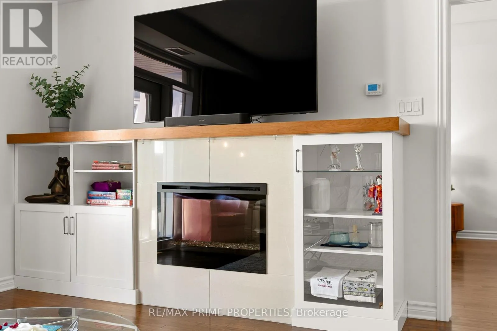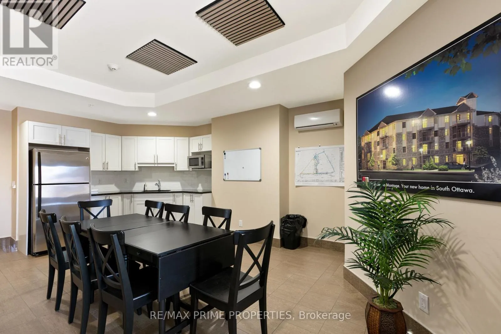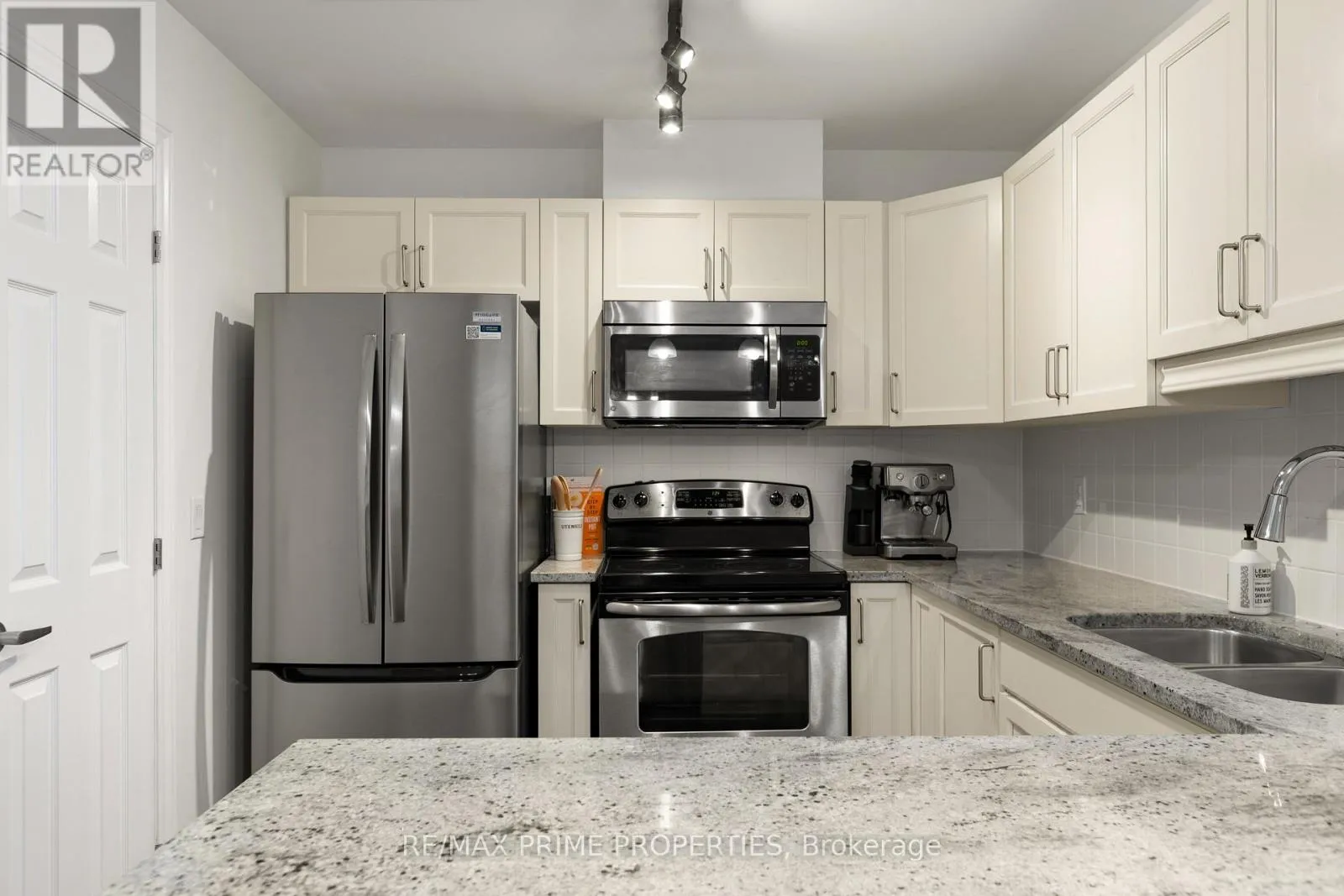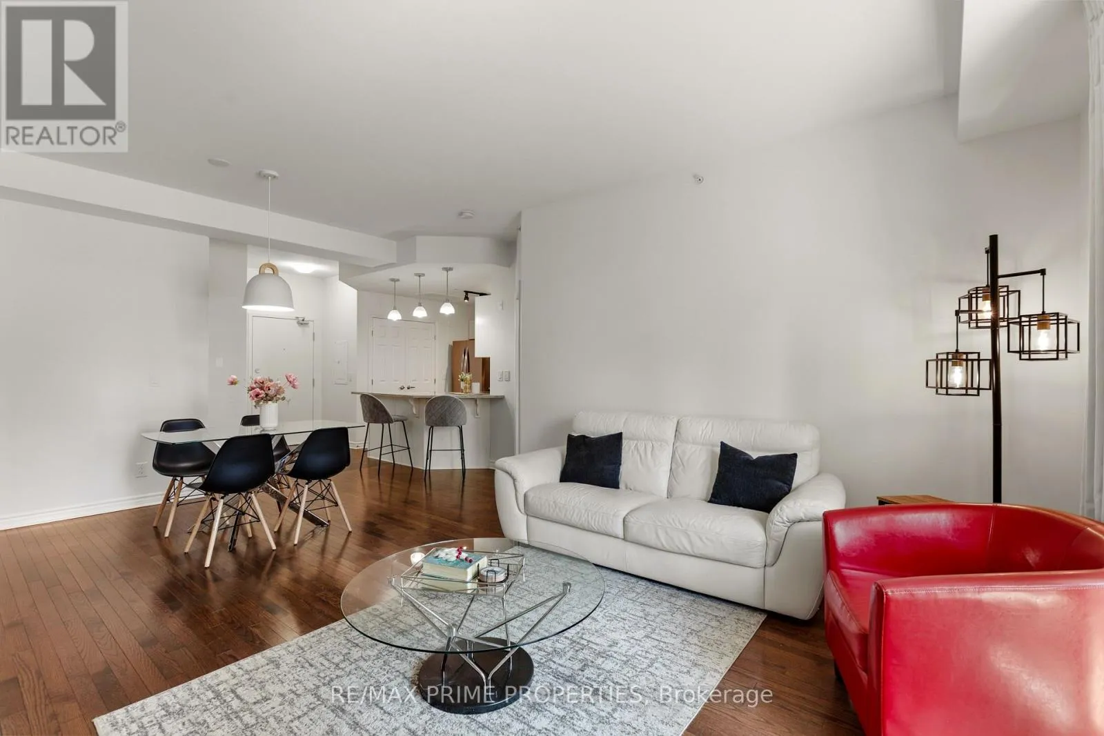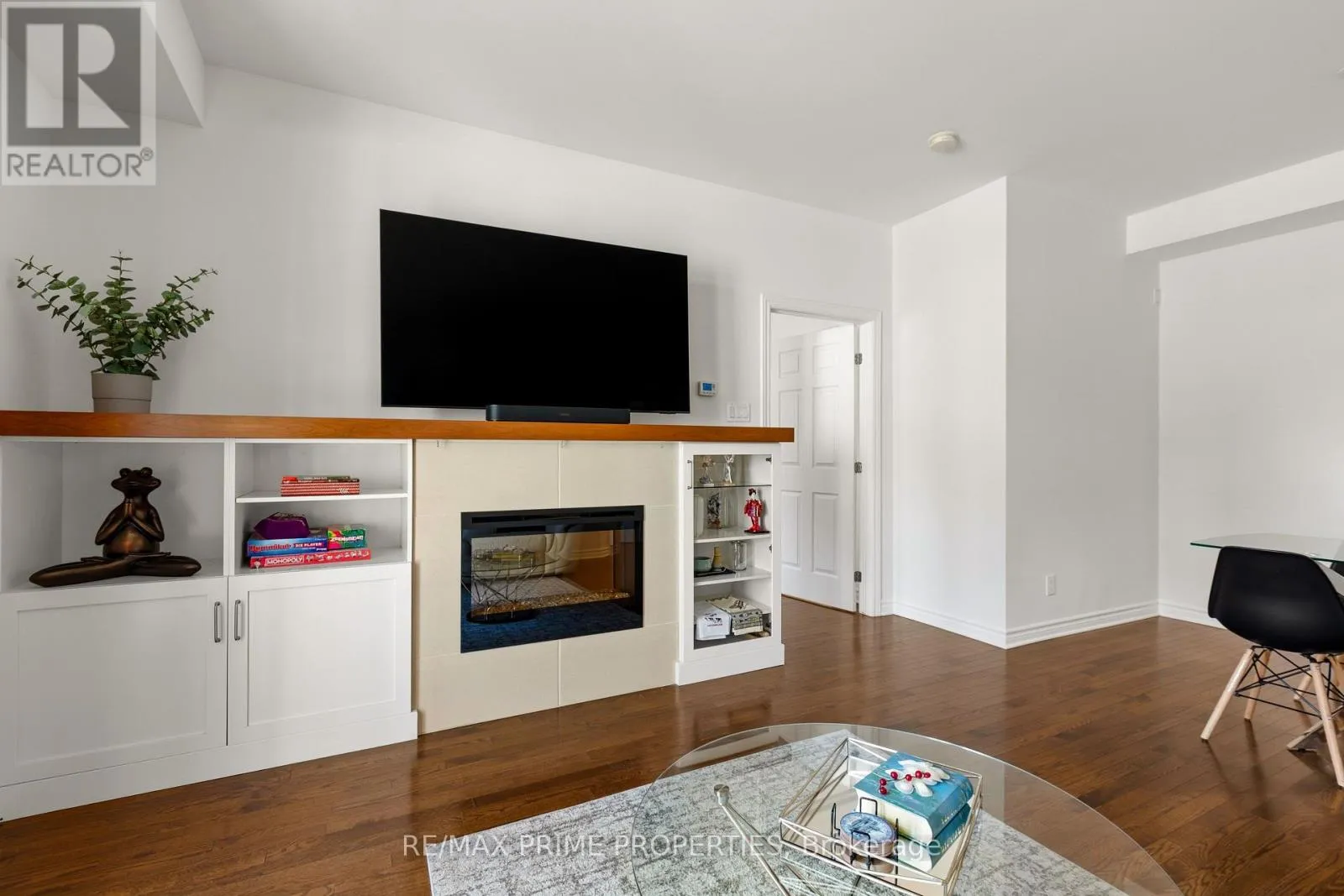 Beautiful and bright 2-bedroom, 2-bathroom condo with elevator access featuring hardwood and tile flooring throughout, a spacious living room with a fireplace, and direct access to a private balcony. The dining area is accented by a modern hanging light fixture, and the kitchen boasts granite countertops, stainless steel appliances, a double-door fridge added in 2025, plenty of cabinets, and a