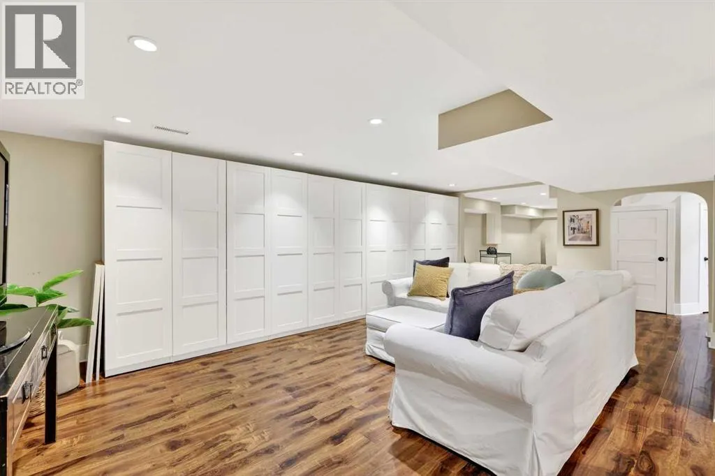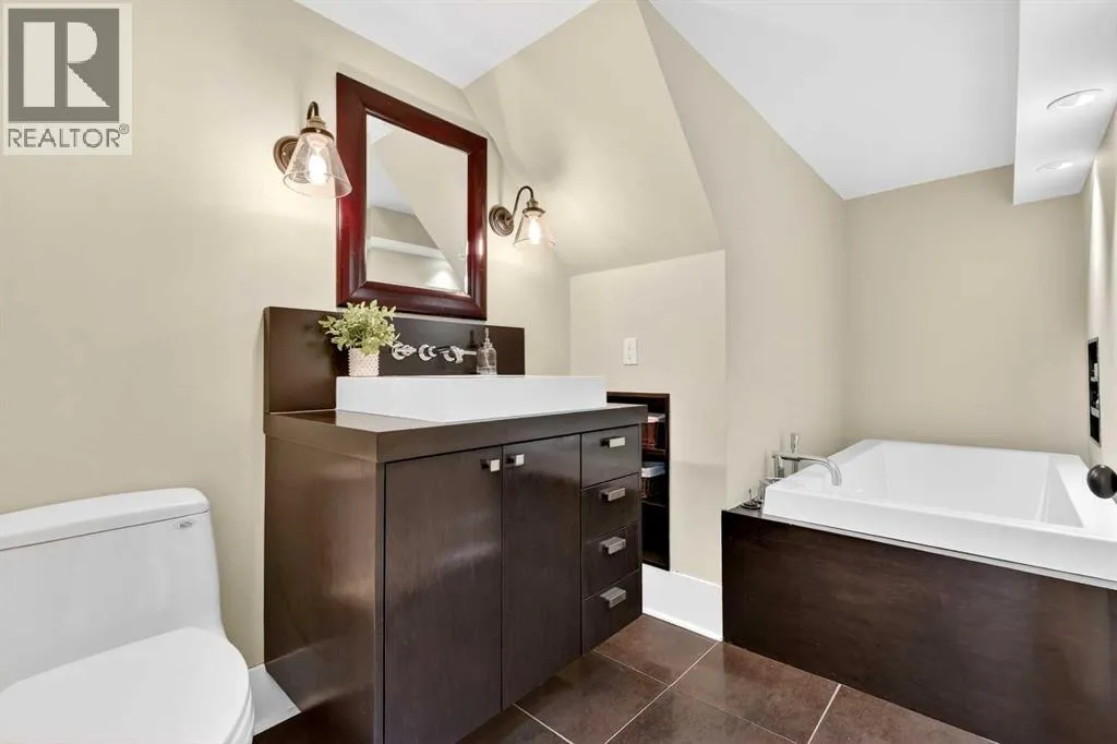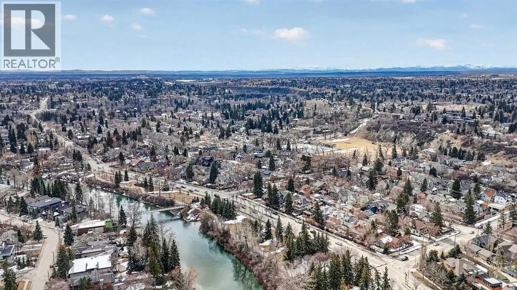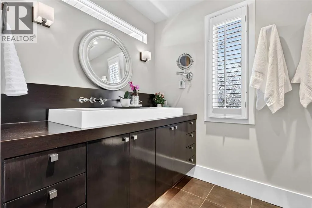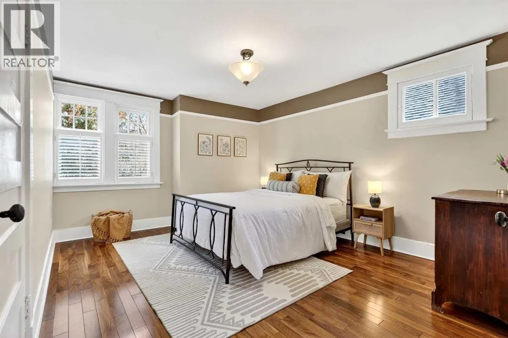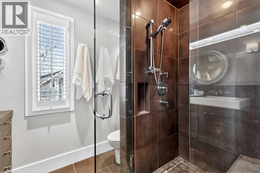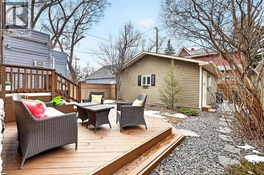 wood shutters into an inviting living room. The main floor features modern hardwood, fresh paint, and a bright kitchen with an island, concrete countertops, a high-end Dacor oven with gas range and a Bosch dishwasher — ideal for everyday living or entertaining. An inviting office/den with a gas fireplace and sunlit shutters provides a cozy workspace or quiet retreat, and doors from the kitchen open to a back deck overlooking a west-facing backyard that soaks up the afternoon sun.Upstairs, hardwood flows through the four bedrooms, providing you with lots of space for your family, or even a home office. The bathroom features heated tile, a double vanity, large shower, and plenty of natural light. A cozy second-floor balcony captures sunsets with views of the nearby park. The fully finished lower level is a true bonus: you’ll love the extra space and storage in the recreation area, with its abundant storage. The laundry room is a dream, with built-in cabinetry, a sink, lots of countertop space, and incredible storage. The fitness/multi-purpose area and the high-end bathroom (with an elegant soaker tub and heated tile) round out the basement.Mechanical upgrades provide peace of mind with a new furnace, a new tankless hot water heater, and a high-end flood protection system (Doug Lacey Basement Systems / Groundworks) featuring a backup valve, sump pump, two batteries and an alarm. Outside, the oversized double garage fits two cars plus storage, and professionally maintained landscaping enhances curb appeal. Located just a block from Christ Church Park and playground — home to the El bow Park tennis courts, basketball courts, winter outdoor rinks and the infamous toboggan hill — and only blocks from the Glencoe Club, Elbow Park School, Rideau Park School, William Reid School and the Elbow River pathway system. This home is about a 10-minute walk to Mission, and easily walkable into downtown Calgary. Elbow Park offers a welcoming neighbourhood with frequent block parties, lots of school aged kids, and friendly neighbours. Don’t miss the opportunity to live on one of its most sought-after streets. (id:64429)