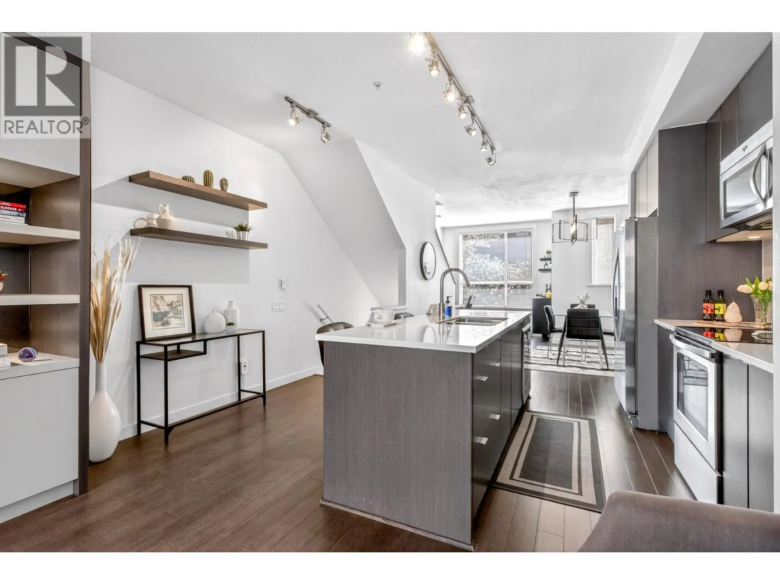 Stunning 2 Bed + Den, townhome at sought-after Fremont by Mosaic Homes. Spacious & modern, the main level features a custom built-in wall unit with accent lighting, a feature wall & oversized windows that flood the home with natural light. Thoughtfully designed with a proper dining area, laminate flooring on both levels, new hot water tank & updated washer &