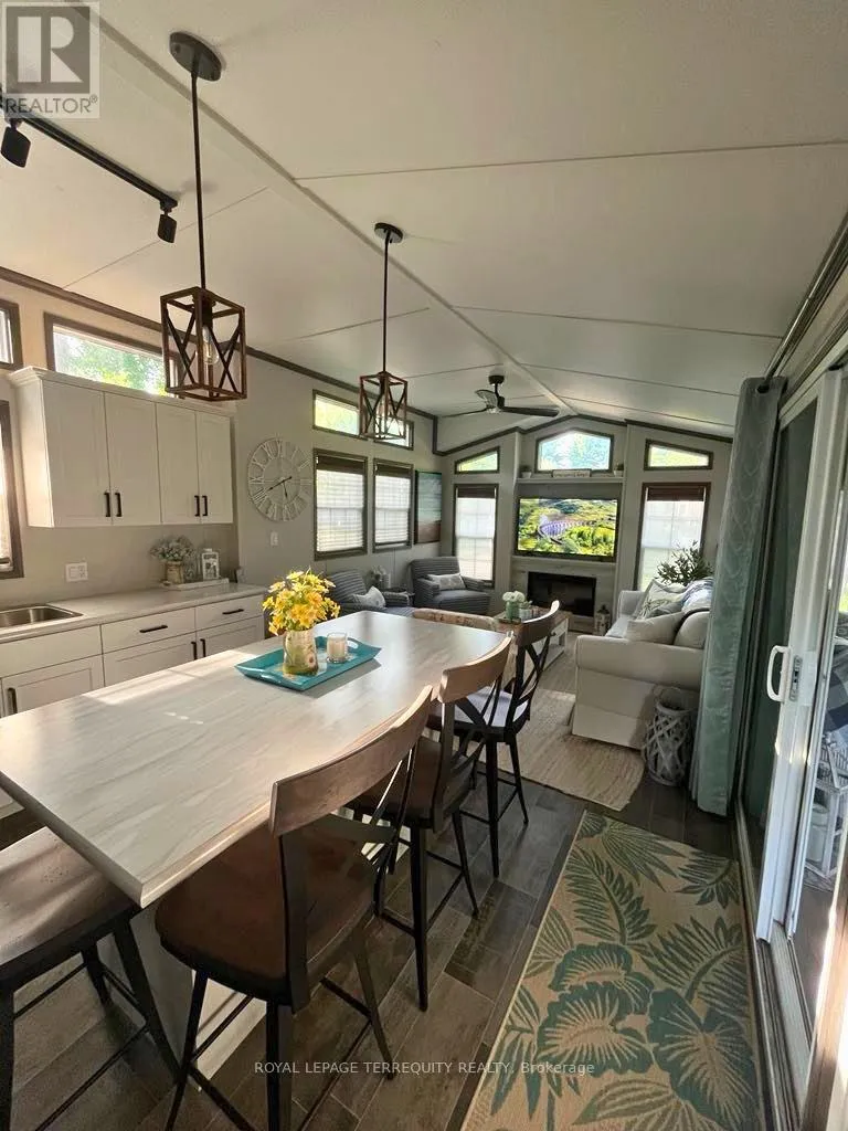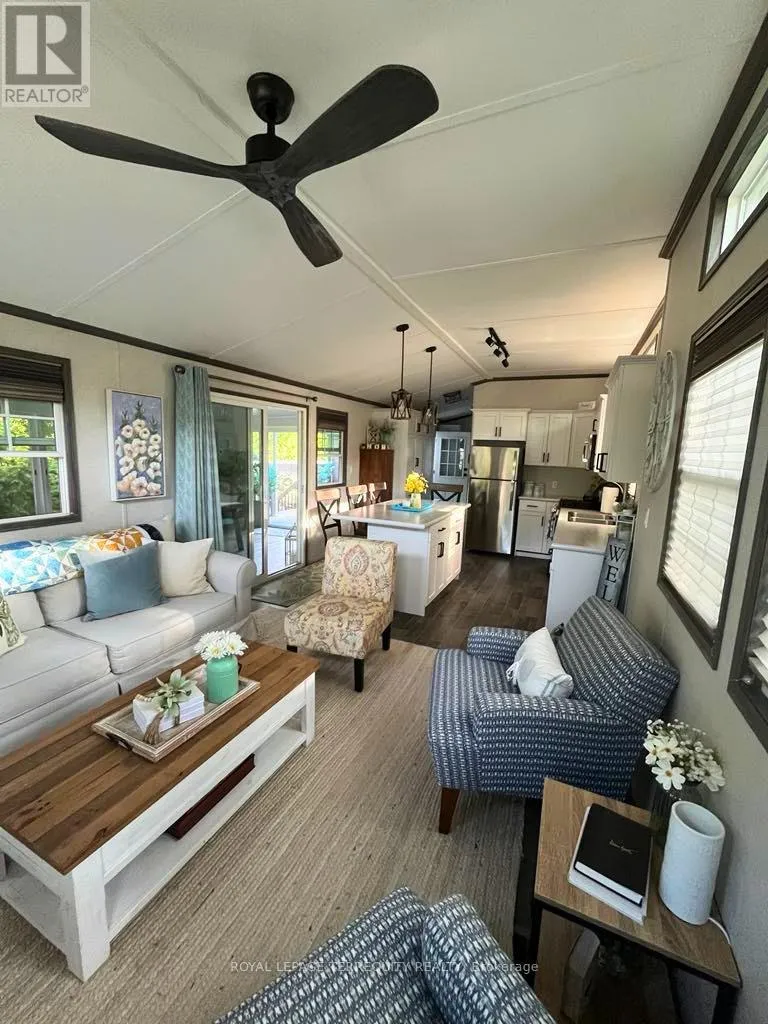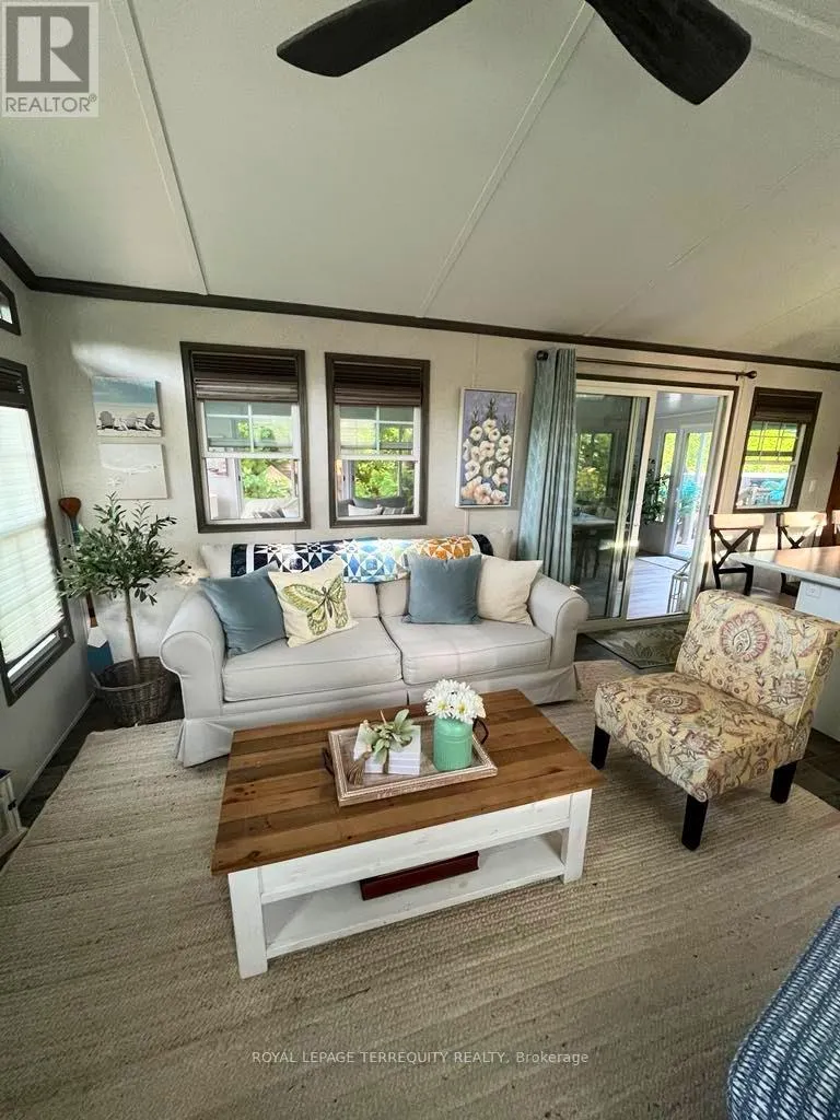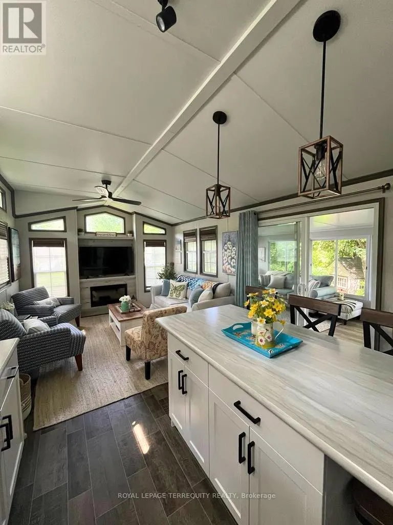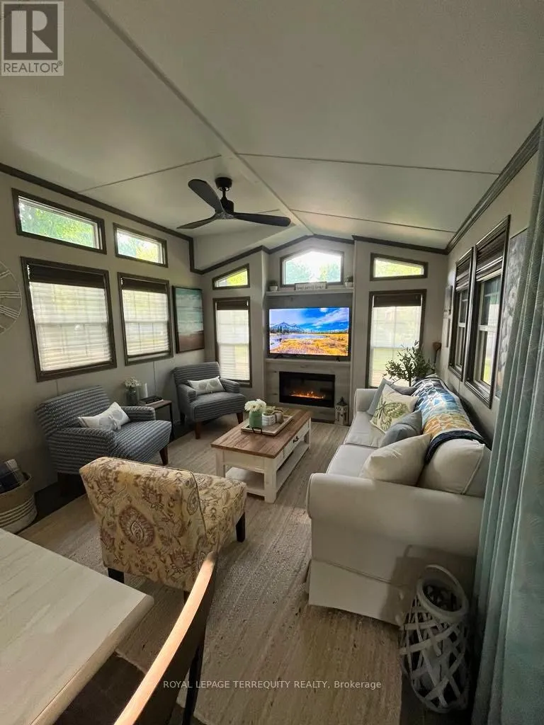 Turnkey 2-bedroom seasonal retreat on a premium private ravine-backed lot in the highly sought-after Pioneer Point community, offering the perfect balance of privacy and vibrant resort living. This impeccably maintained 2019 General Coach Manchester model includes a bright 23′ x 11′ sunroom addition, stainless steel appliances (2024), modern lighting, Moen and Kohler fixtures, and stylish high-end furnishings throughout. The outdoor