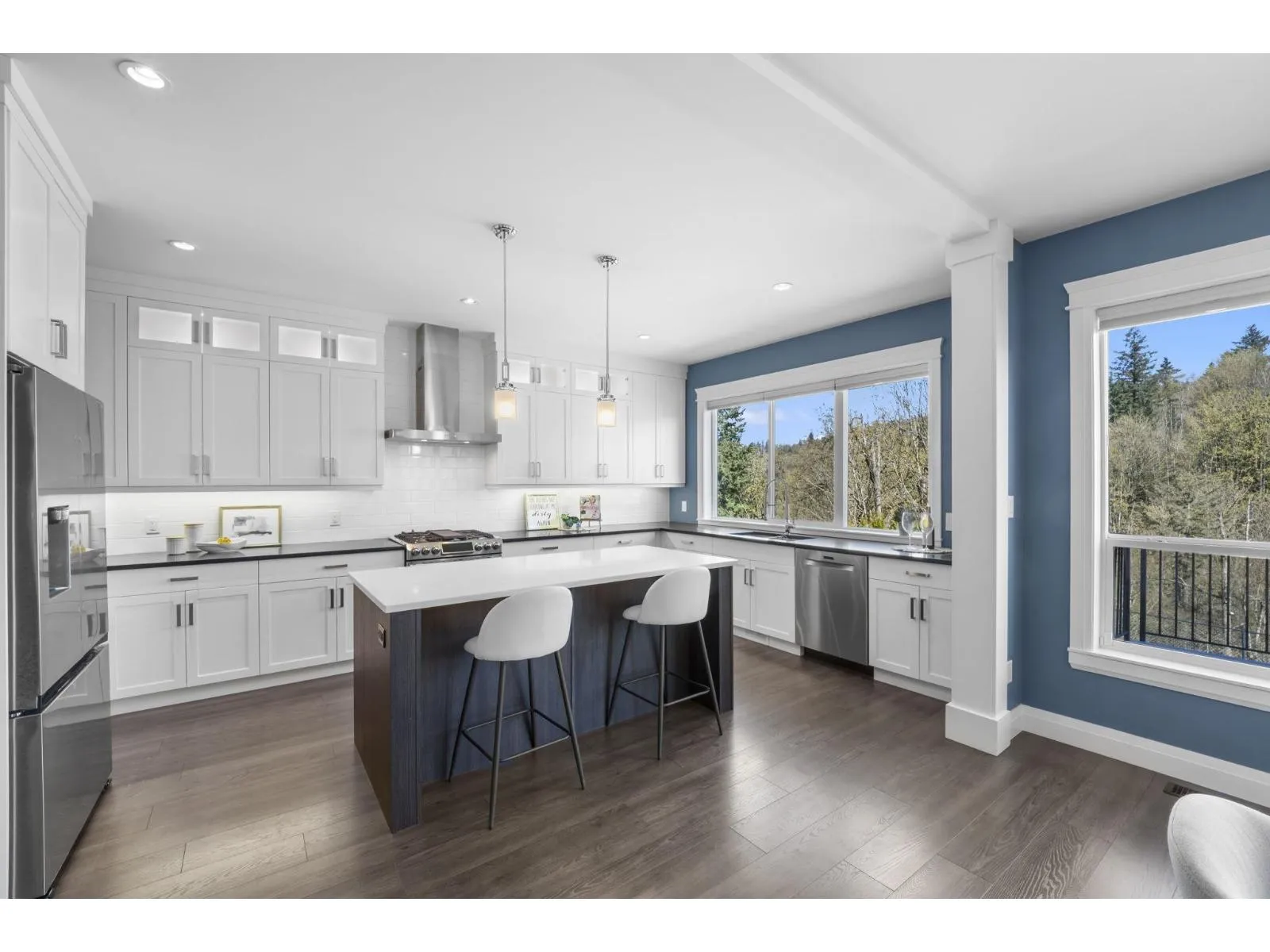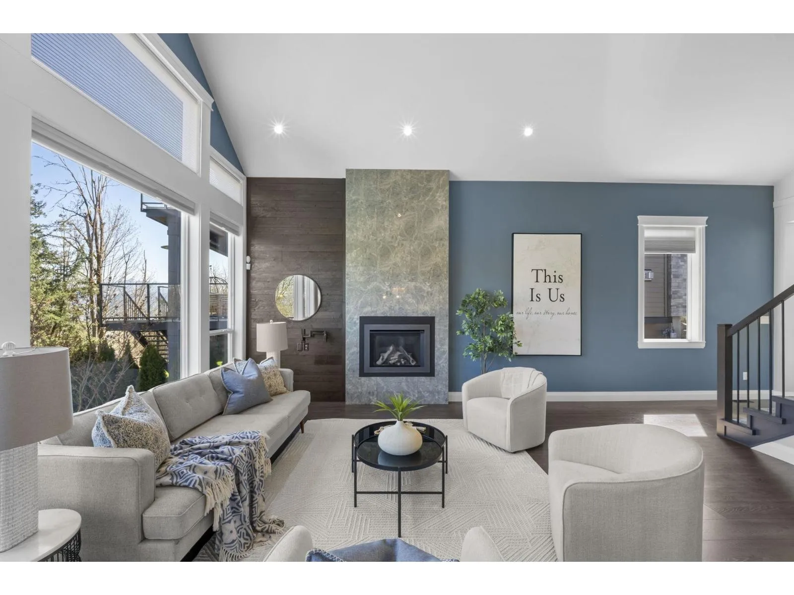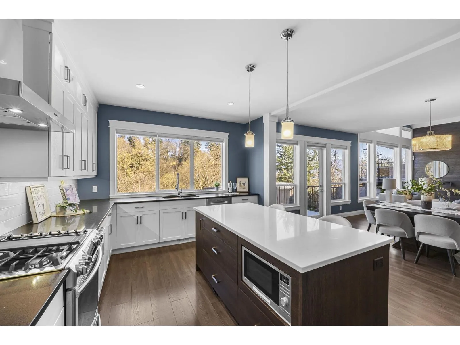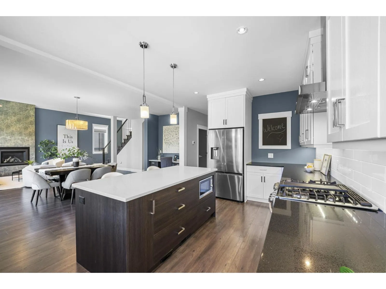 This stunning home offers 5 bedrooms + den and 4 bathrooms across two storeys with a fully finished walkout basement. Step into a bright and spacious main floor featuring soaring vaulted ceilings with a tiled gas fireplace. The chef-inspired kitchen is perfect for entertaining, showcasing a huge island, quartz countertops, tiled backsplash, S/S appliances with a gas range, plus the
