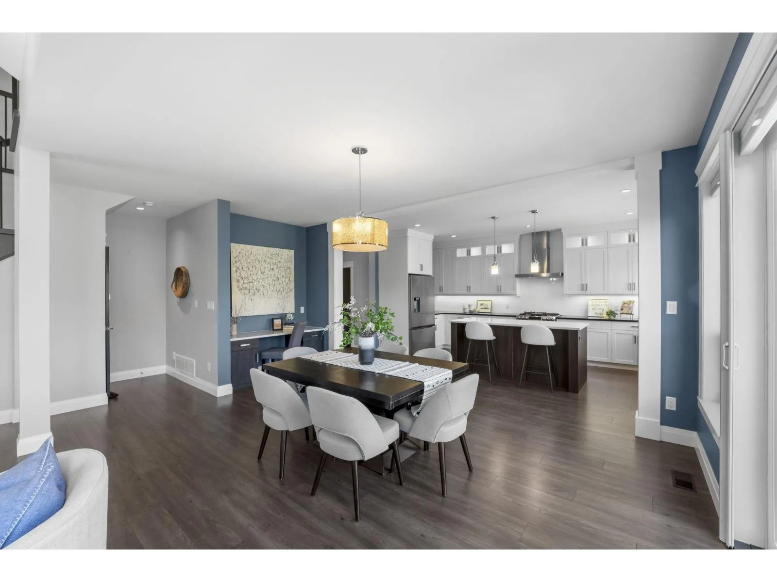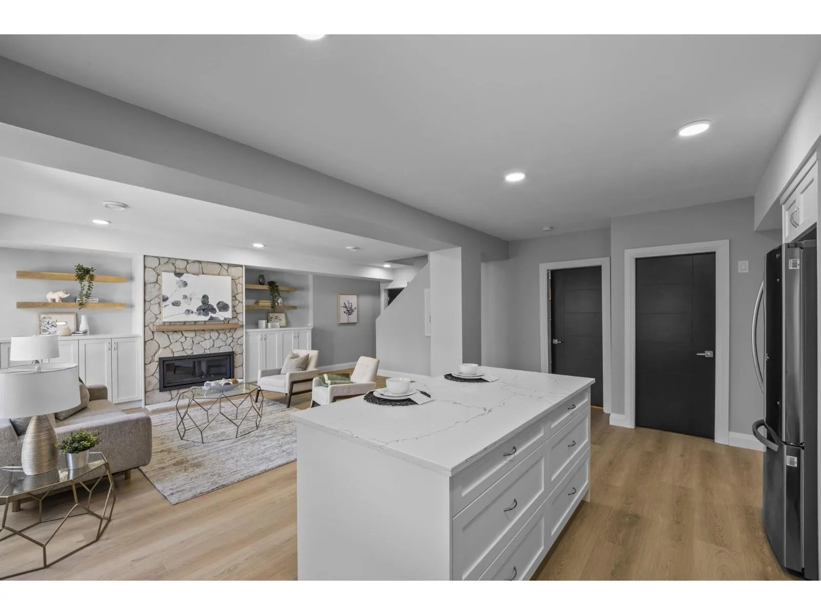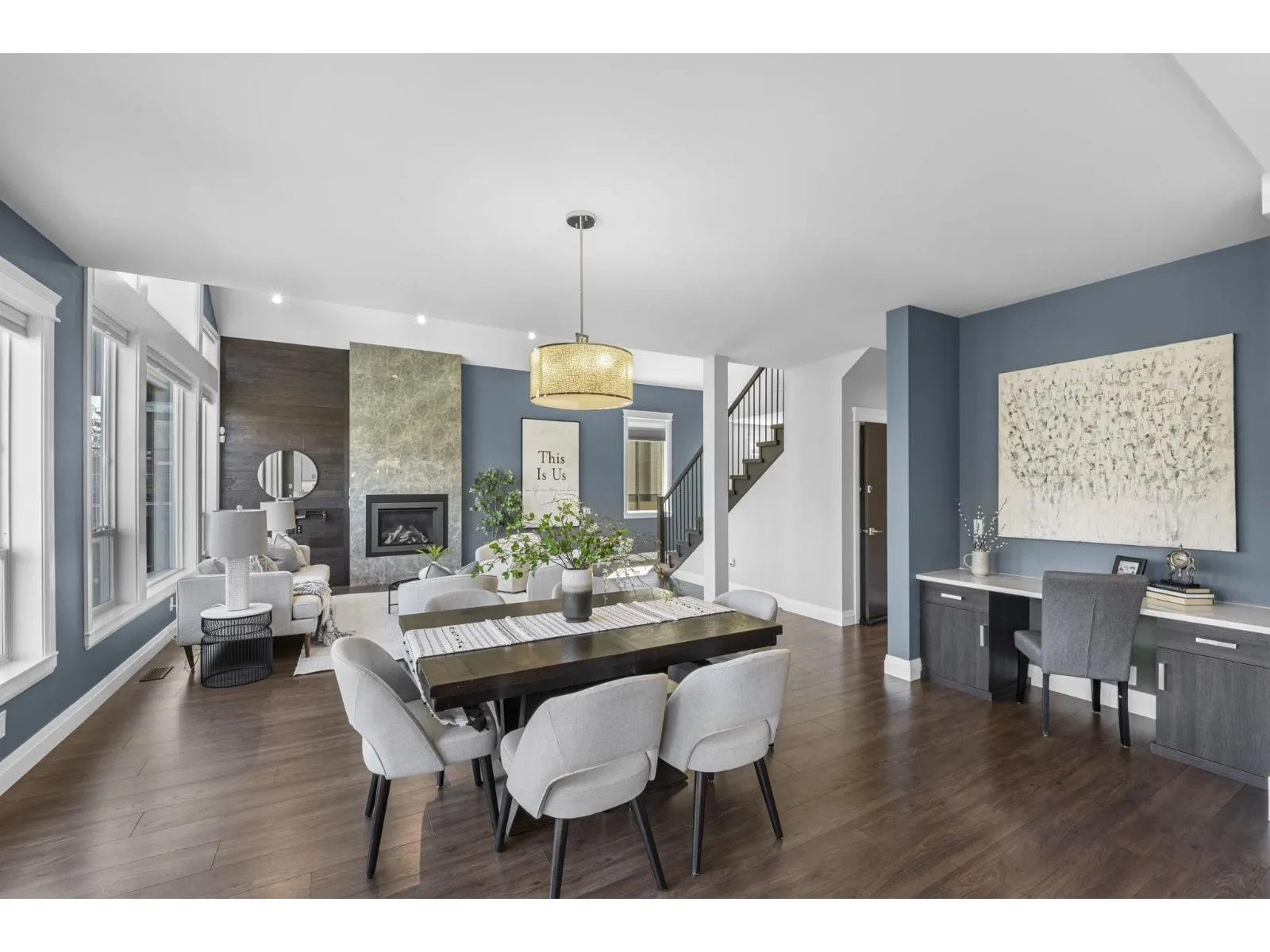 This stunning home offers 5 bedrooms + den and 4 bathrooms across two storeys with a fully finished walkout basement. Step into a bright and spacious main floor featuring soaring vaulted ceilings with a tiled gas fireplace. The chef-inspired kitchen is perfect for entertaining, showcasing a huge island, quartz countertops, tiled backsplash, S/S appliances with a gas range, plus the