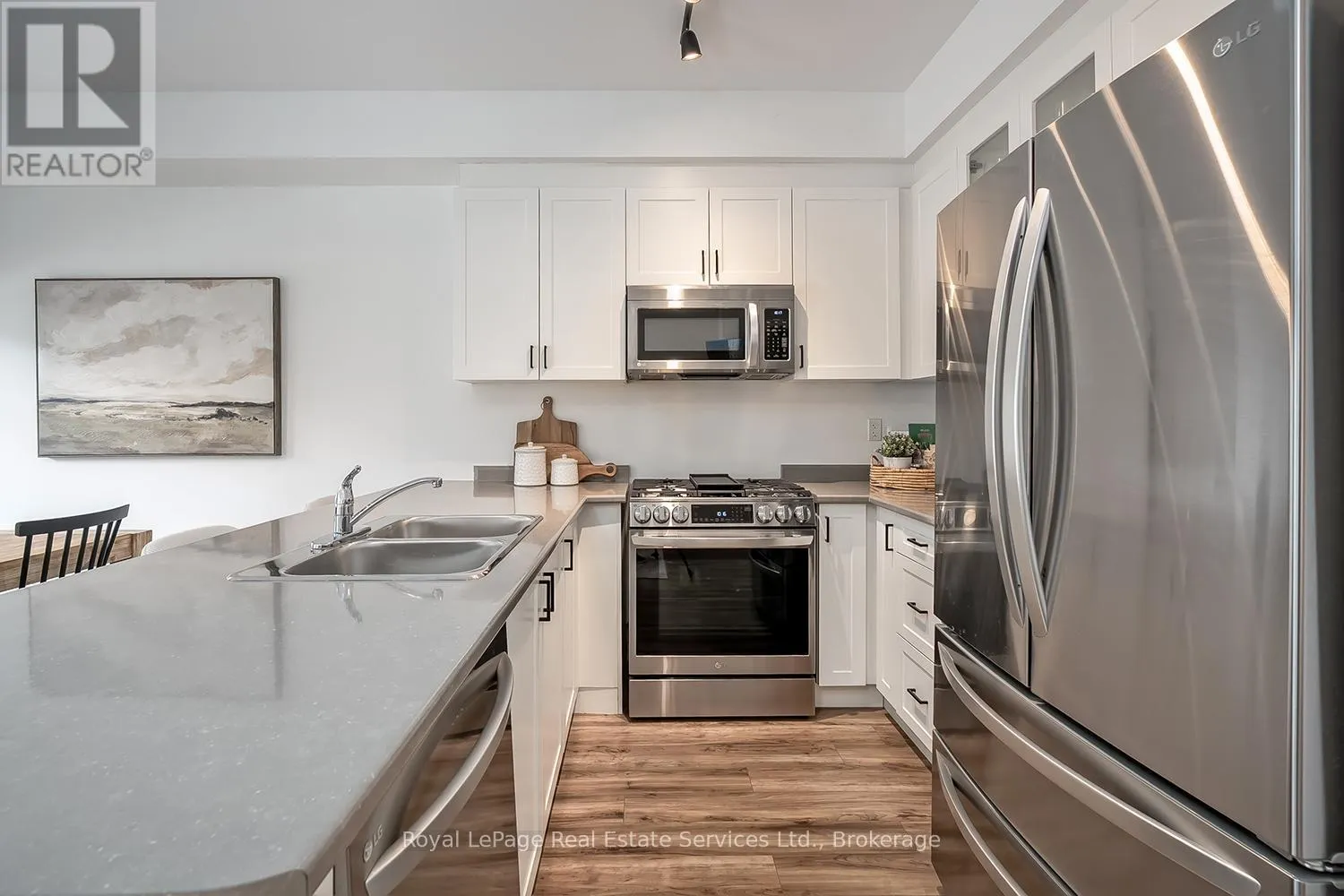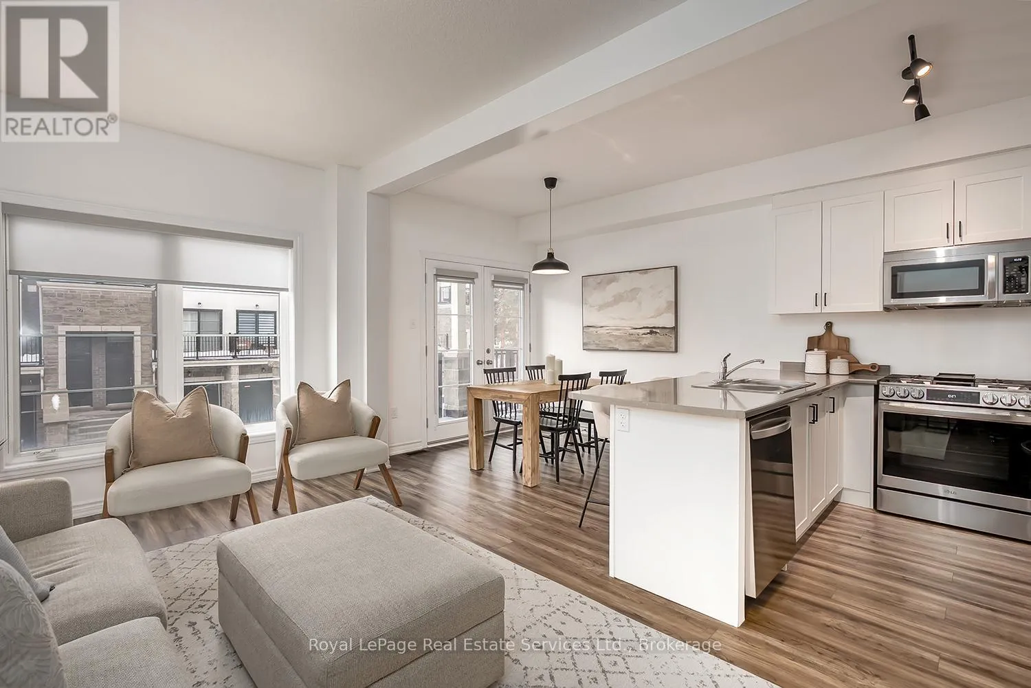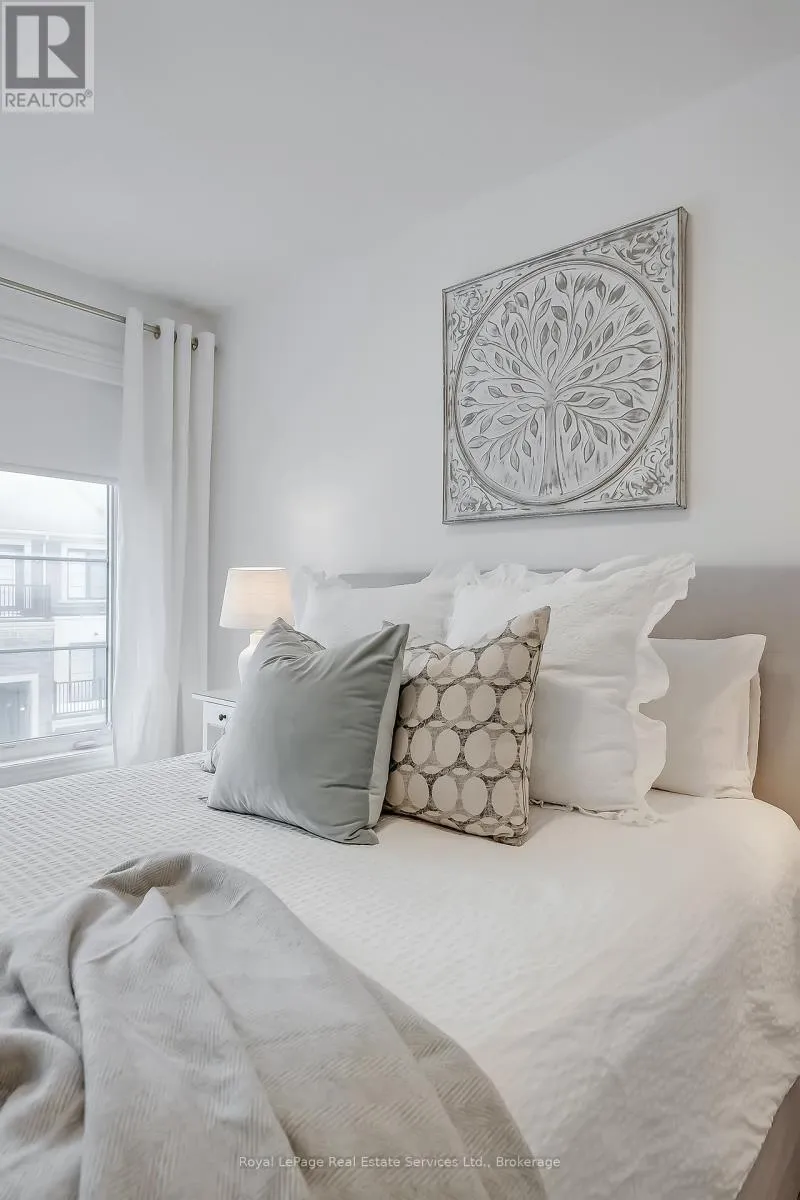 Stylish + Contemporary 3 Storey Townhome in the heart of charming Waterdown! Impeccably Maintained 2 Bedroom, 2.5 Bathroom Boasts over1300 sq ft. This home is a perfect combination of style, functionality + convenience. Large foyer with double door closet, utility room + insideaccess from garage. The main living space features a spacious living area, separate dining area w direct access