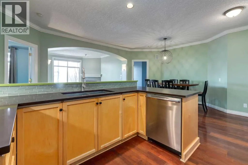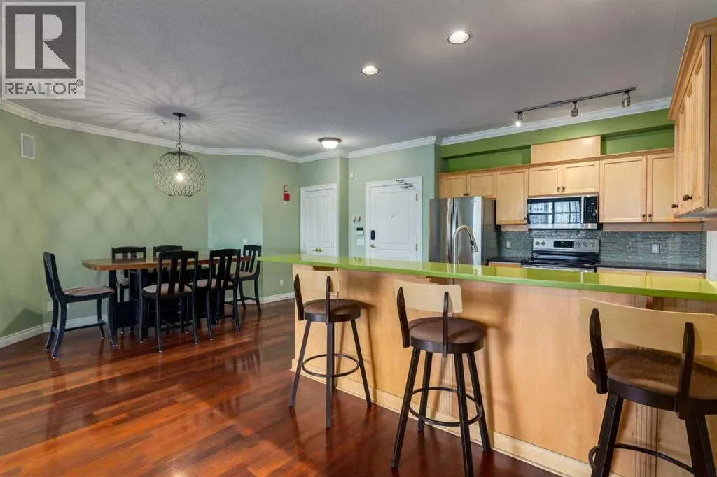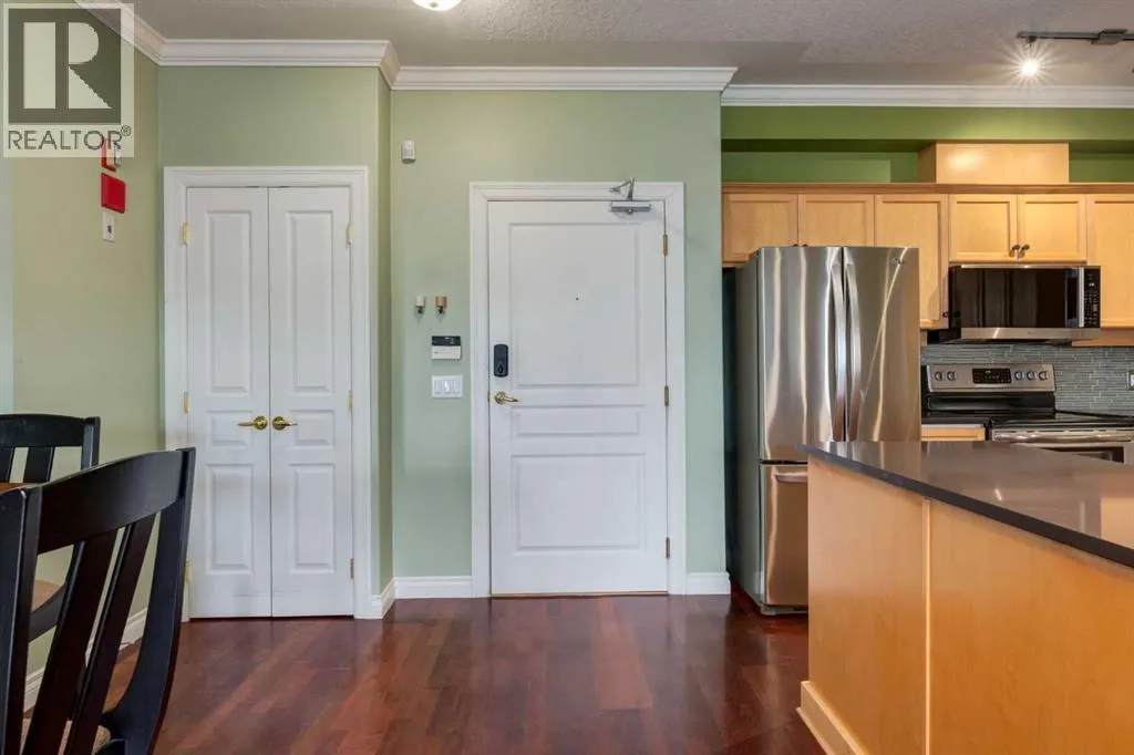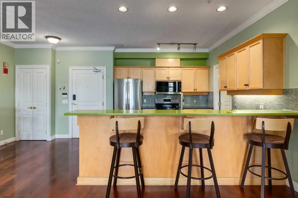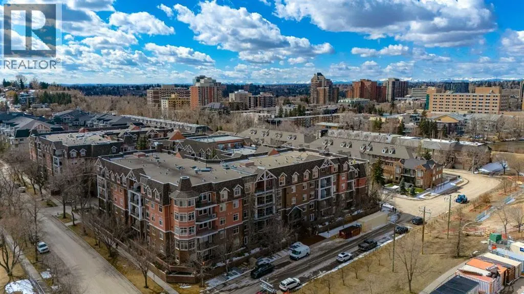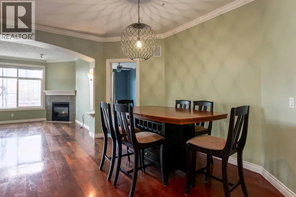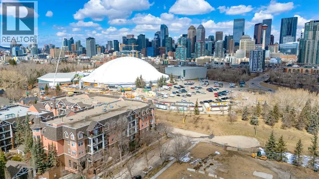 Welcome Home! Enjoy exceptional panoramic views of downtown Calgary from this stunning and stately third-floor condo, offering over 1,000 square feet of thoughtfully designed living space. Relax and unwind in the bright, open-concept living area featuring a cozy natural gas fireplace. Step outside to your private deck, which has a natural gas hookup perfect for year-round BBQing and entertaining. The