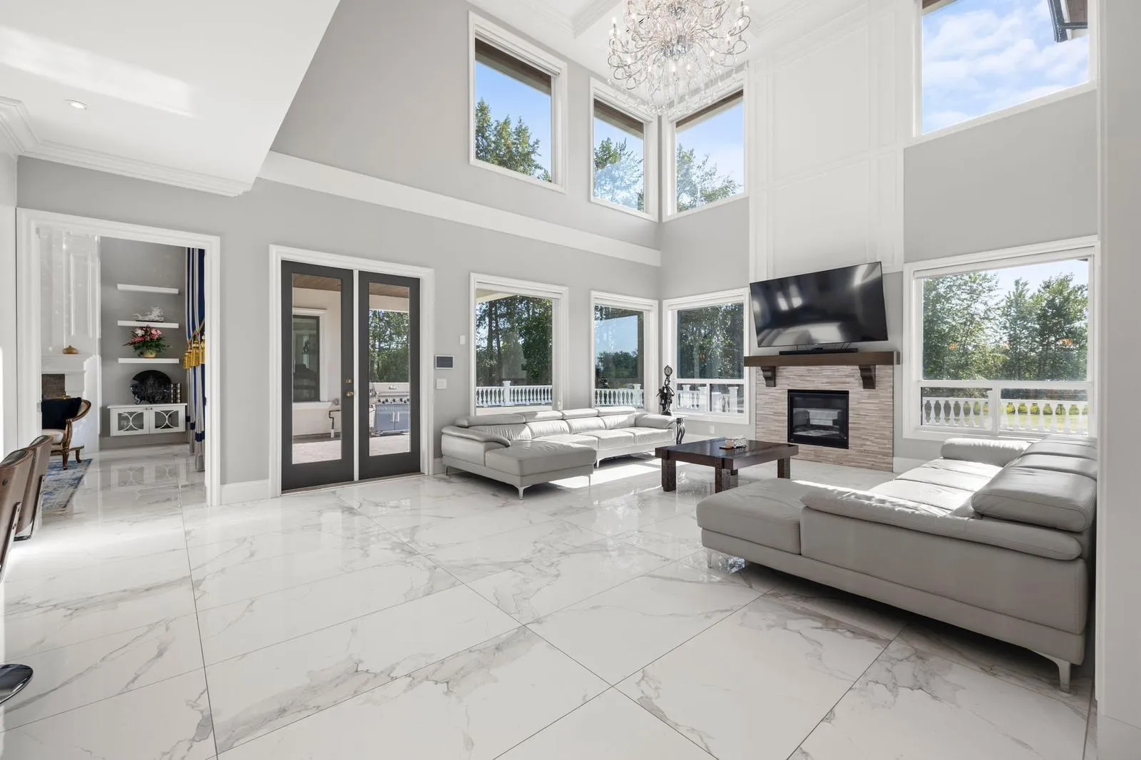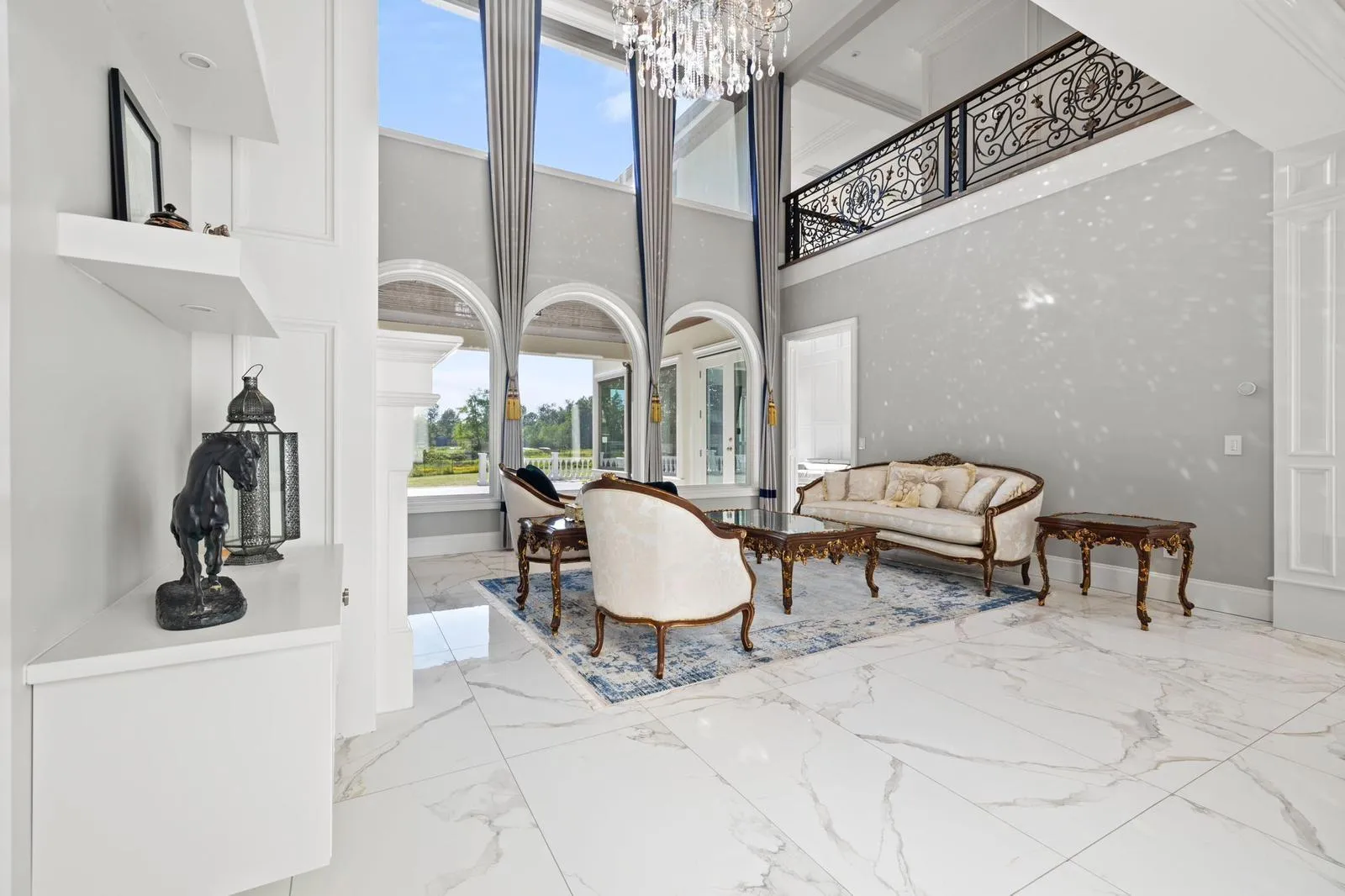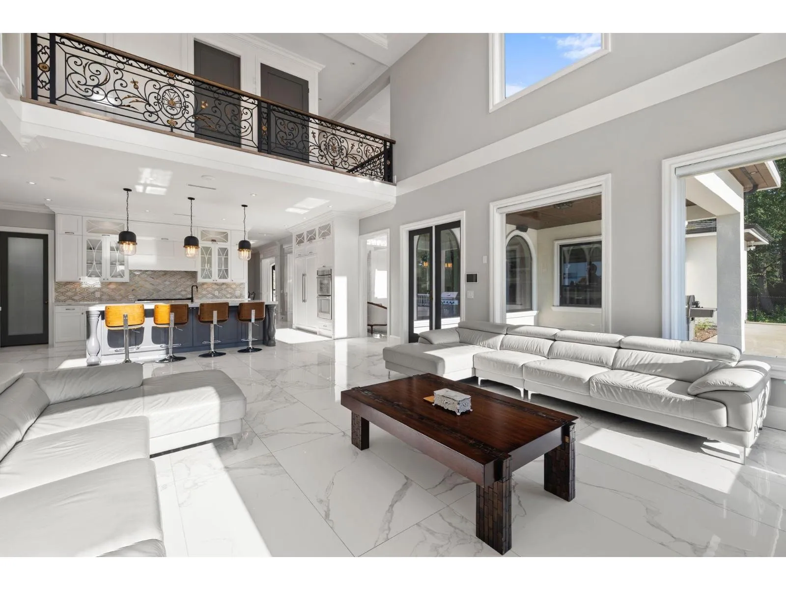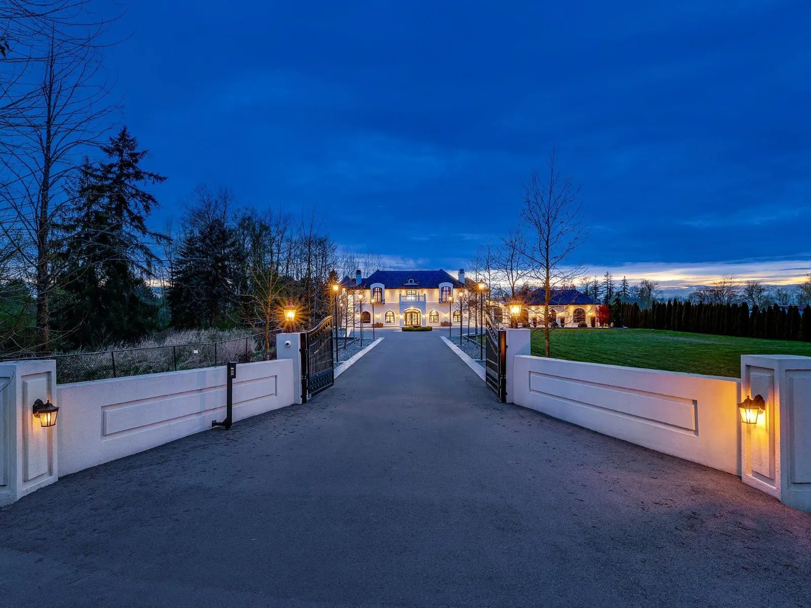 Exceptional Mediterranean-inspired estate set on 4.34 acres of private, park-like grounds. A long, gated driveway leads to this impressive 2-level residence, featuring a rare 5-car garage and a thoughtfully designed layout with two primary suites-one on each level. The home offers double-height ceilings in both the grand living and family rooms, creating a sense of space and elegance, along with