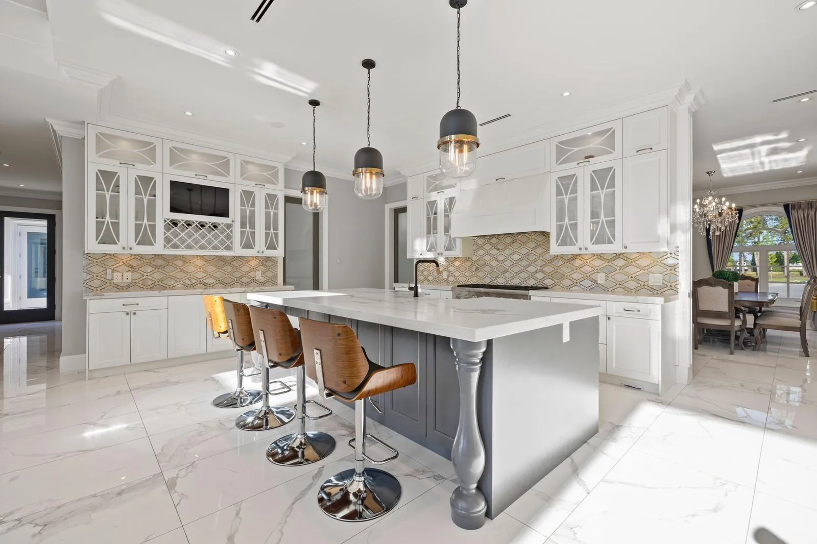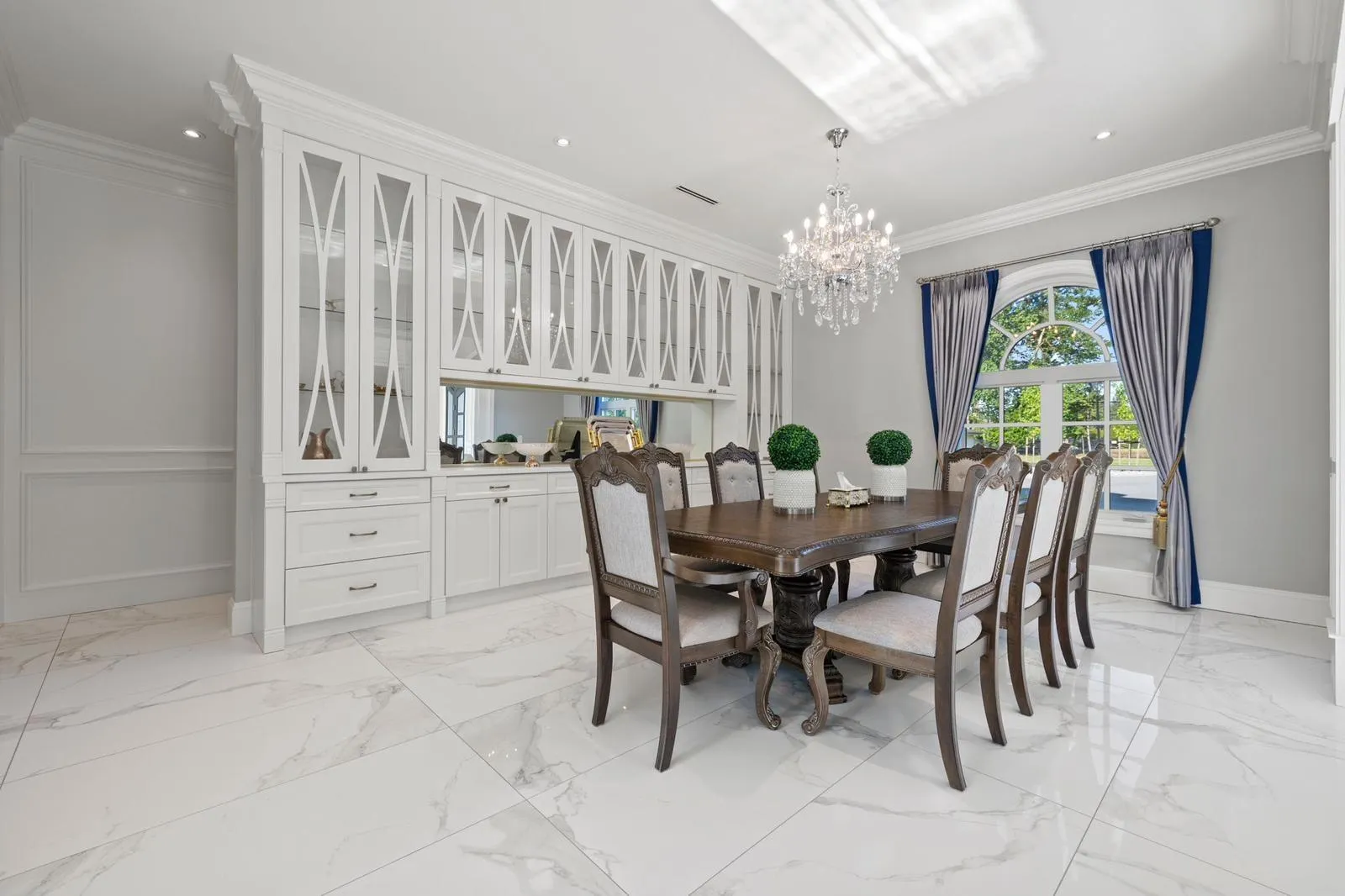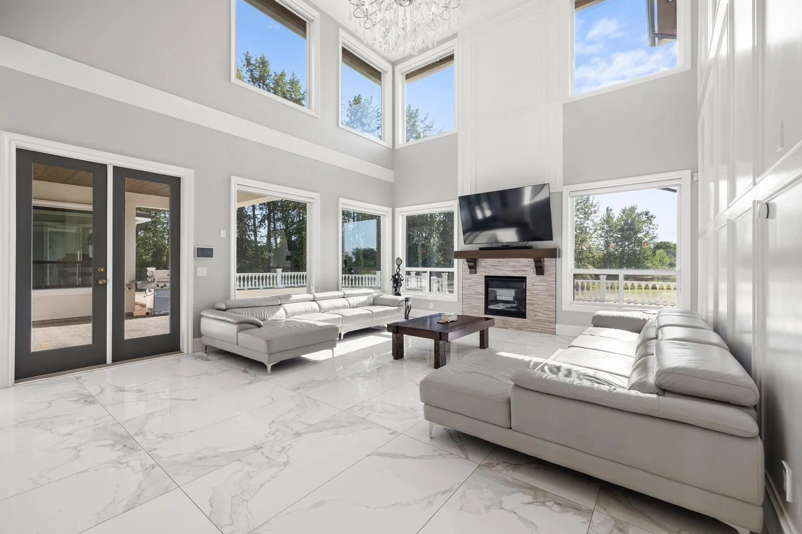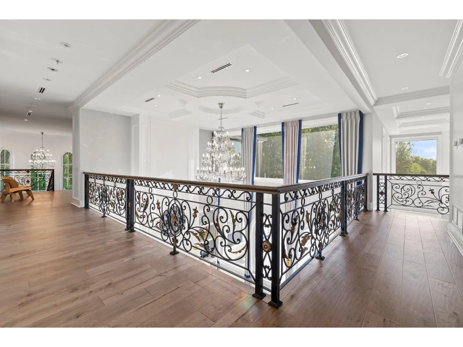 Exceptional Mediterranean-inspired estate set on 4.34 acres of private, park-like grounds. A long, gated driveway leads to this impressive 2-level residence, featuring a rare 5-car garage and a thoughtfully designed layout with two primary suites-one on each level. The home offers double-height ceilings in both the grand living and family rooms, creating a sense of space and elegance, along with