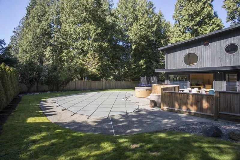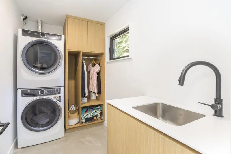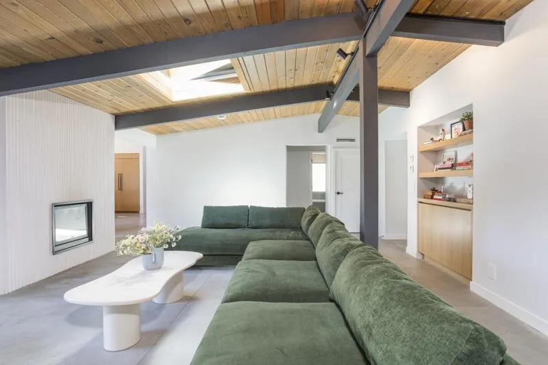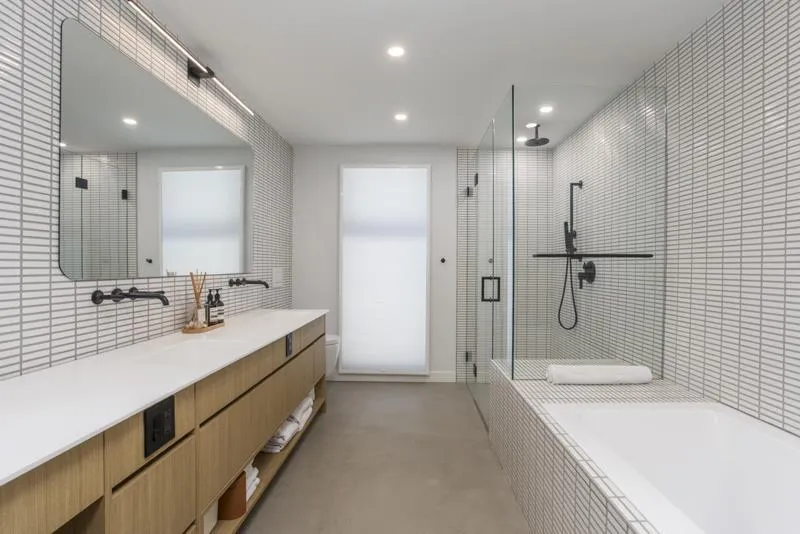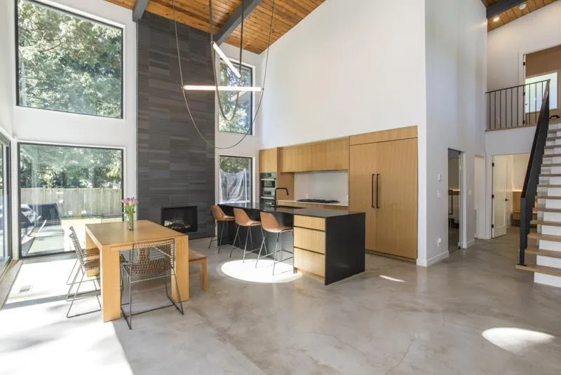 West Coast Contemporary residence, thoughtfully reimagined with a seamless blend of modern design and timeless craftsmanship. Heated concrete floors and a wood-burning fireplace create a warm, refined interior. The kitchen features white quartz countertops, a matte black granite island, custom oak cabinetry, and premium Fisher & Paykel and Bosch appliances, complemented by an exquisite sculptural FLOS lighting. Italian Mutina tile