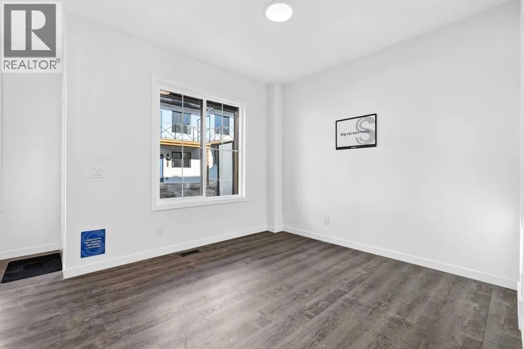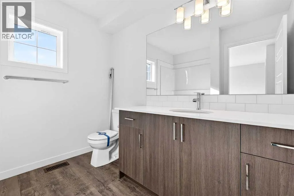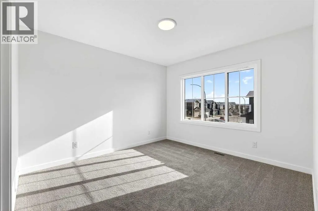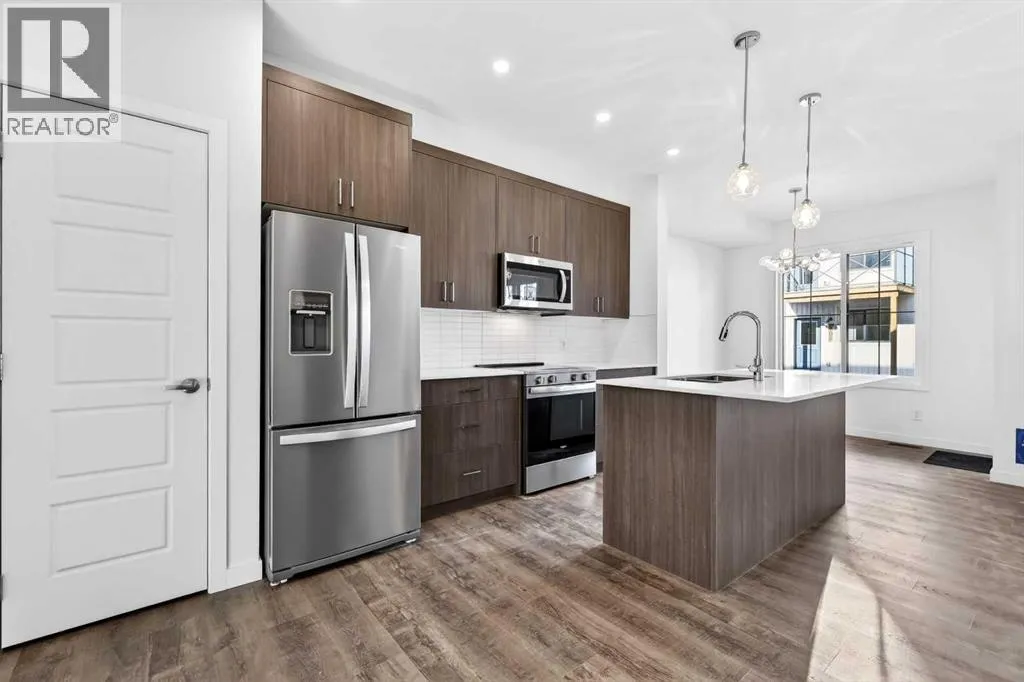 quiet moments are part of everyday life. With nearby amenities, shopping, and convenient access to major routes, residents enjoy the perfect balance of natural surroundings and city connectivity. Proximity to Sirocco Golf Club further enhances the open, green feel of this growing community.This fully finished two-storey townhome offers exceptional flexibility with four bedrooms and four bathrooms across three levels of developed living space. The main floor features a bright open-concept layout connecting the kitchen, dining area, and living room, creating a comfortable space for both everyday living and entertaining. The kitchen is beautifully finished with modern slab-style cabinetry featuring 42” upper cabinets, a full bank of drawers, soft-close doors, polished white quartz countertops, tile backsplash, stainless steel Whirlpool appliances, and a polished chrome Moen high-arc faucet with pull-down sprayer. Luxury vinyl plank flooring runs throughout the main living areas, bathrooms, and laundry room, while contemporary lighting selected by professional designers completes the modern interior.Upstairs, you’ll find three bedrooms including a spacious primary suite with a private full ensuite. An additional full bathroom and the convenience of upper-floor laundry enhance the functionality of the upper level.The fully finished lower level expands the home’s versatility with a fourth bedroom, full bathroom, and family room — ideal for guests, teenagers, a home office, or additional living space.Additional features include a single attached garage with opener, driveway and an additional titled parking stall, high-efficiency gas furnace, digital thermostat, 50-gallon electric hot water tank, energy-efficient dual-pane windows with low-E coating, sound attenuation system for increased privacy between units, and a natural gas BBQ line on the patio or balcony. Durable exterior cladding with vinyl siding and fibre cement panels, along with lifetime limited warranty roof shingles, ensures long-term performance and curb appeal.Offering modern construction, thoughtful design, and a location centered around green space and lifestyle, this home represents an outstanding opportunity to own a brand-new property in one of Calgary’s emerging south communities. (id:64429)