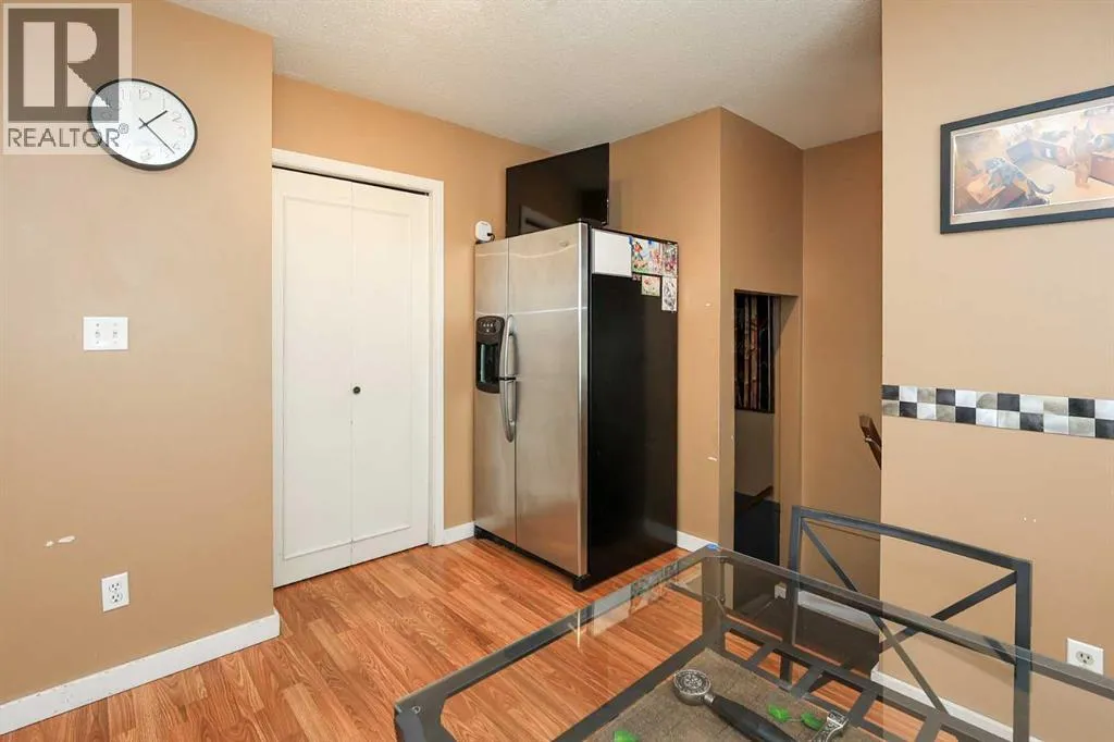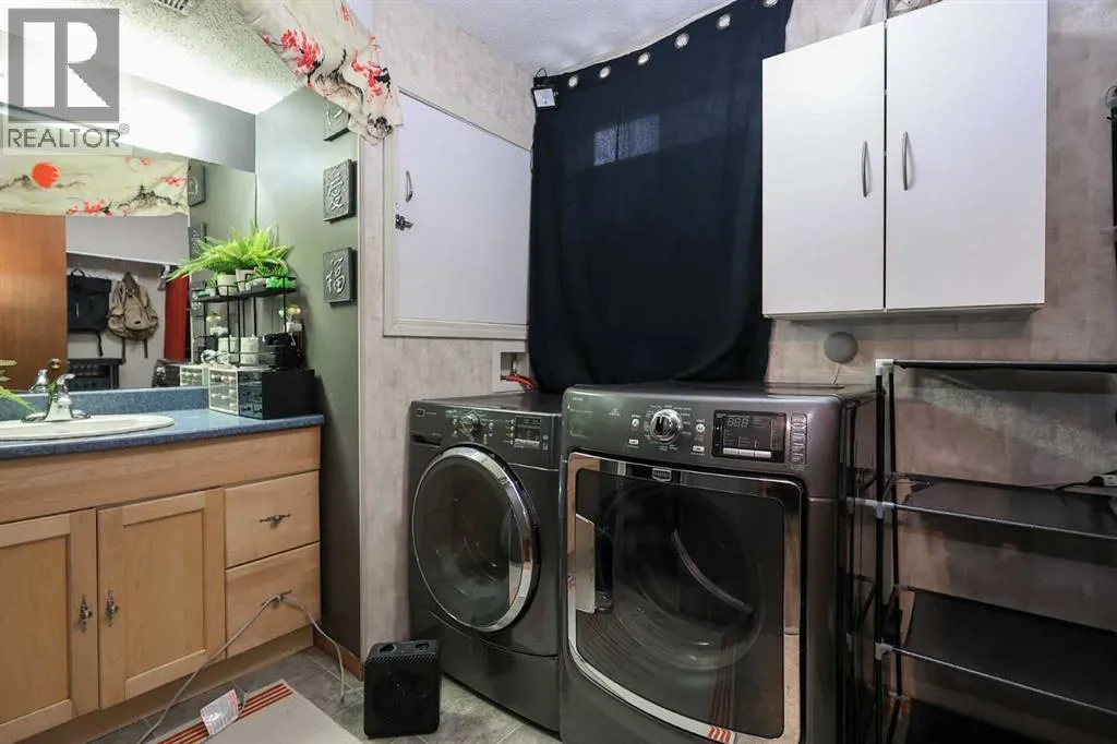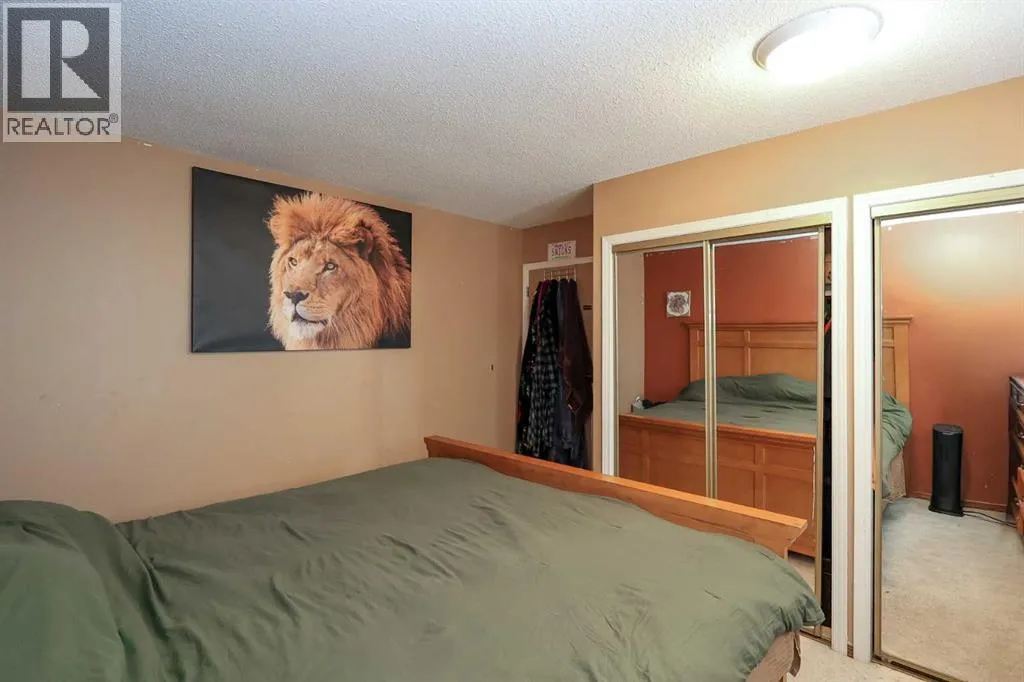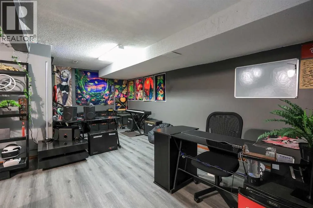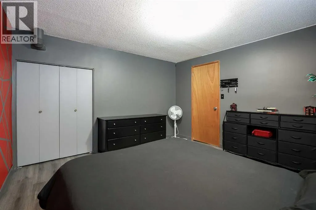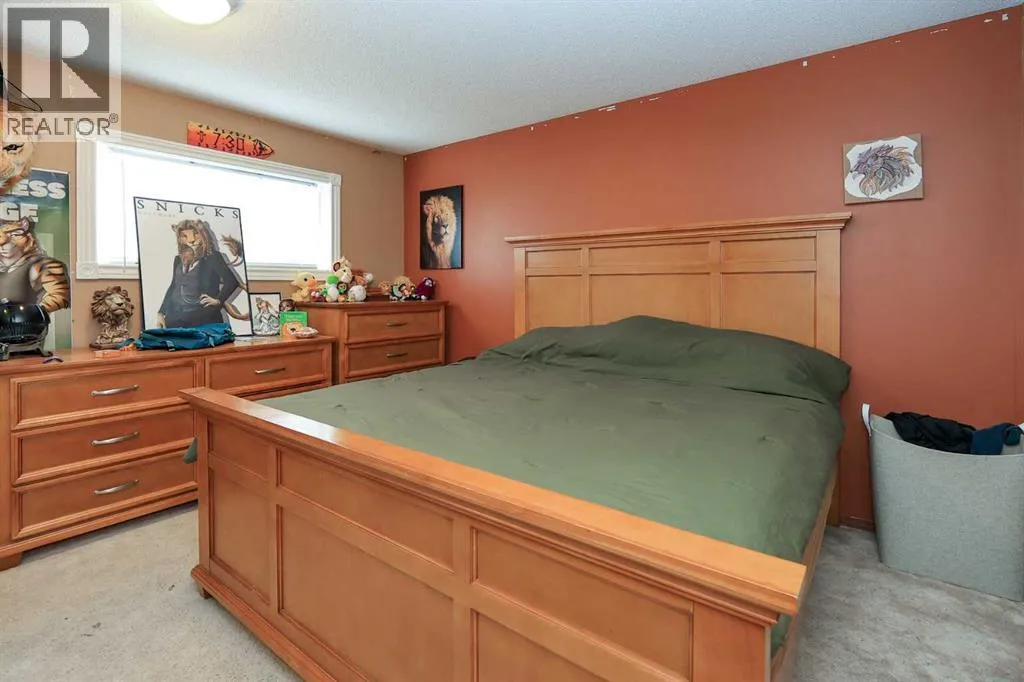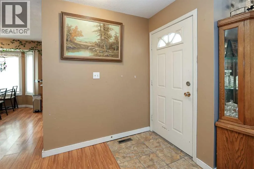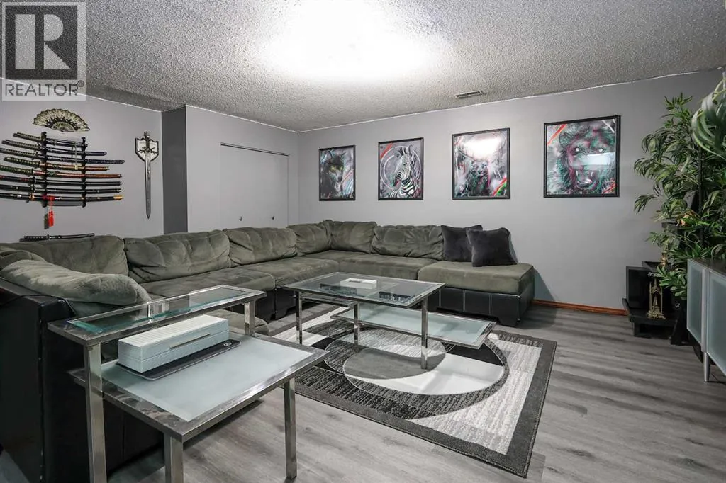 FULLY DEVELOPED BUNGALOW ~ 4 BEDROOMS, 2 BATHROOMS ~ DOUBLE DETACHED GARAGE ~ Mature landscaping and a stucco exterior offer eye catching curb appeal ~ Covered entry leads to a foyer with tile flooring ~ The living room features a large south facing window that overlooks the front yard and features a cozy wood burning fireplace with stacked stone and