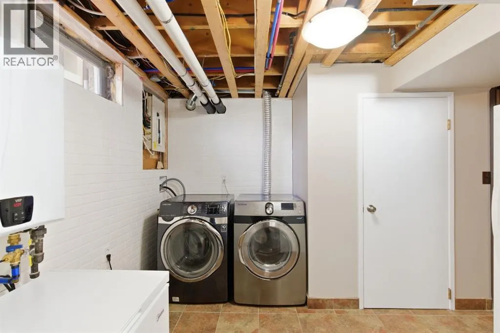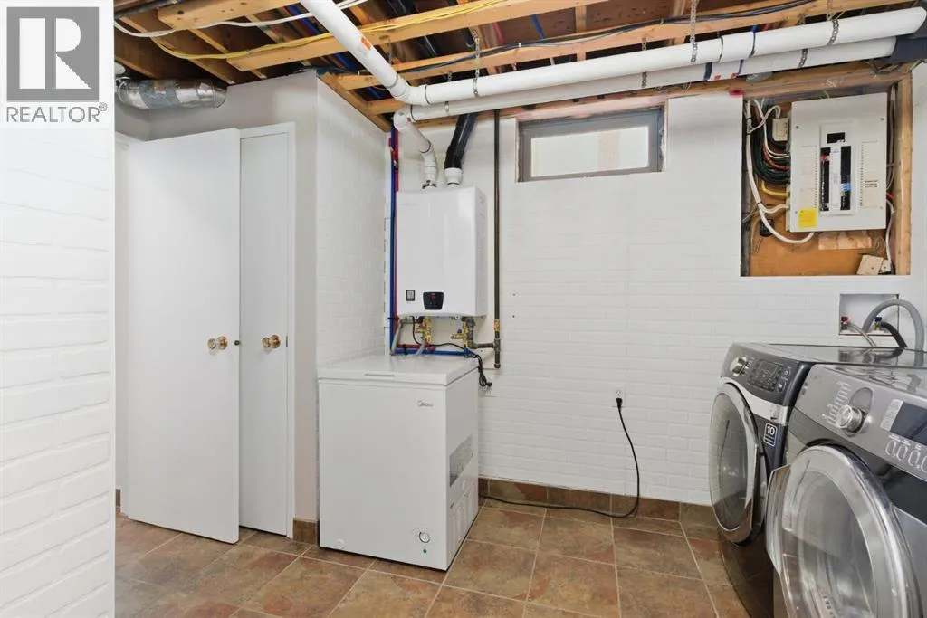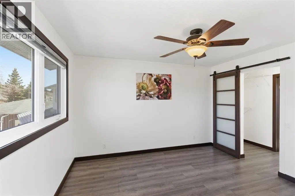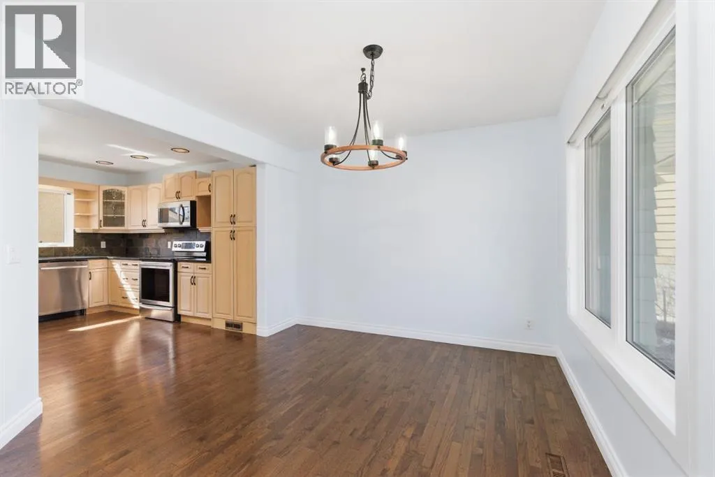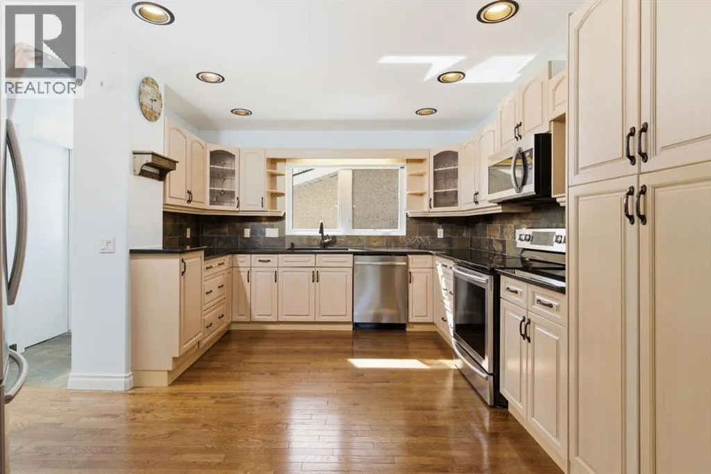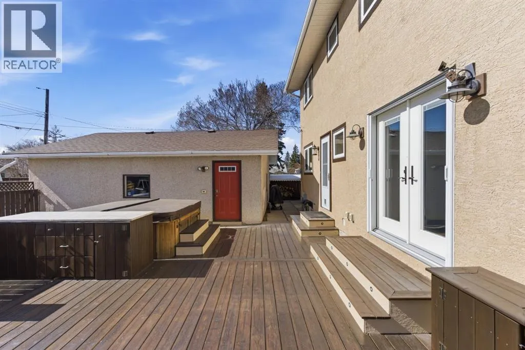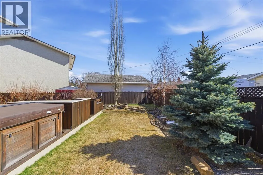 parking. The second is an oversized double (25’ x 28’), heated, detached garage accessed from the paved alley, and has a finished interior which includes shelving, cabinets, and a workbench and is wired for 220 volts. Three bedrooms, 3.5 baths and 2,250 sq. ft. of living space on three levels. Upon entering the tiled foyer, the natural light flowing in from the upgraded triple pane windows on all sides is remarkable. Motorized window blinds allow you to control the light factor. The main floor is comprised of living room, dining room and kitchen and has warm hard wood floors throughout. To the left is the living room with woodburning, stone surround fireplace and enough space to experiment with various furniture configurations. The rear deck is accessed via French doors in the living room. To the right of the foyer is the dining room with ample room for entertainment and is adjacent to the kitchen. Cream cabinetry and plenty of it in the kitchen is a beautiful contrast to the dark granite countertops and tiled backsplash. Gleaming stainless appliances and a pantry add to the efficiency. A 2-pc. bath completes the main level. Moving upstairs, there is a combination of hardwood and laminate flooring. The primary bedroom is large and sunny with the benefit of a newly added walk-through closet and 4-pc. ensuite (double vanity). Two additional bedrooms, both with generous-sized closets, share a 4-pc. bath. The basement has been attractively finished and features a large, carpeted rec room with a second woodburning fireplace (both fireplaces passed WETT inspecti on in 2023). Across from the rec room is a tiled home office and tucked back of that is the laundry room with upgraded plumbing, venting and wiring; storage area and an upgraded 3-pc. bath. The house, attached garage and detached garage all have well-insulated (R40) attics. In 2023 the furnace was upgraded to a high-efficiency model with smart thermostat, a tankless water heater was installed and the humidifier was replaced. Both front and back yards are landscaped with lawn and mature trees. The back yard is fenced and has sprinklers installed. A bonus is your own hot tub. Well situated and close to Stoney, Deerfoot and Macleod Trails and Anderson Road. Proximity to shops and restaurants on both Macleod Trail and 130th Avenue; the Bow River; numerous schools (public and Catholic); churches; playgrounds; dog parks; Fish Creek Provincial Park and South Health Campus. This home has obviously been well tended as evidenced by the many upgrades and enhancements. Don’t miss out on this outstanding opportunity. (id:64429)