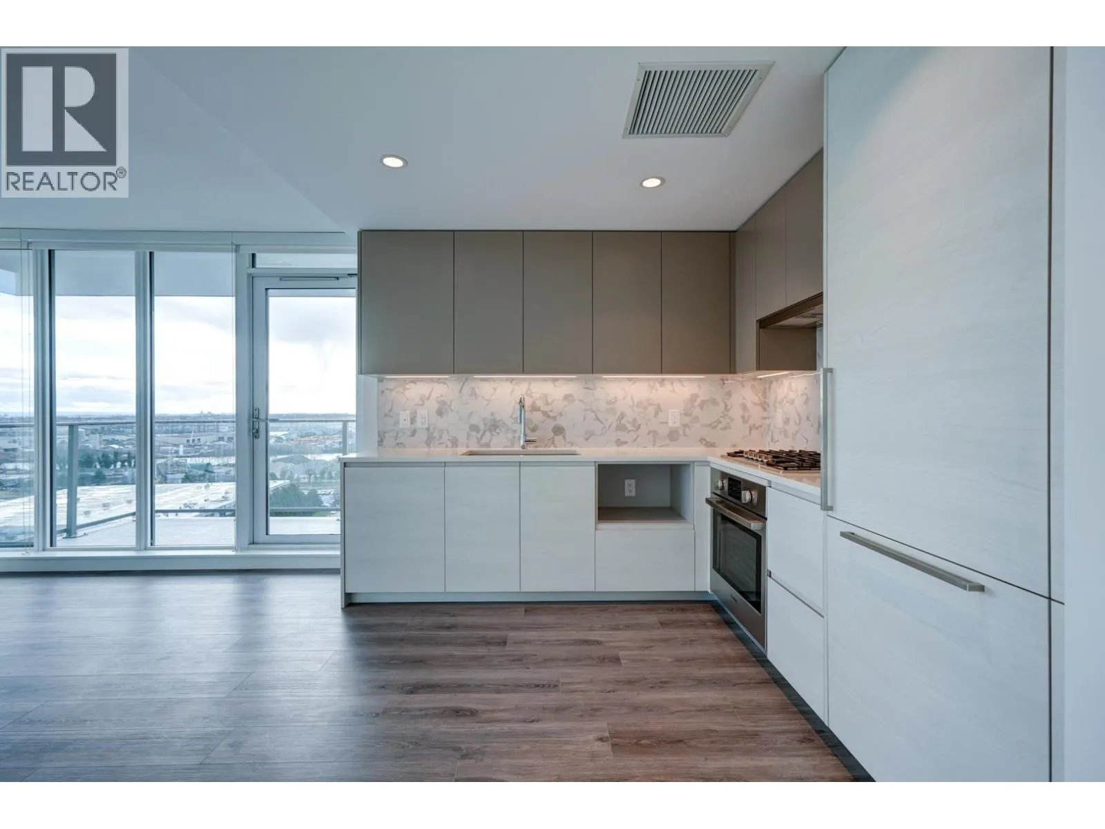 “FRASER COMMONS” by Serracan. HIGH on 15th Floor this 2 BD, 2 BATH & BALCONY, “END” unit features sweeping Panoramic Views of Fraser River and MT. Baker. Air/Con., DELUXE Kitchen with Premium BOSCH Stainless Steel Appliance Package, Gas range-top, B/I Custom Panel bottom-Freezer Refrigerator, Integrated D/W, European Armony Cabinetry, MARBLE Inspired Backsplash and Quartz Countertops. EXCLUSIVE Amenity: Roof Top Terrace