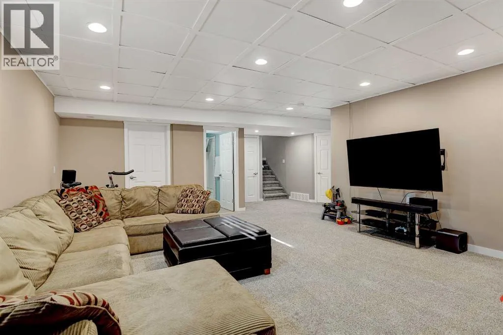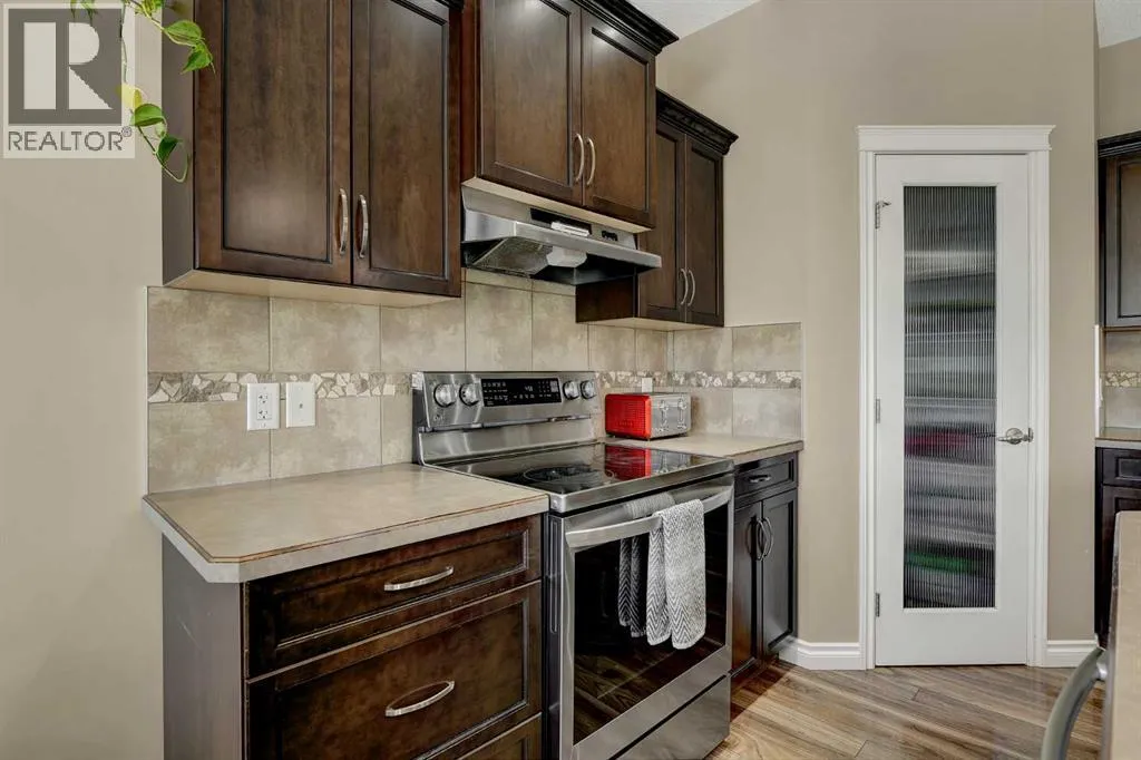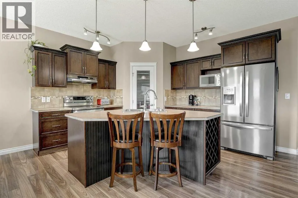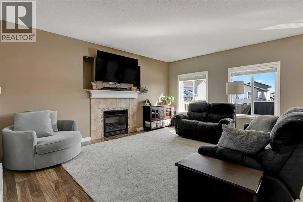 Welcome to Royal Oaks!This beautifully designed open concept two-storey home is sure to impress from the moment you walk in. The main floor features a spacious living room complete with a cozy gas fireplace, flowing seamlessly into the kitchen with a breakfast bar island and rich dark cabinetry. The south facing windows fill the kitchen and living room with ample