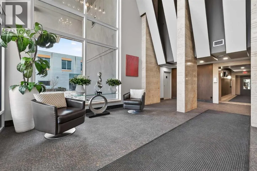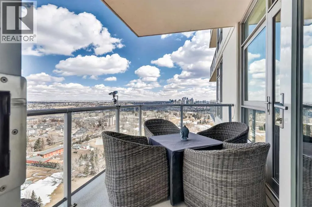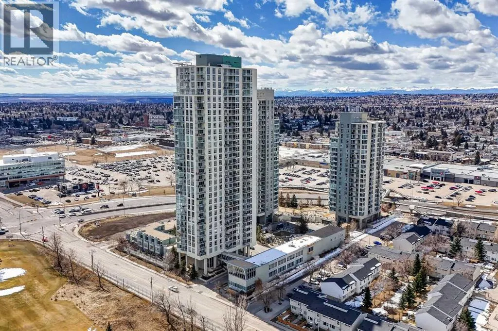Welcome to Ovation Tower, a pristine “condo in the sky” that offers breathtaking panoramic views of the Rocky Mountains and downtown Calgary. This bright residence features a large open kitchen with exceptional storage and granite countertops, leading into a spacious living area with nine-foot ceilings, a fireplace, and air conditioning. The thoughtful layout includes a dedicated den for a home