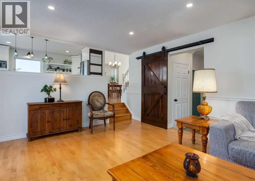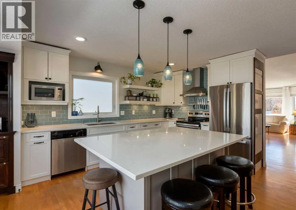 efficiency furnace with UV filter, triple pane windows, a stucco exterior, newer fence, cedar deck with gas BBQ line, a low maintenance professionally landscaped front yard. The overhead garage door is insulated, the garage is insulated & drywalled, and the front driveway is extra long to welcome friends and family. Inside is a great floor plan with refinishable hardwood floors through out the main level, fresh paint & updated lighting. The front living room is flooded with natural light accentuated by the vaulted ceiling and is open to the generous dining space. The fully renovated kitchen is chic, functional and modern with loads of cabinets, pots & pan drawers, a center island with seating, quarts counter tops, and glass back splash all adorned by tasteful custom built in artisan cabinetry bringing character to an already great space. Cozy up to the fireplace as you step down to the large family room with space for the whole family. The Stately barn door slides to reveal a convenient main floor laundry room with awesome build in storage that discreetly leads to a 2 pc powder room. The interior garage entry with separate coat closet and access to the basement resides here too. Upstairs is a generous primary bedroom with a full wall closet complete with closet organizer and lovely renovated 4 pc Ensuite. Two additional bedrooms, a custom created linen closet adding a touch of flair and a 4 pc main bath complete this level. The finished basement is home to a large Rec/Great Room, a flex room currently built into a play area with the cutest playhouse! Carrying on, is a 4th bedroom and a large storage/utility area . The back yard has 2 rear entry doors, one off the kitchen opening to the raised, private deck, perfect for barbequing & the 2nd is off the Family room with stone steps down to the lush lawn. Sundance is more than a lake community it is a family friendly, convenient lifestyle boarding onto Fish Creek Park, surrounded by shopping, services, amenities and more. Come experience the Sundance Lifestyle. (id:64429)