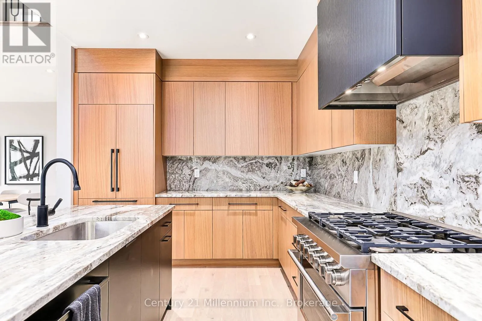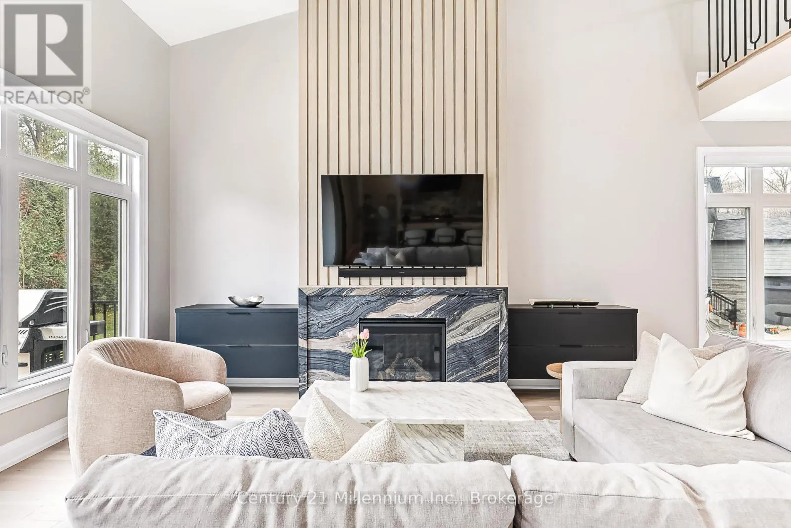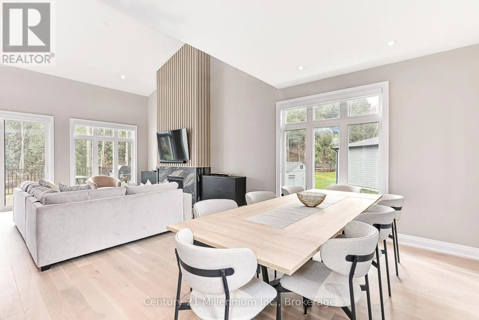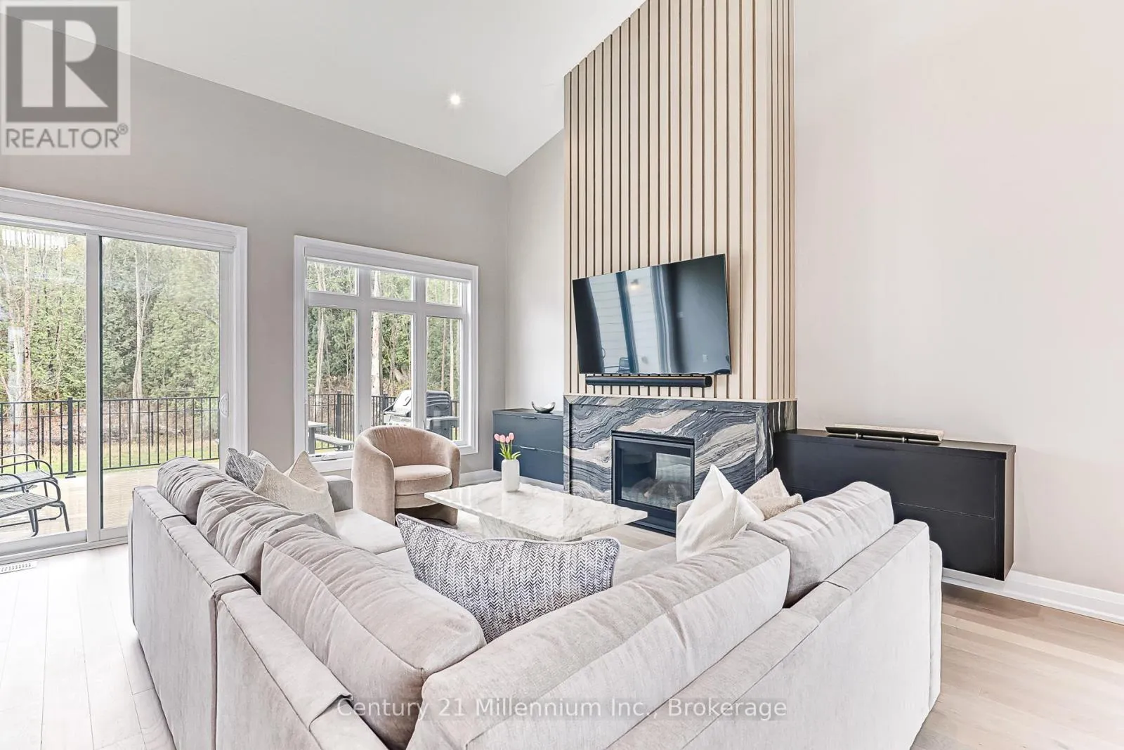 Available for annual lease in the Bayside community, this exceptional 5-bedroom home offers refined finishes and spectacular privacy. This stunning property features elegant white oak hardwood flooring leading into a spacious great room, highlighted by a striking marble and wood-paneled fireplace. The gourmet kitchen is a chef’s dream, boasting high-end stone countertops, a 36″ gas range, a butler’s pantry,