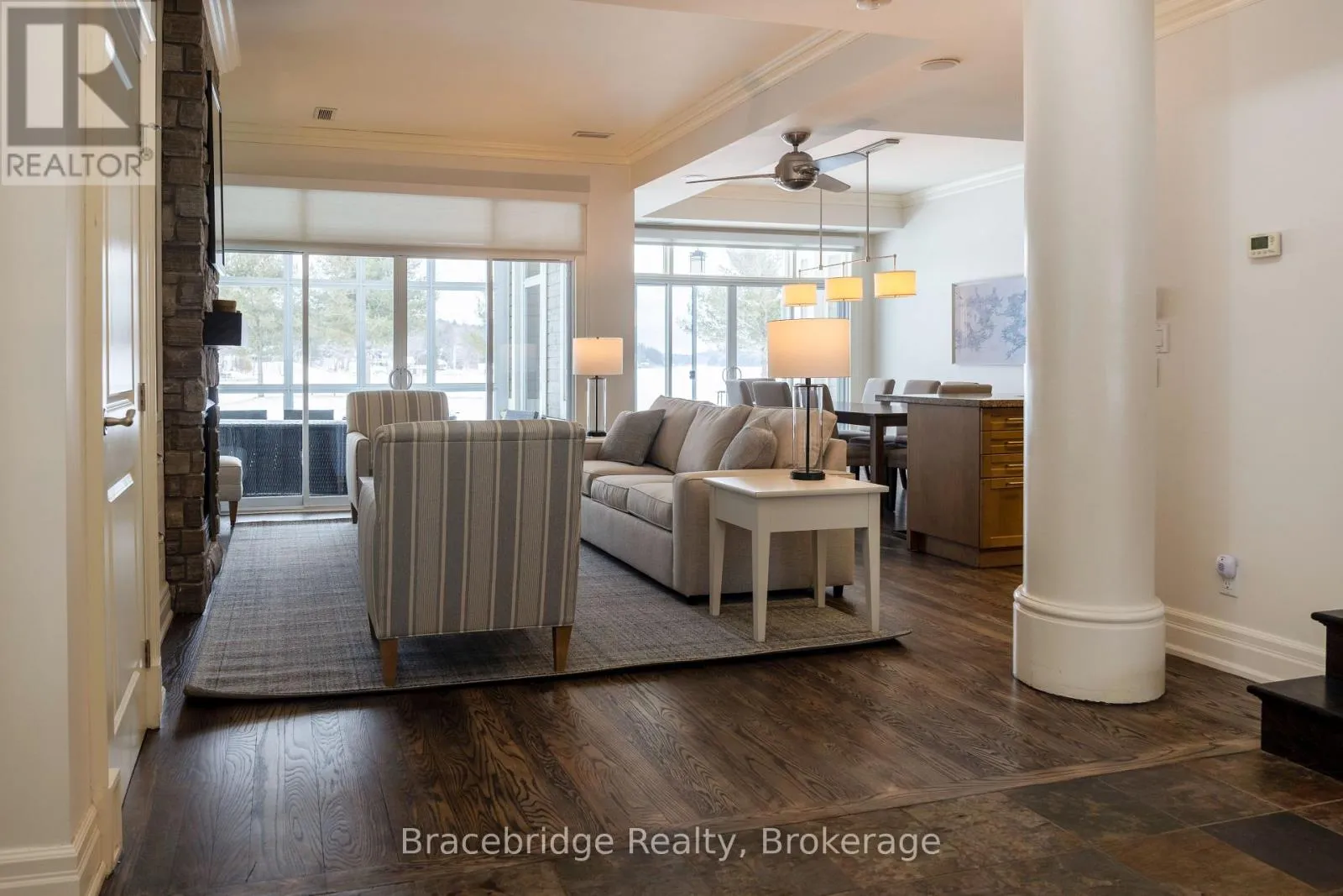 Welcome to the Grand Muskokan Villas at Touchstone Resort, where effortless luxury meets true beachfront living on the sparkling shores of Lake Muskoka. This exceptional G103-D2 fractional villa offers a rare opportunity to own a coveted south-west facing, sand-level unit-perfectly positioned for all-day sun and unforgettable sunset views. This beautifully designed two-level, three-bedroom villa features an open-concept layout ideal for