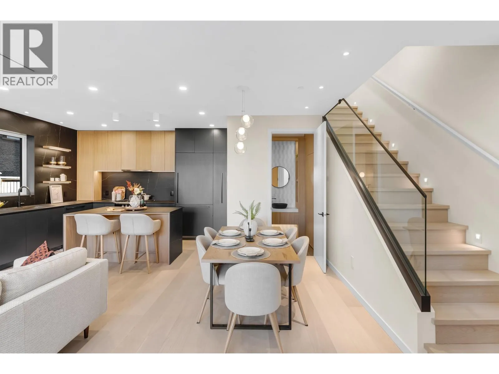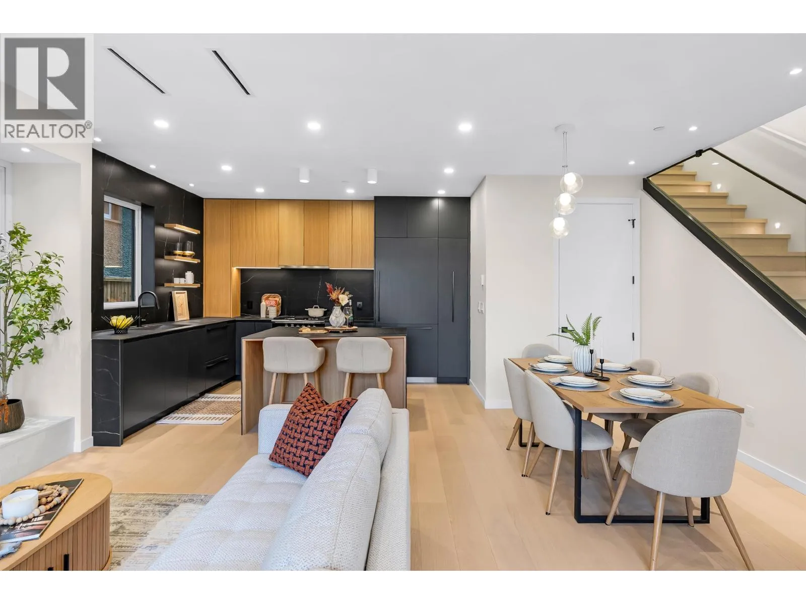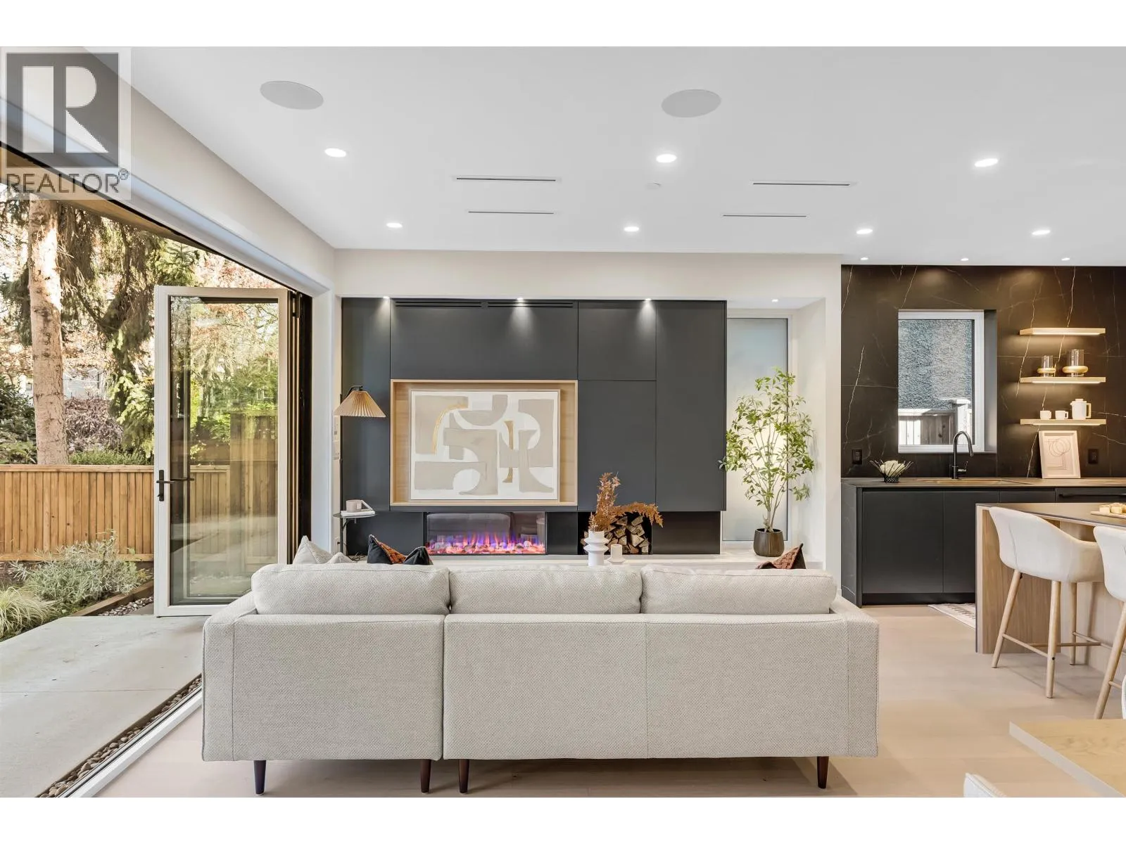 Experience exceptional craftsmanship in this Kitsilano front duplex. Every finish feels elevated and carefully thought out. Enjoy custom millwork, curated designer lighting, a bold island and premium integrated appliances. Live in year-round comfort with radiant in-floor heating, A/C, and a gas fireplace while enjoying a built in office nook that adds refined function. This home integrates indoor-outdoor living with folding