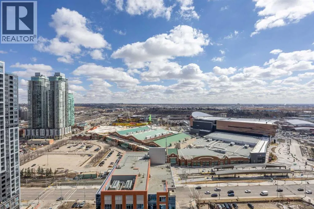 Welcome to the Alura! This bright CORNER UNIT is located on the 24tTH FLOOR and has panoramic views of the new Scotia Place, stampede grounds & the Rocky Mountains! . With an open floor plan boasting a full bank of windows to enjoy the views plus the living room which also has a patio door leading to your cover balcony