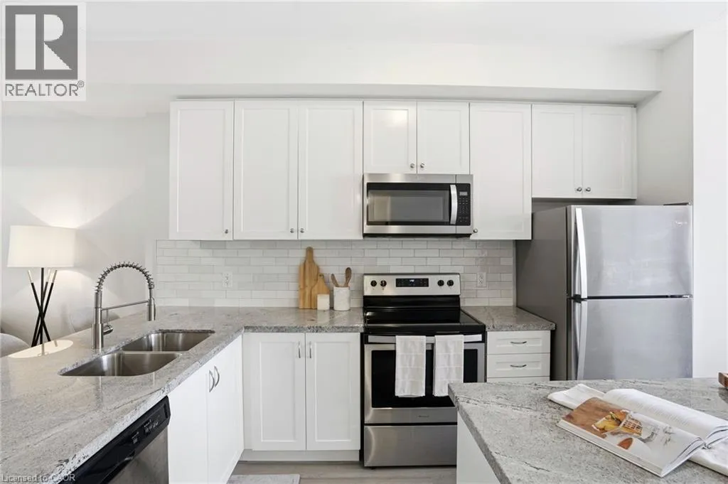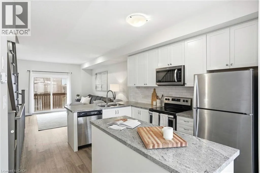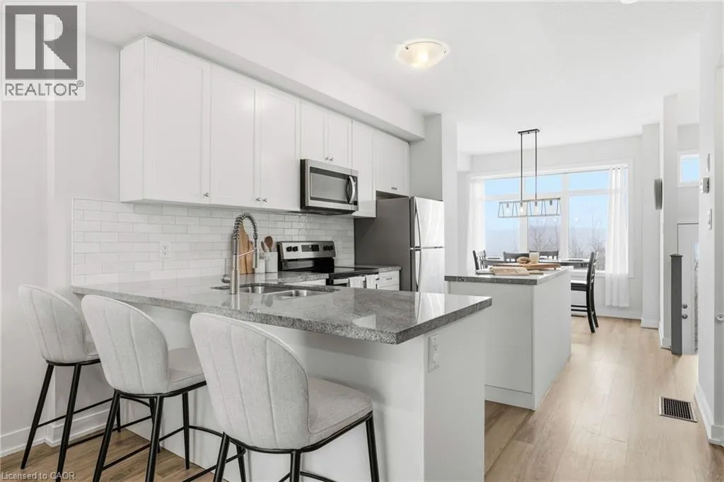 Welcome to this bright and thoughtfully designed 2-bedroom, 1.5-bathroom home in sought-after Ancaster. With 9-foot ceilings, the second floor features an open-concept living room, kitchen, and dining area. The spacious living room with pot lights opens onto a deck, while the kitchen includes granite countertops, shaker cabinetry, an island, and a peninsula with seating that provides additional storage and counter