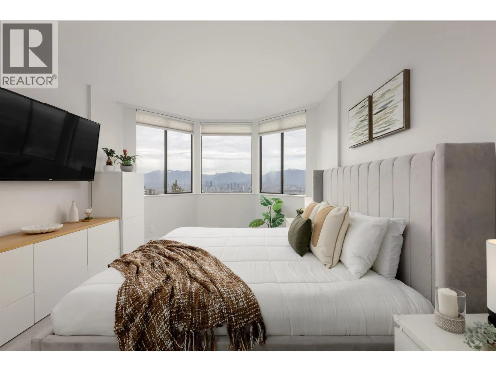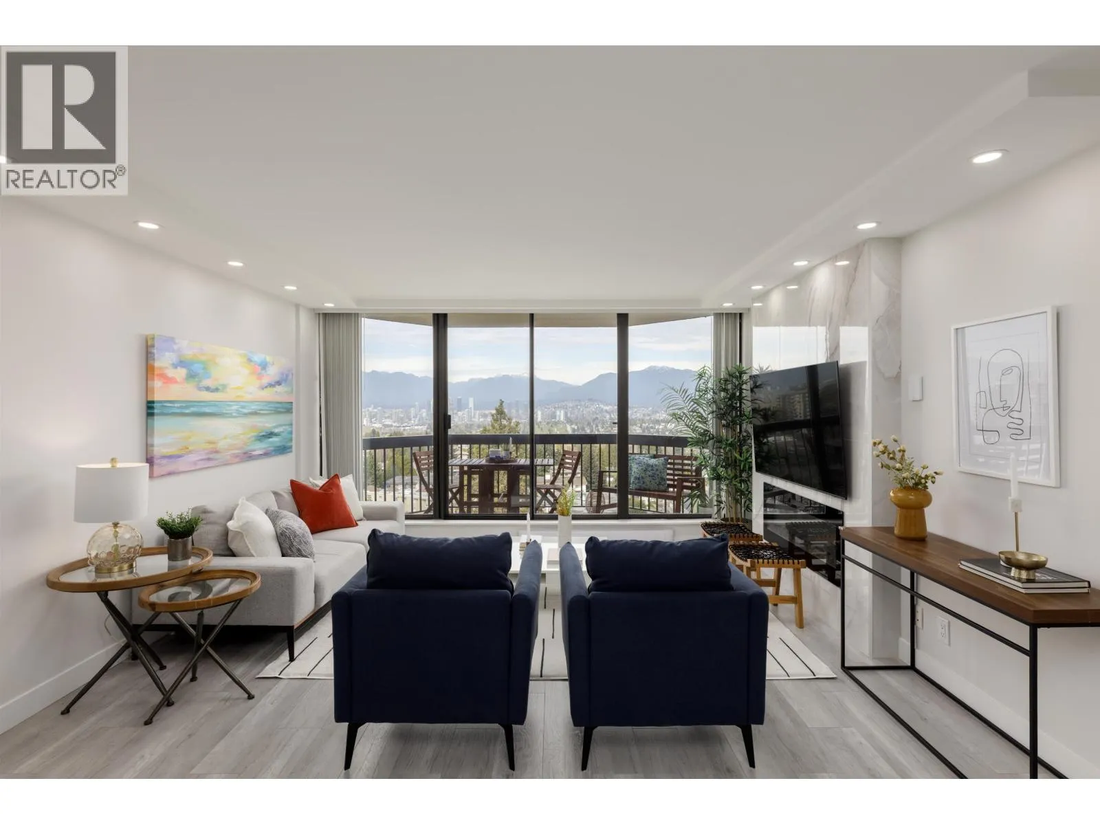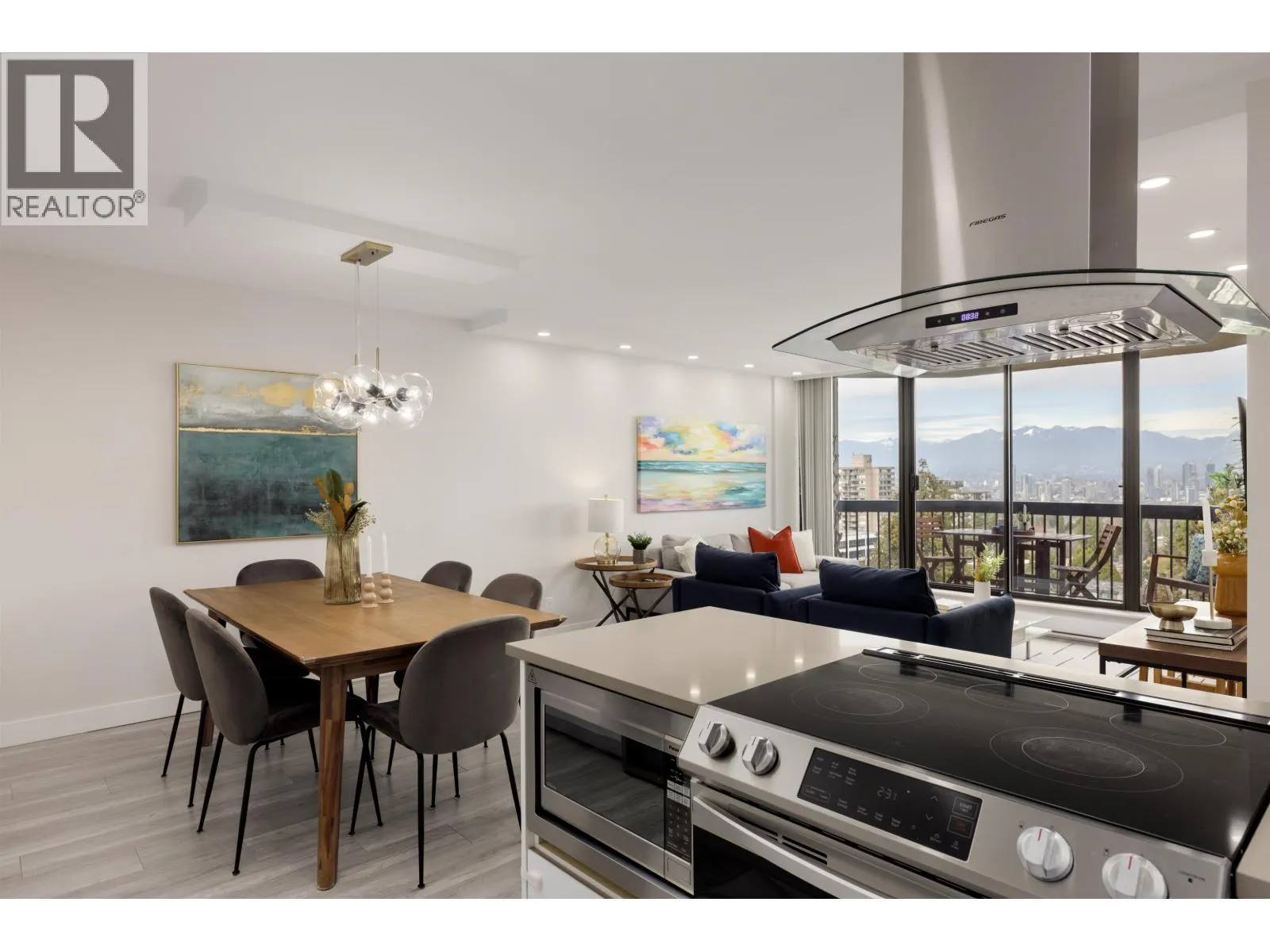 In the heart of Downtown Burnaby, this bright and spacious fully renovated 2-bedroom, 1-bath home offers breathtaking unobstructed views of the city, mountains, and Deer Lake. Thoughtfully updated in 2022 with laminate flooring, designer paint, pot lights, new stainless steel appliances, custom kitchen cabinetry, quartz counters, stylish backsplash, spa-inspired bathroom, new blinds, and in-suite laundry. The dining area features recently