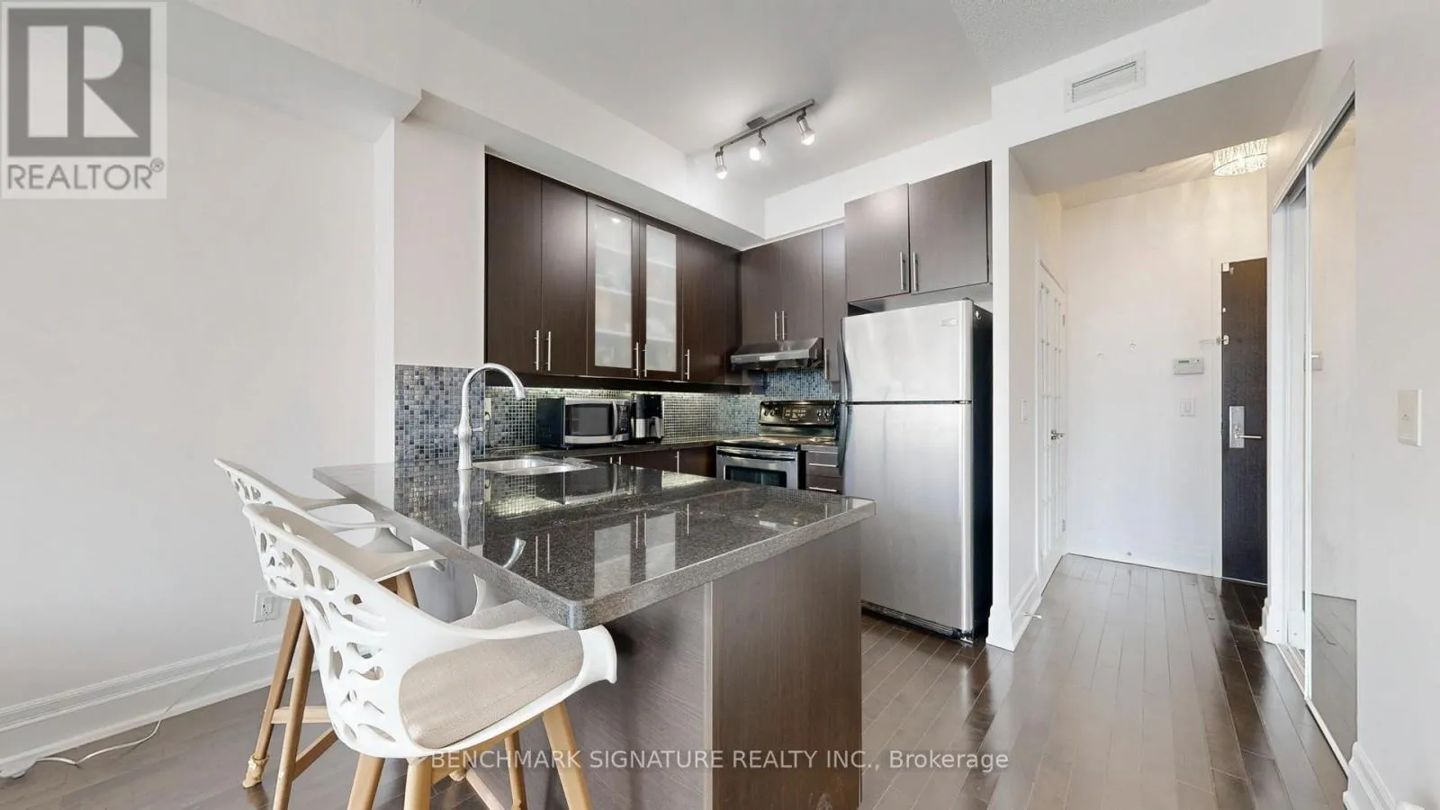 Welcome to Rouge Bijou Promenade in the heart of Downtown Markham! This functional 1+Den layout features soaring 9ft ceilings and a bright north exposure. The spacious den is enclosed with a French door, making it a perfect private home office or guest room. Open-concept kitchen with granite counters, stainless steel appliances, and a functional breakfast bar. Steps to Cineplex, VIP