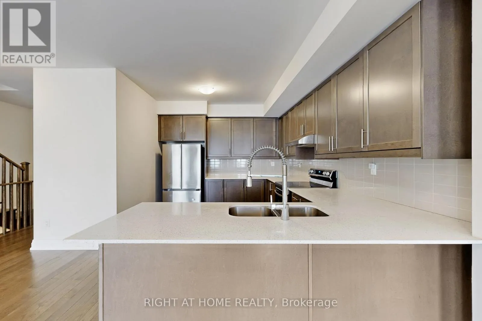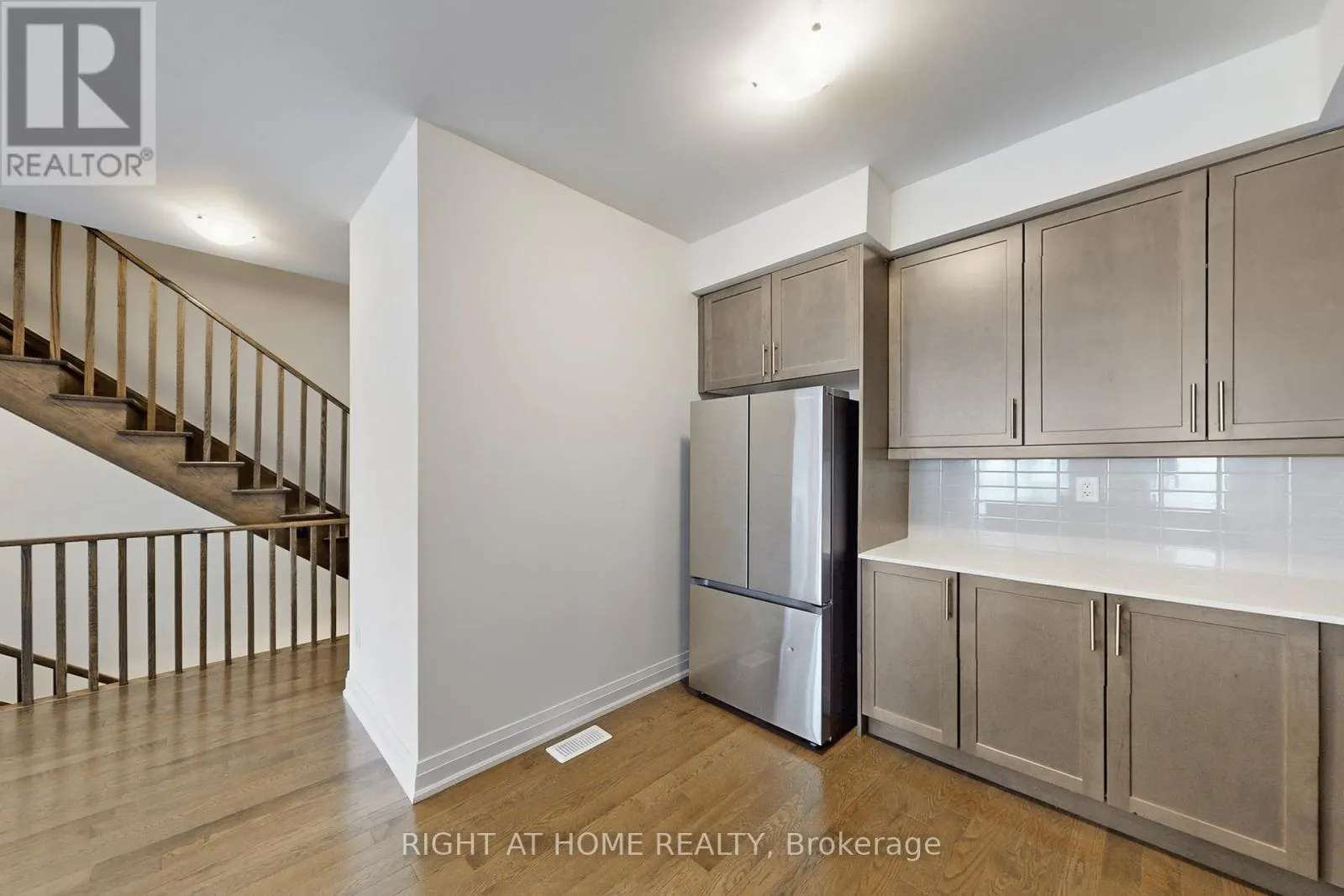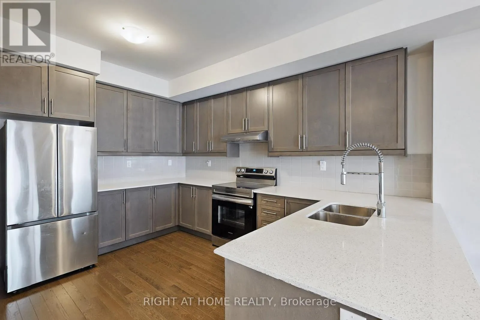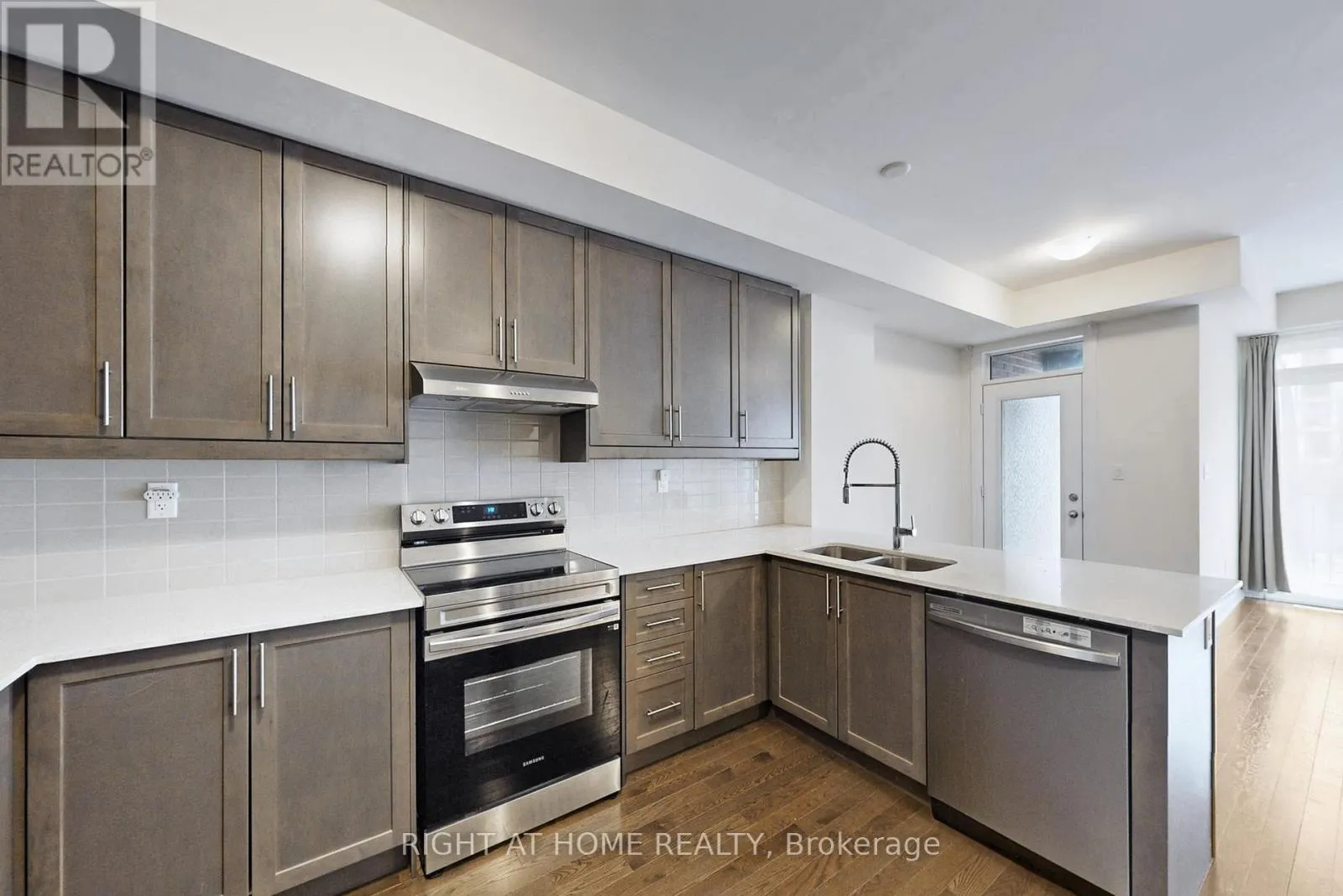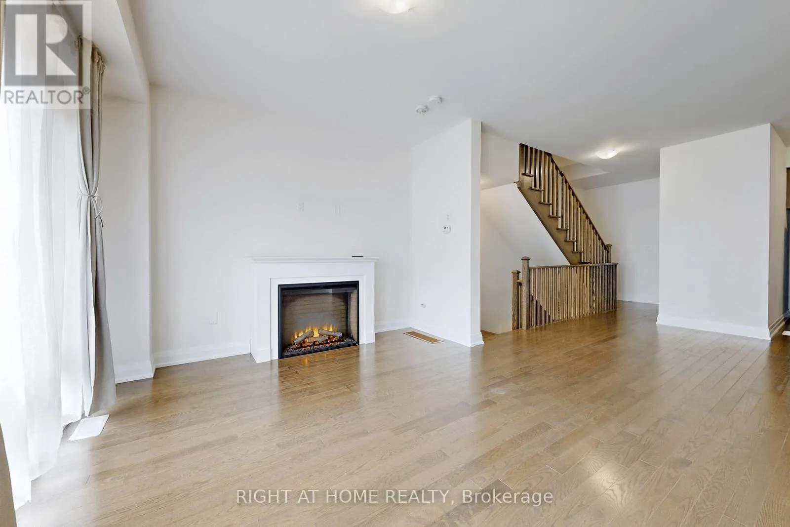 Modern 3-bedroom, 3-bathroom townhome in sought-after Aurora Trails. Bright open-concept main floor with spacious great room, electric fireplace, and contemporary kitchen featuring stainless steel appliances and extended breakfast counter. Walk-out to private balcony. Upper level offers a primary bedroom with ensuite and his-and-hers closets, plus two additional bedrooms and a full bath. Ground floor flex space ideal for home office.