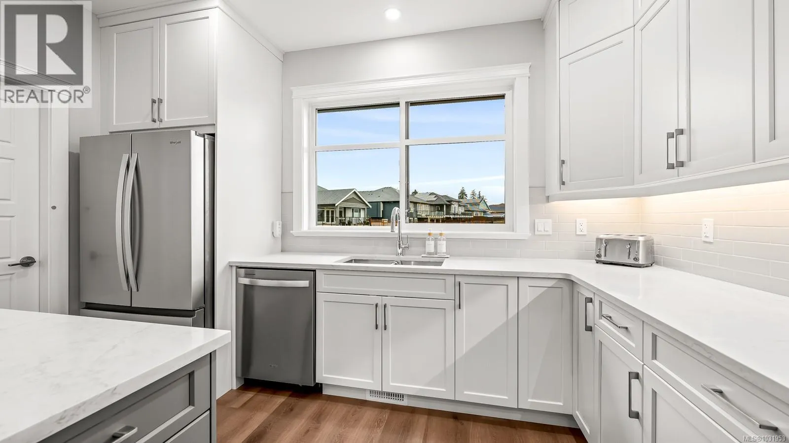 Immaculate, like-new 4 bed, 3 bath home located in The Ridge. Offering over 2,600 sqft of thoughtfully designed living, this home, with nearly 10′ ceilings, features a bright open-concept living room with a statement gas fireplace and a beautifully appointed kitchen with quartz counters, an oversized island, stainless steel appliances, and walk-in pantry. The primary suite is a true retreat