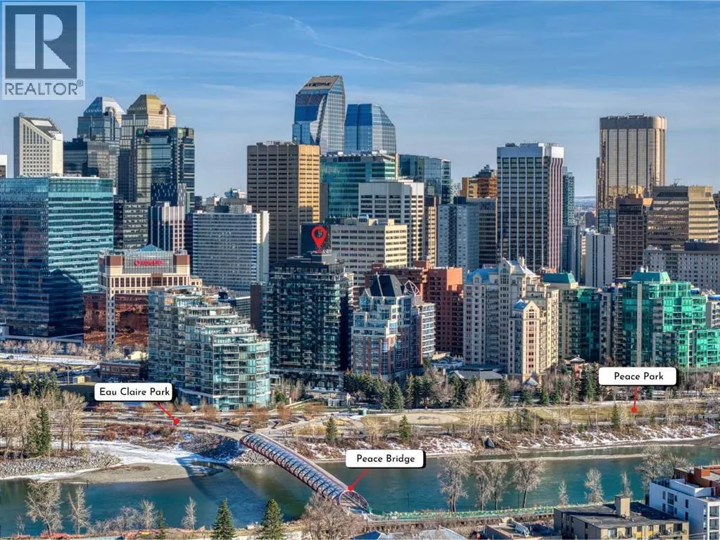 Experience refined urban living from the 5th floor of First & Park, Eau Claire’s newest luxury development. This beautifully appointed 2-bedroom, 2-bathroom residence offers a northeast exposure, welcoming morning sun and sweeping city and Bow River views(including the Peace Bridge) through dramatic floor-to-ceiling windows. The thoughtfully designed open-concept layout combines style and functionality, highlighted by a sleek, CHEF-INSPIRED KITCHEN with