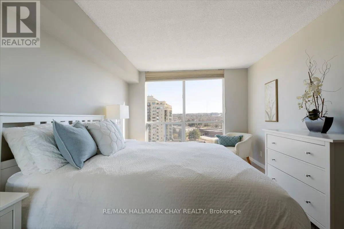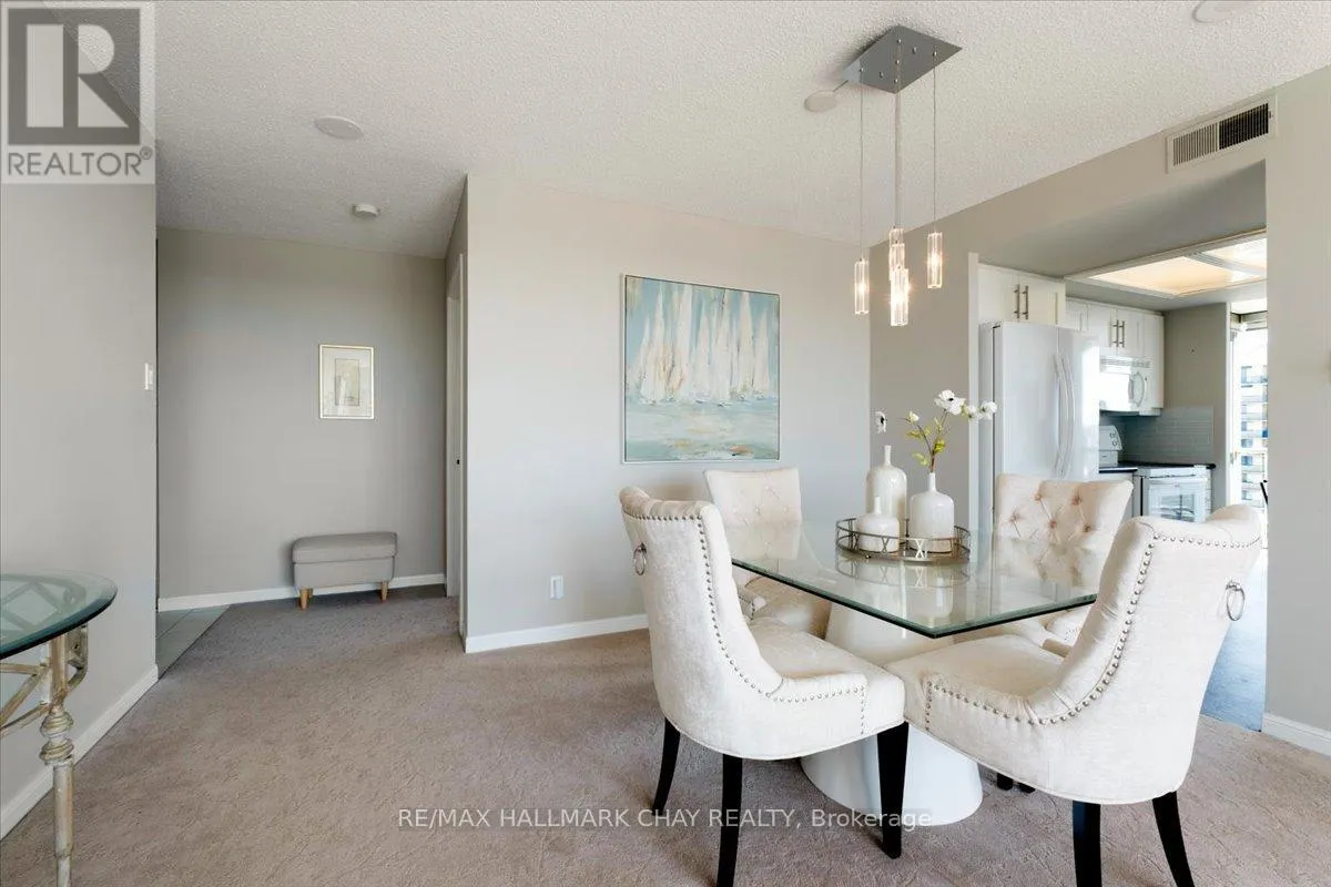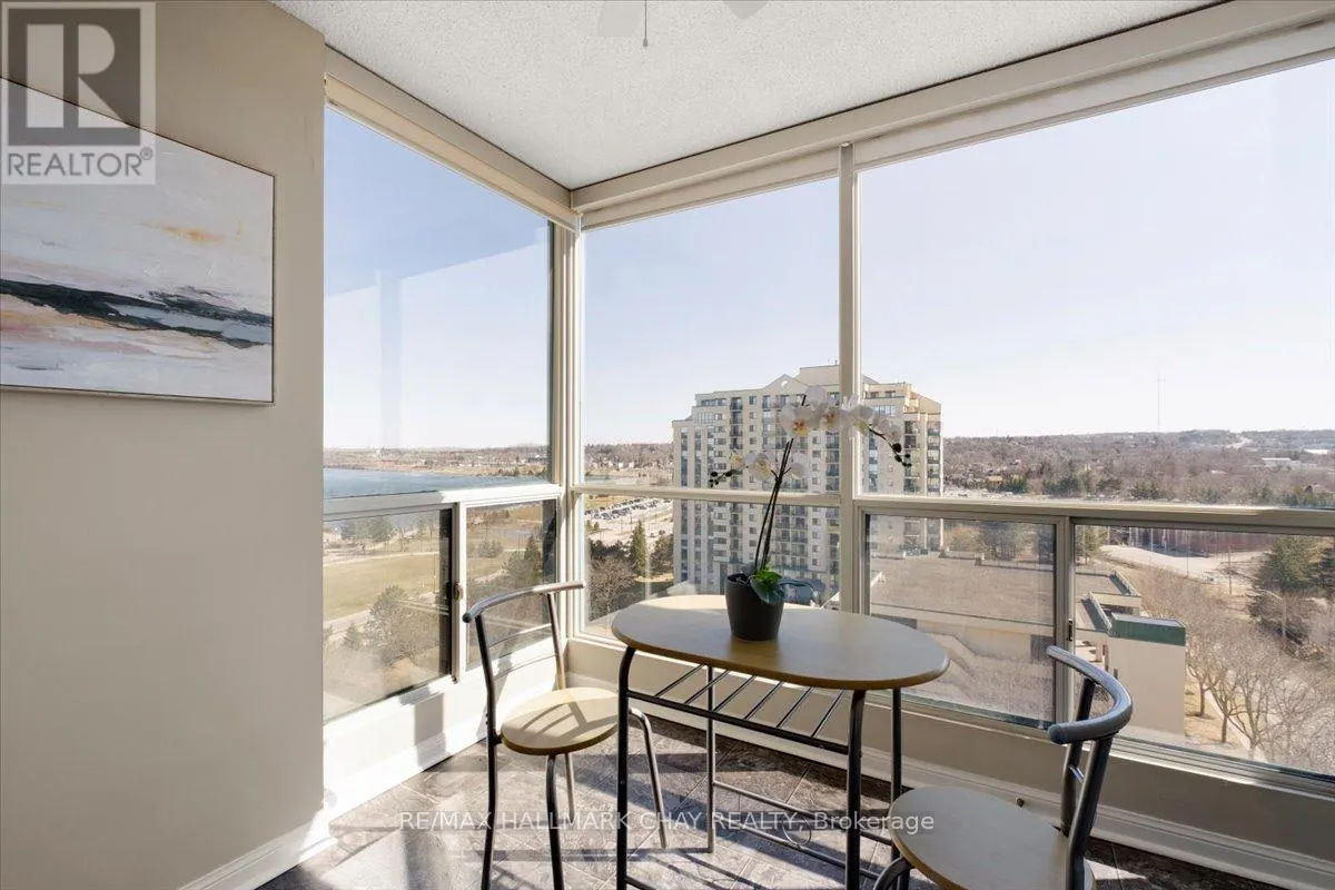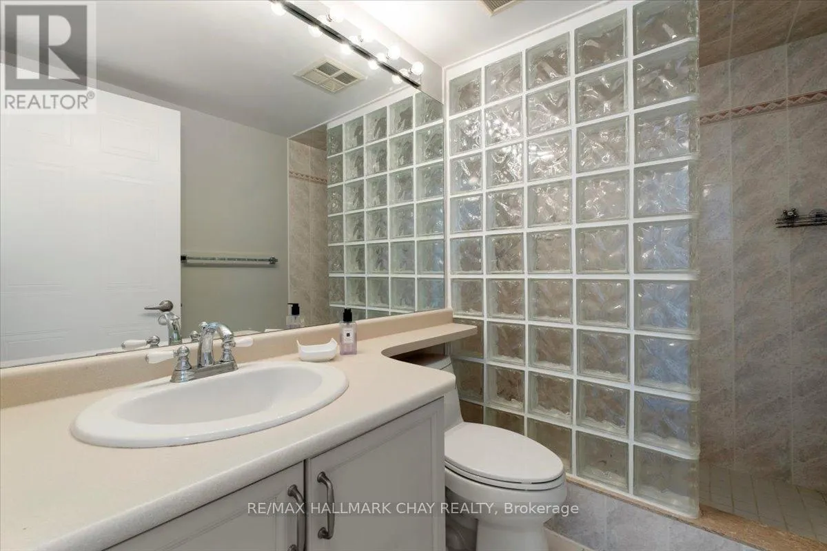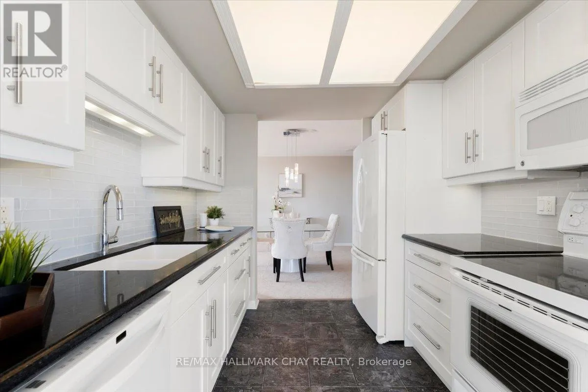 Lovely 2 bedroom, 2 Bath, 1,123 square foot suite at Marina Bay. Beautiful south facing view of Kempenfelt Bay. Spacious living room with a large dining area, spacious enough for a full dining set. The upgraded kitchen provides gorgeous counters, under-mount lighting, glass tile backsplash, ceramic floors, double sinks and loads of cupboards. The solarium is a beautiful area to
