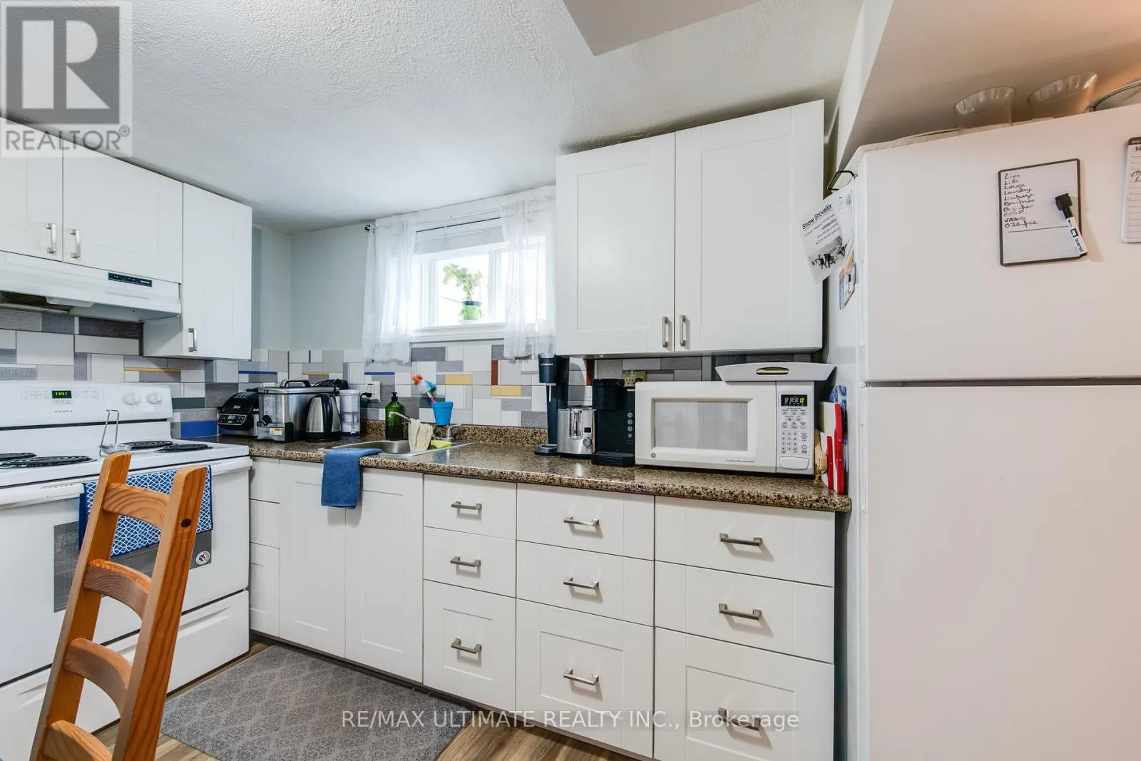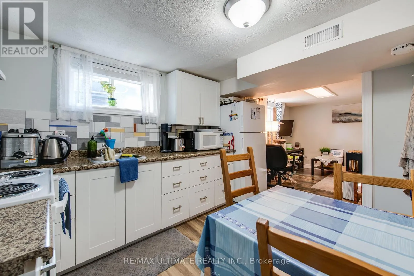 Renovated basement apartment featuring an open-concept living, dining, and kitchen area with laminate flooring throughout. The modern kitchen offers a family-size layout, ceramic backsplash, and walk-out to the outdoor area. Spacious living and dining space. Generous bedroom with full closet. Includes one parking space and access to an outdoor area. (id:62650)