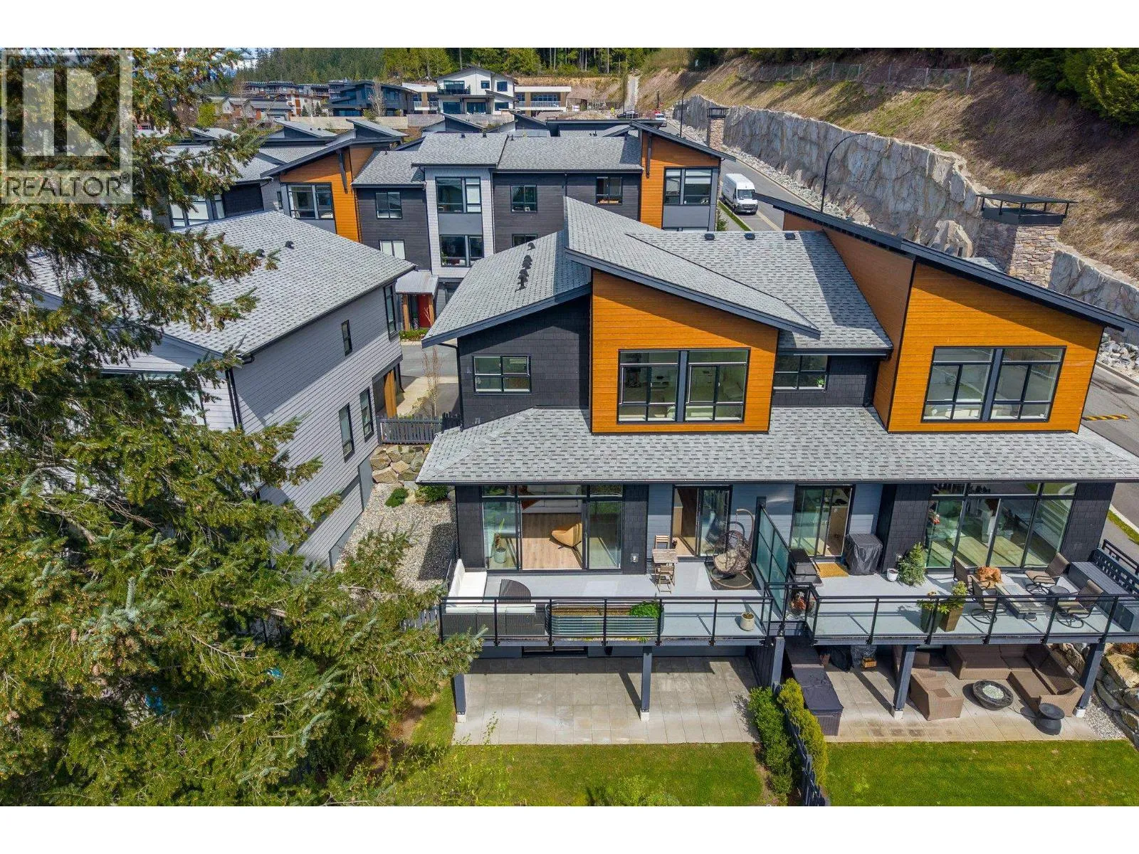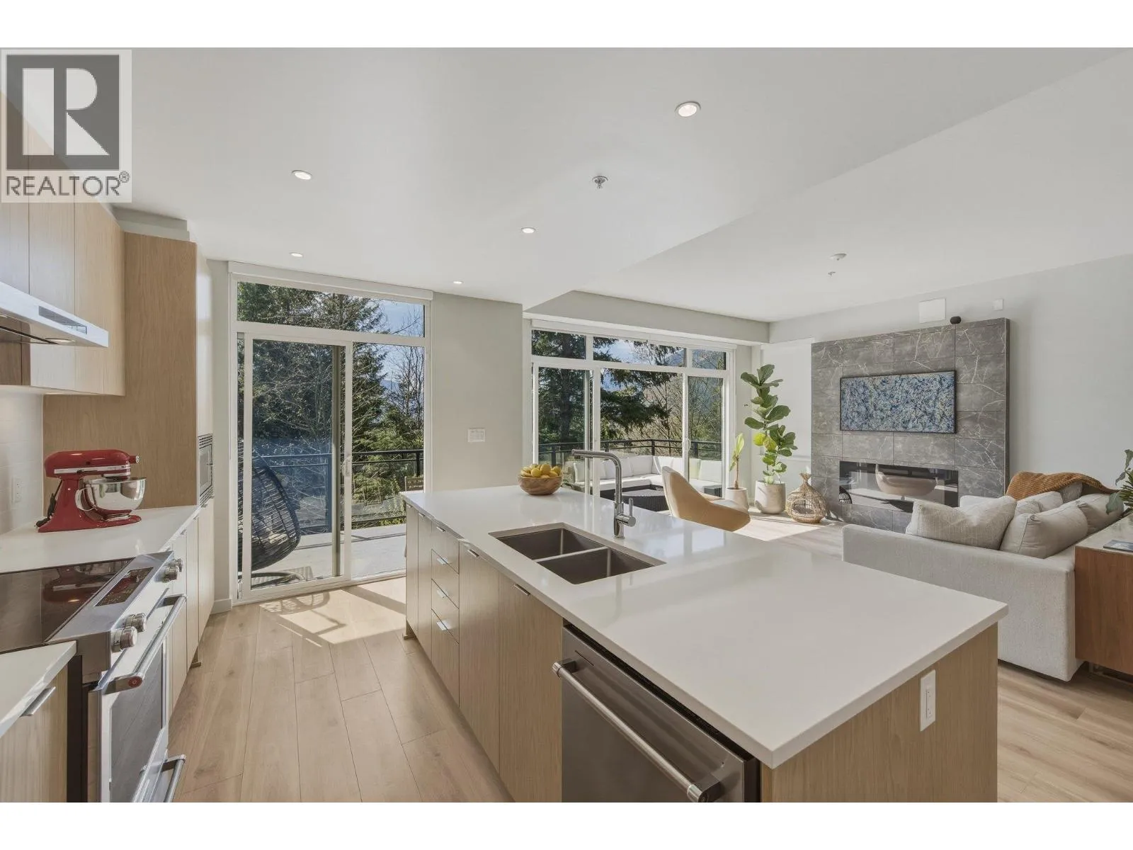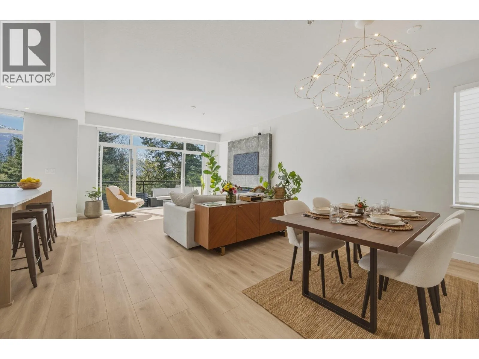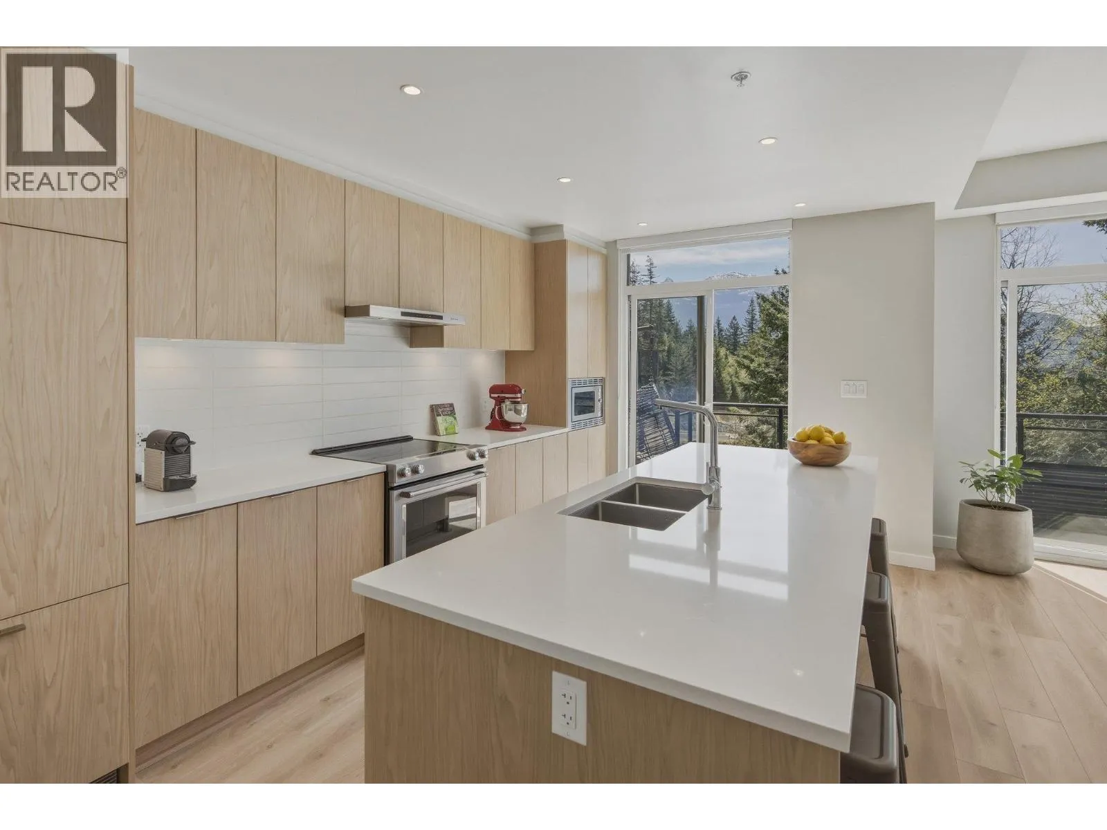 STUNNING half duplex at modern elevated ‘Highline’ by Polygon w/mountain views, privacy & treed outlook! Enjoy abundant natural light, 3 exposures, 9.5 ft ceilings, over height windows & doors, a true open plan great room w/sense of space. Deluxe kitchen + living w/fireplace both open out to south deck! The width of the home provides a generous layout on all