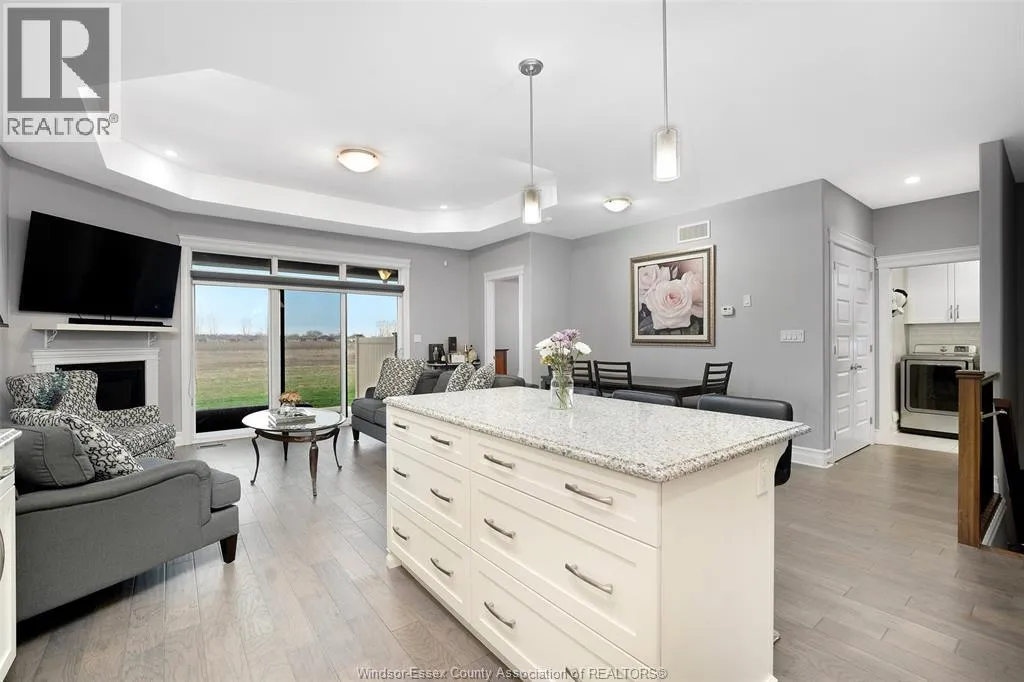 RIVERSIDE! MODERN/CLASSIC DESIGNED RANCH TOWNHOME OFFERS LUXURIOUS FEATURES – SHARP WHITE CABINETS W/OVERSIZED ISLAND AND GRANITE COUNTERTOPS, OPEN TO GREAT RM W/GAS FIREPLACE & 9 FT PATIO DOORS WITH PRIVATE PATIO AREA, 2 BEDROOMS (MASTER SUITE INCLUDES DBL GRANITE/QUARTZ VANITY, CERAMIC/GLASS SHOWER & SPACIOUS WALK-IN CLST), LRG PANTRY OR STORAGE CLST, CONVENIENT MAIN FLR LAUNDRY W/CABINETRY, 7 INCH TRIM, INTRICATE