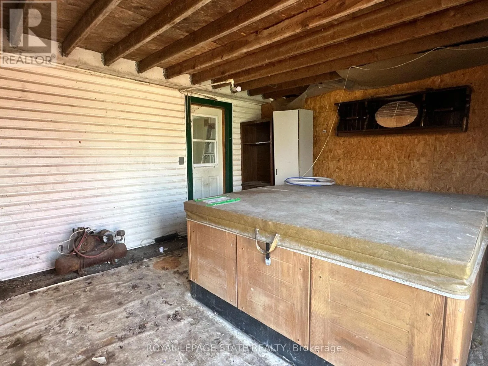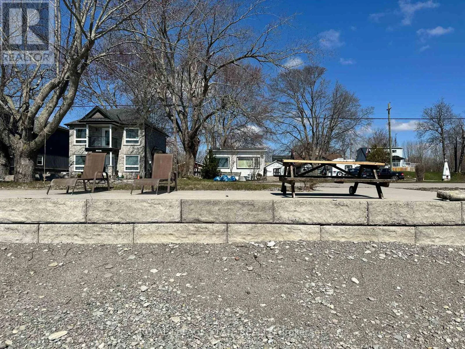 Four-season cottage property with ownership on both sides of North Shore Drive. Waterfront features shallow entry, sand and pebble beach, concrete breakwall, and concrete pad. North-side home offers 2 bedrooms, bright living room, separate dining area, large kitchen, and 3-piece bath. Garage, shed, partly enclosed rear porch with hot tub, and long driveway with ample parking. Property requires TLC but