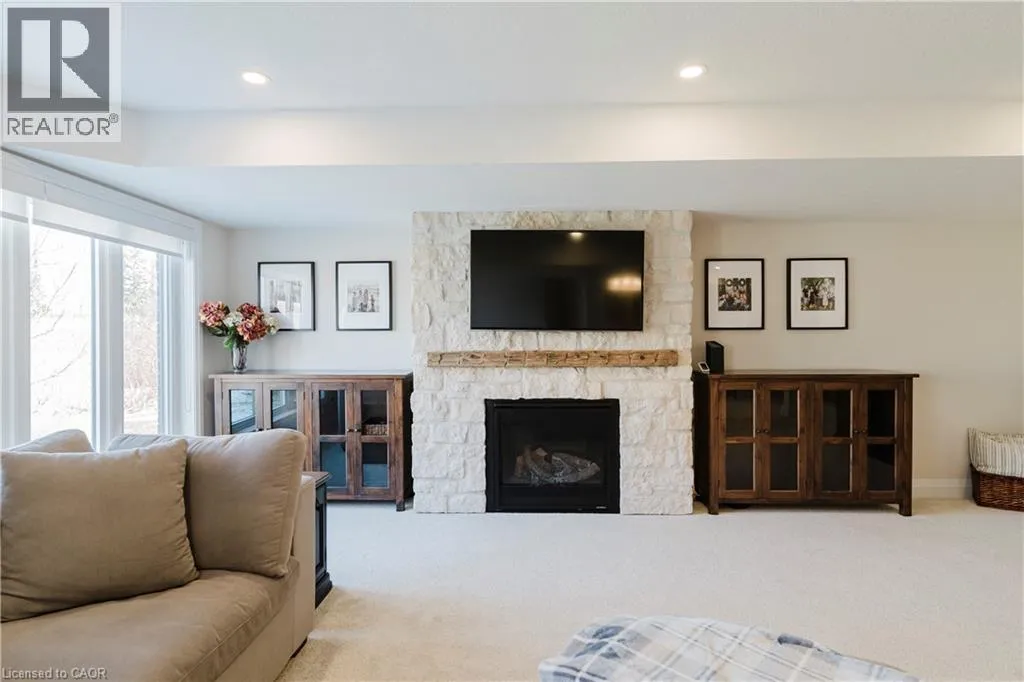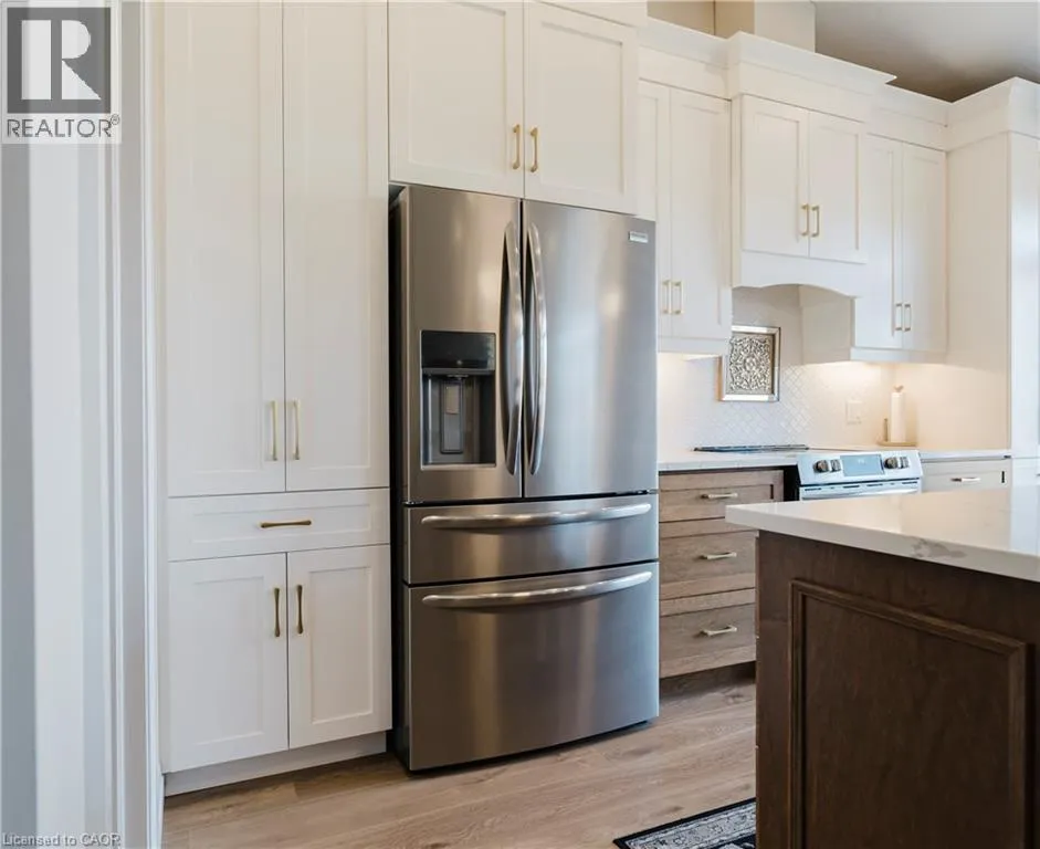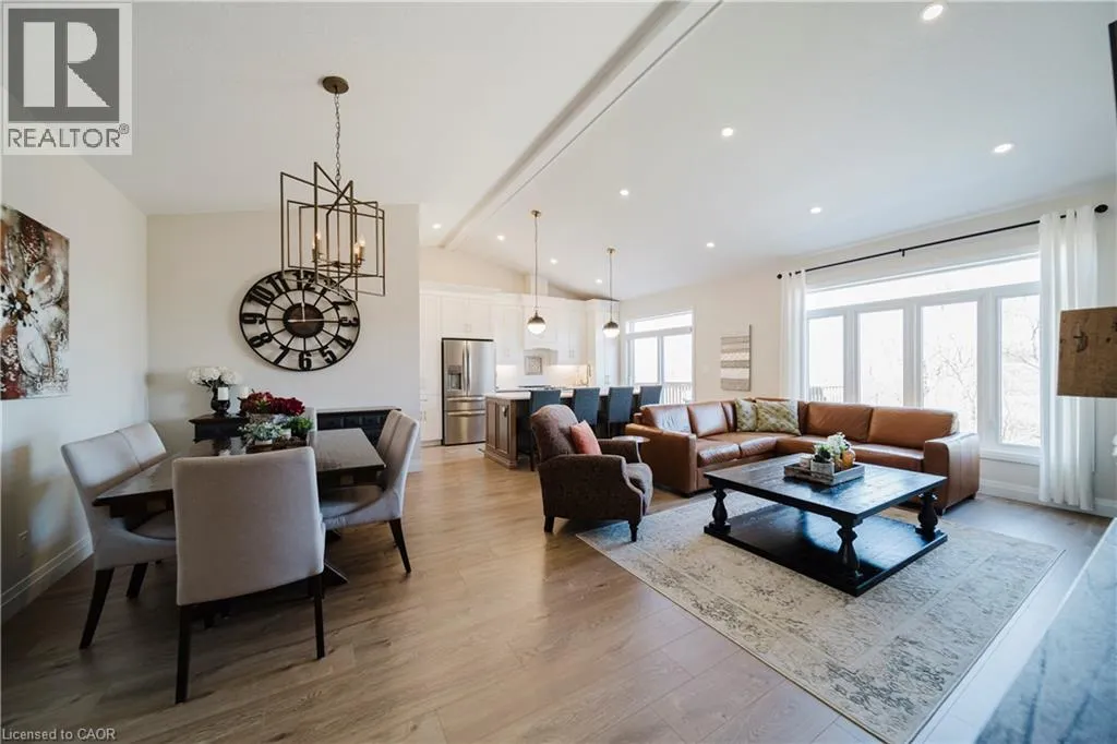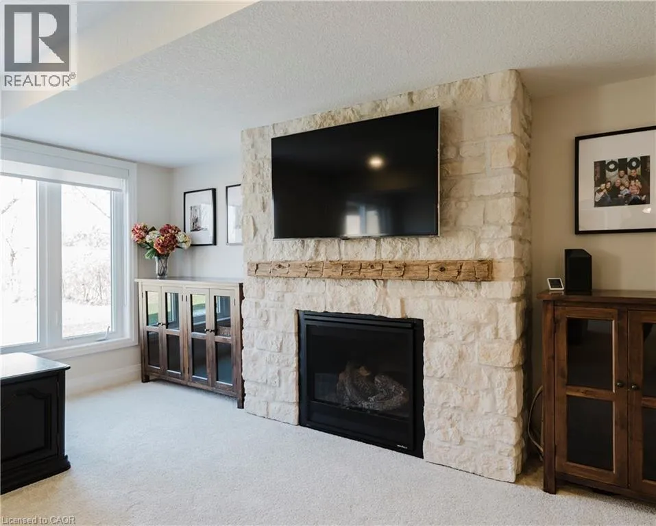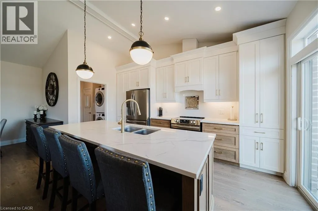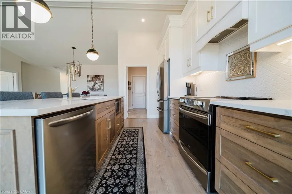 Welcome to Timberlane—an exclusive Baden community—where this exceptional end-unit bungalow townhome stands out with designer-inspired finishes and a premium greenspace setting that offers added privacy. The main level showcases a modern open-concept layout, anchored by a stunning custom stone fireplace that creates a warm and inviting focal point. Oversized windows flood the space with natural light, while the thoughtfully designed