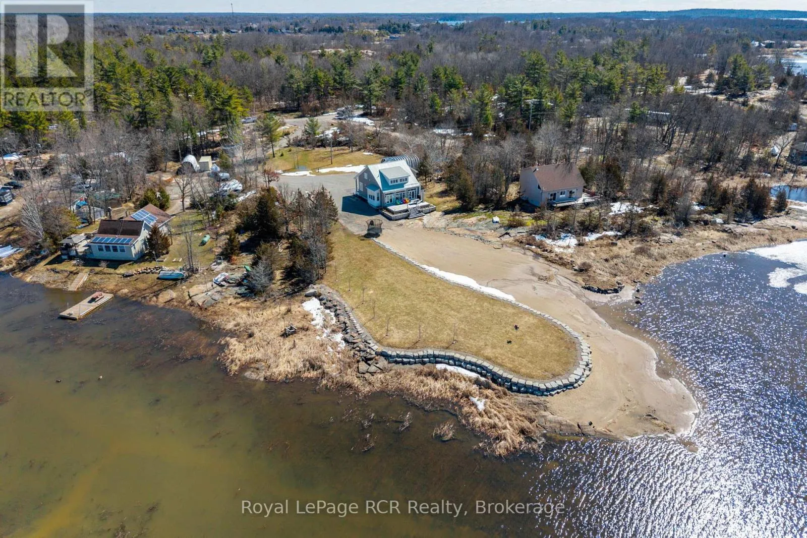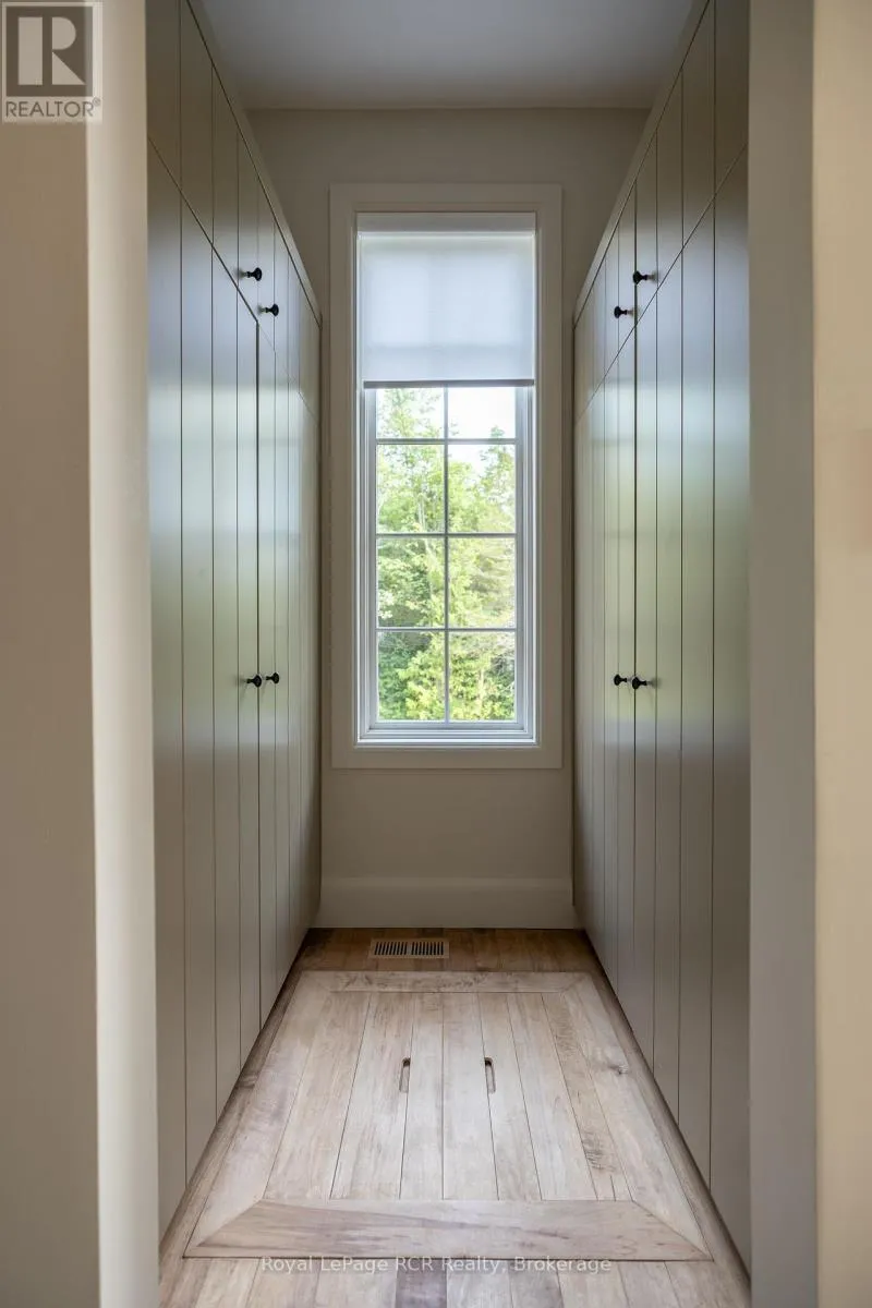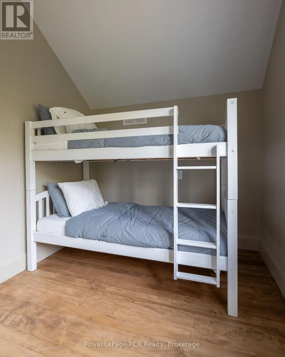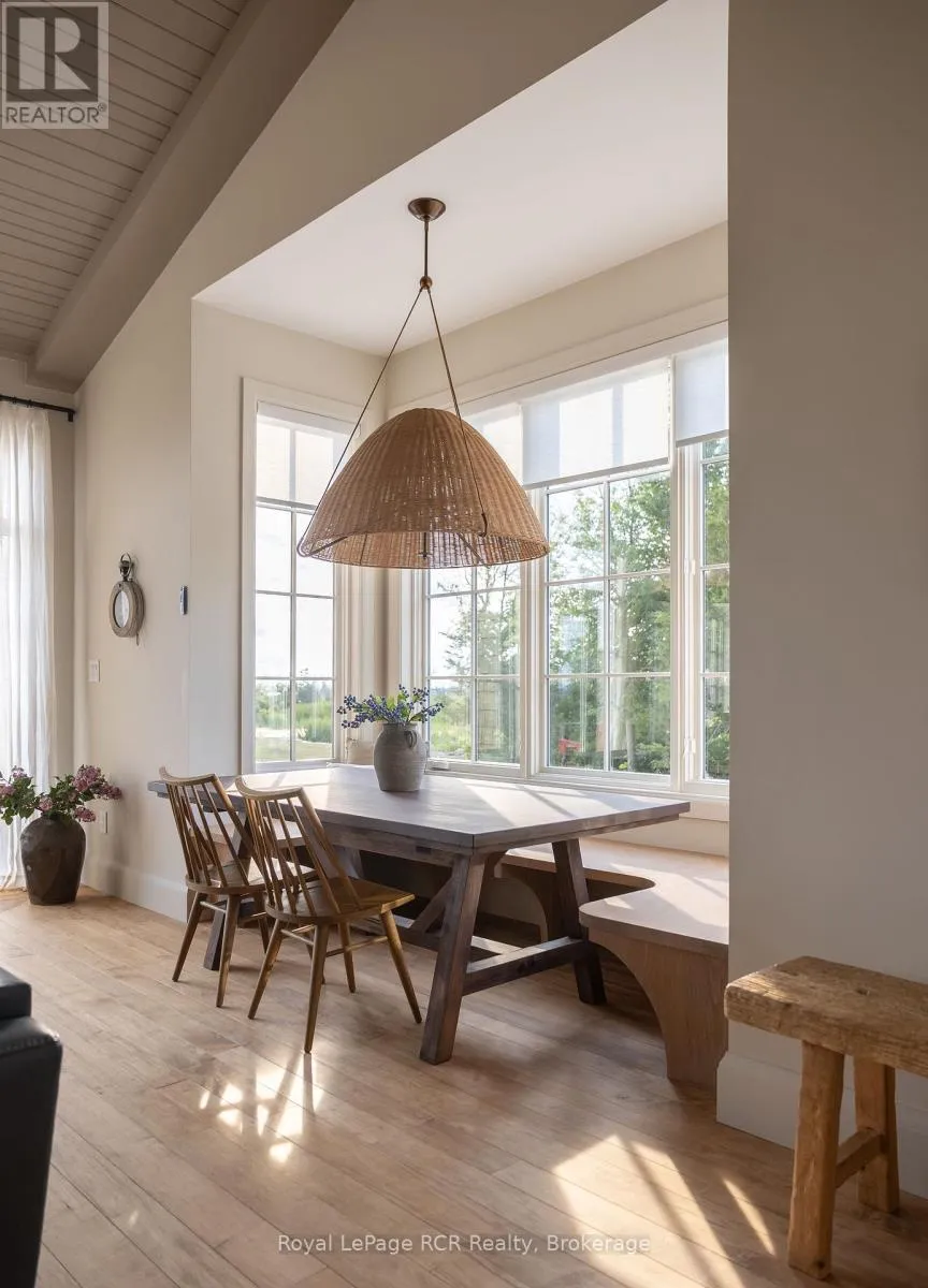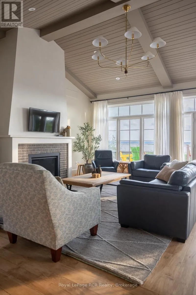 Custom Muskoka Beach House with sand beach waterfront, blending timeless charm with modern comfort. Thoughtfully designed and built in 2023 with both attached and detached garages, this open-concept home offers expansive windows and vaulted ceilings which flood the principal rooms with natural light while framing beautiful lake views. Warm wood accents, custom millwork, and a cozy fireplace create an inviting