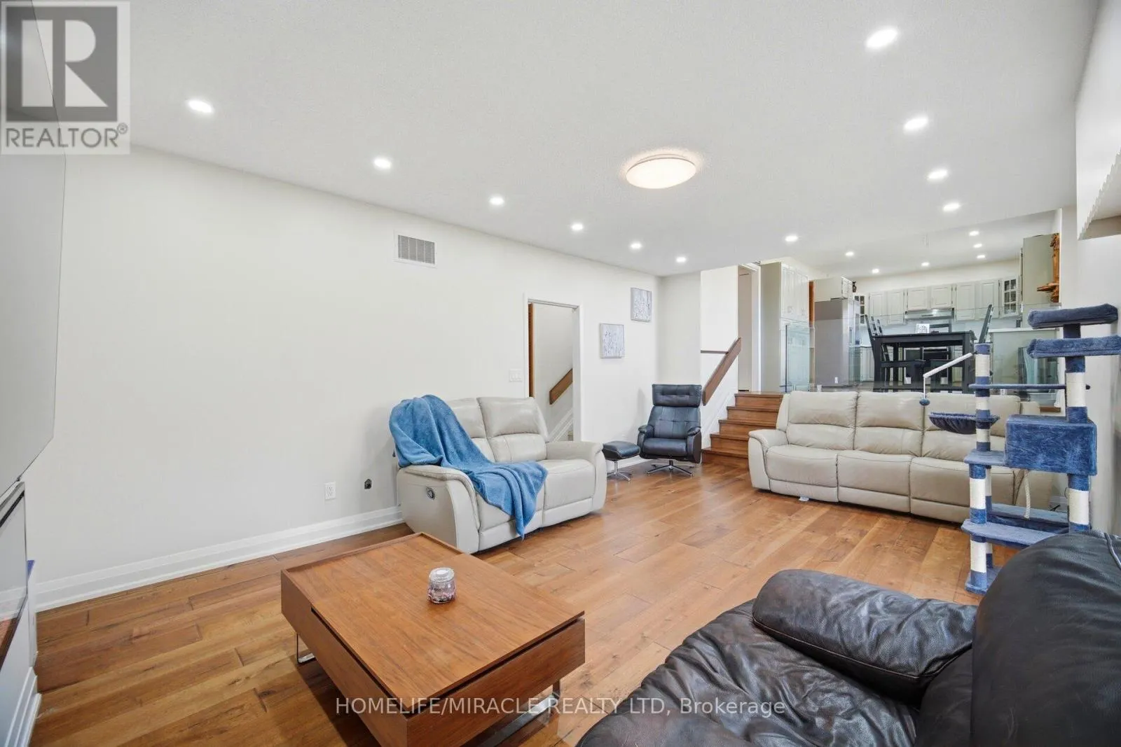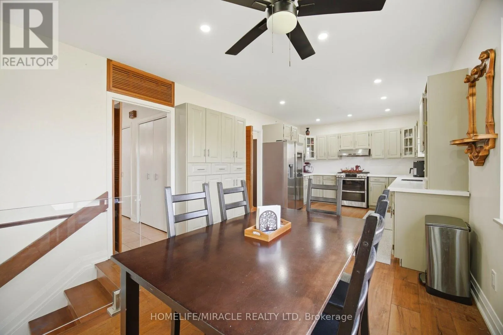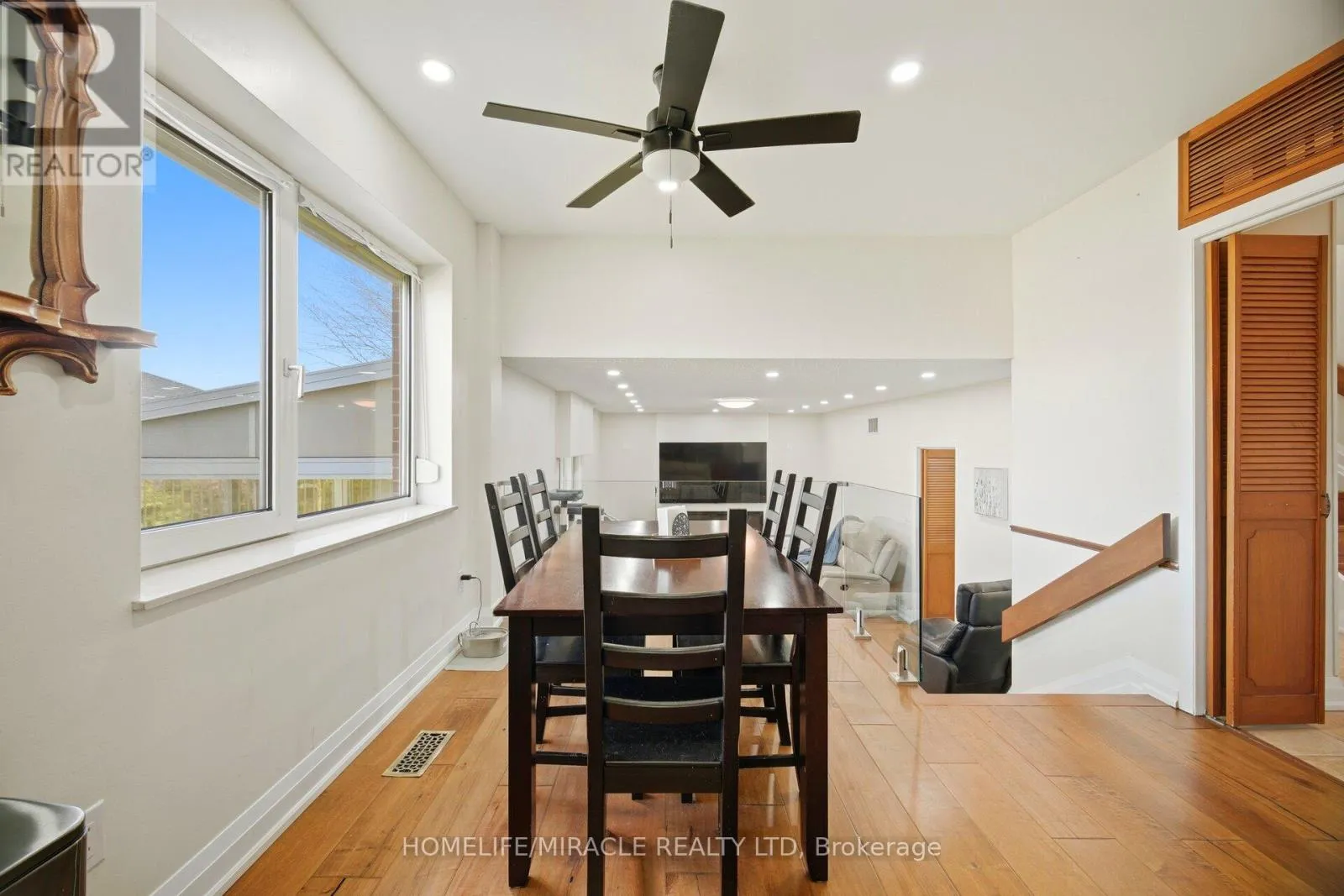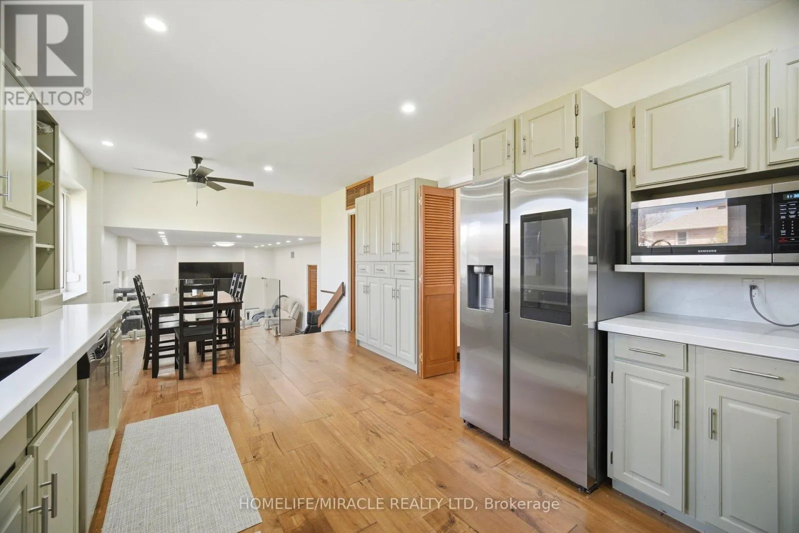 gas stove and refrigerator, and a striking electric fireplace with a mounted 85-inch television, creating a warm, modern, and inviting living environment throughout with high-quality finishes. The spacious eat-in kitchen with contemporary glass railings overlooks a sunken family room filled with natural light and offers a seamless walkout to a large, private backyard with a covered patio-ideal for entertaining, outdoor dining, or relaxing in a peaceful setting. The main level also includes customized baseboards, remotely operable dimmable pot lights, a well-appointed 3-piece bathroom, and a thoughtfully designed laundry room with full-size washer and dryer, built-in bottom drawers, and upper cabinets for ample storage. Direct access to an oversized two-car garage with automatic openers, a side entry door, and an additional refrigerator provides added convenience, functionality, and everyday peace of mind. Upstairs features three generously sized bedrooms, including a spacious primary suite with a fully renovated ensuite. The updated main bathroom offers a double vanity and a full-size custom cabinet for enhanced storage and practicality. With approximately 2,800 sq. ft. of living space, a basement crawl space behind built-in bookshelves, enhanced security shutters, and close proximity to highways, top-rated schools, shopping, parks, and scenic surroundings, this move-in-ready home delivers exceptional comfort, style, and location, making it a perfect choice for families and discerning buyers alike. (id:62650)