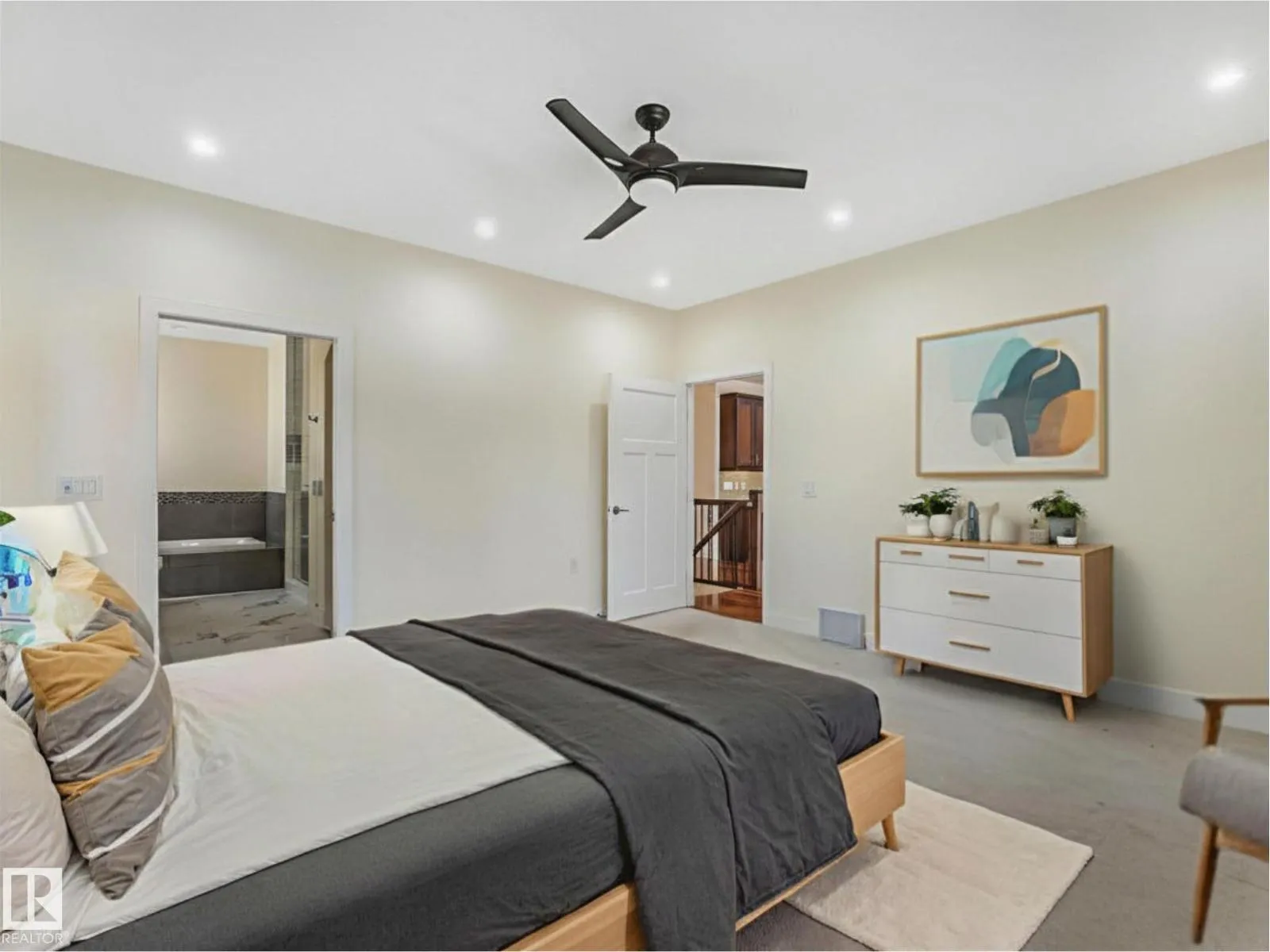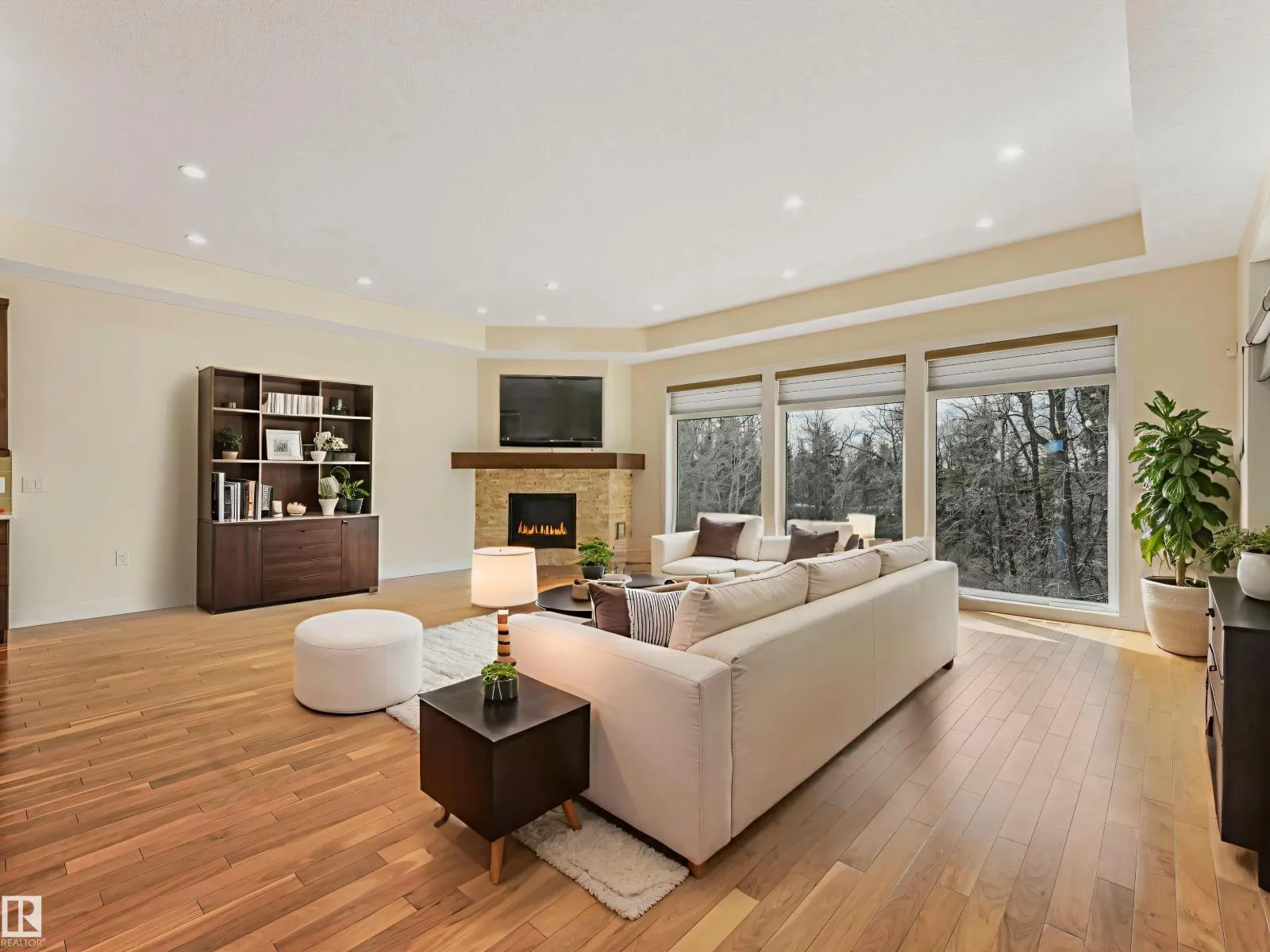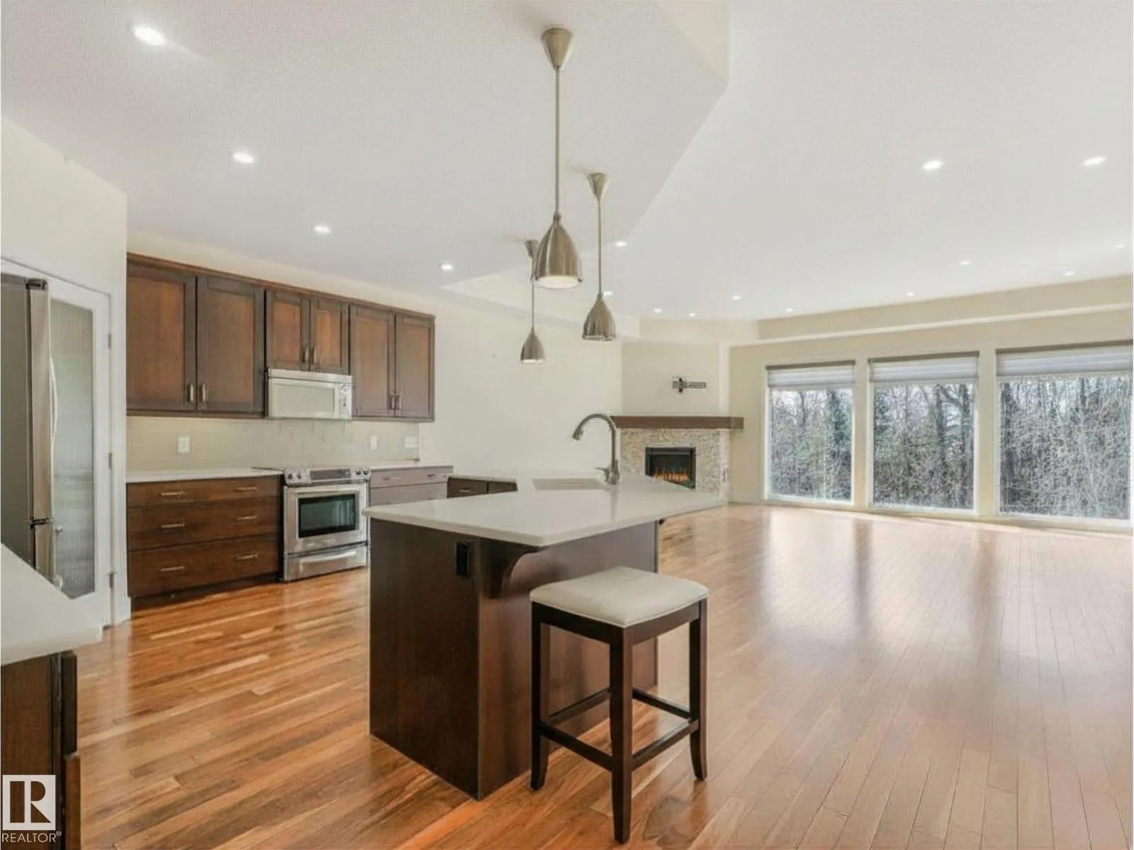 TRANQUIL RAVINE VIEWS and refined, low-maintenance living in this one-of-a-kind Touchmark bungalow, perfectly positioned in a quiet, sought – after community. The main level features 9-foot ceilings, expansive windows with motorized blinds, rich hardwood flooring, and a striking stone fireplace highlighting the open-concept living and dining areas. The kitchen is as functional as it is beautiful, and showcases SS appliances,