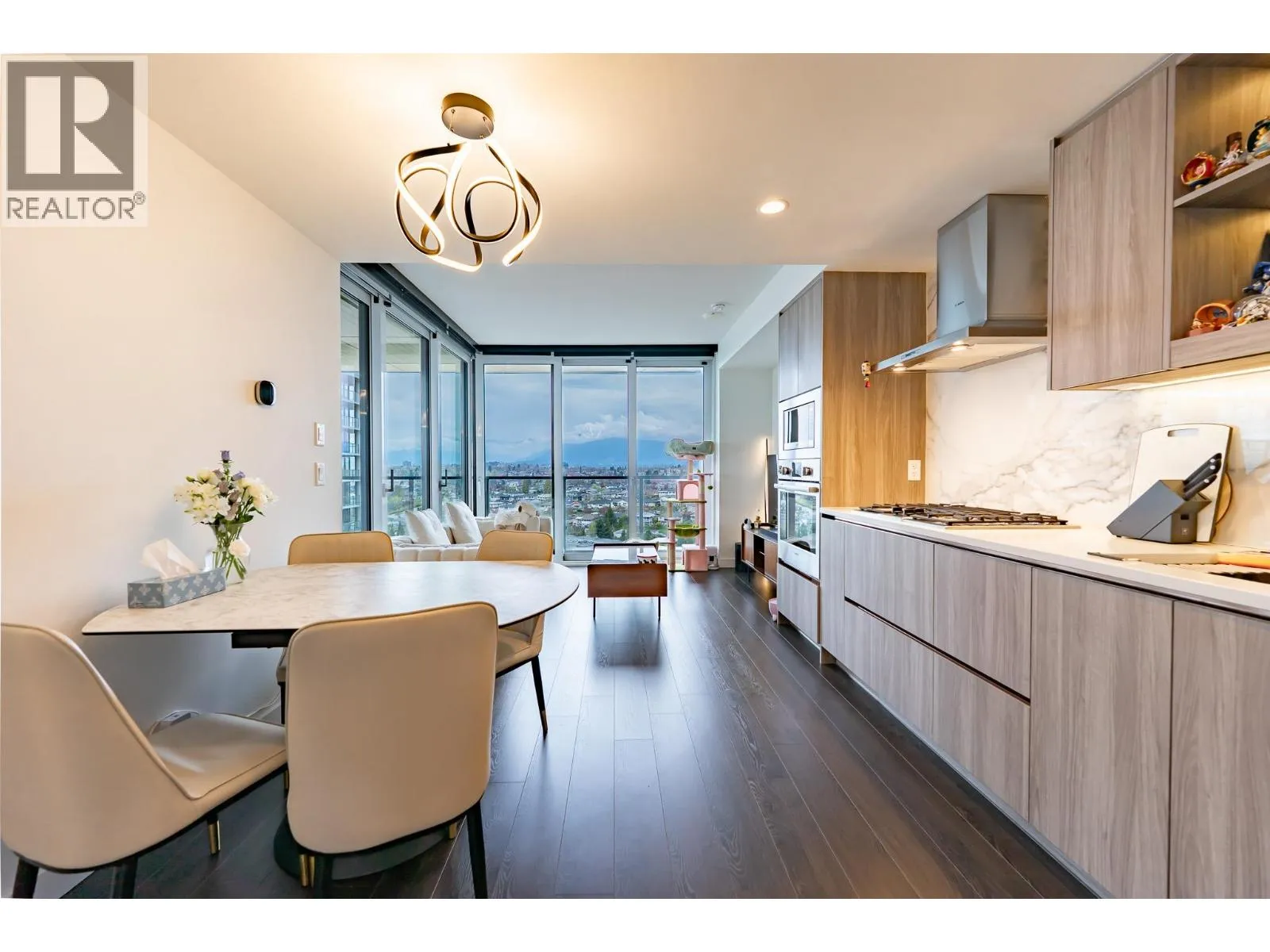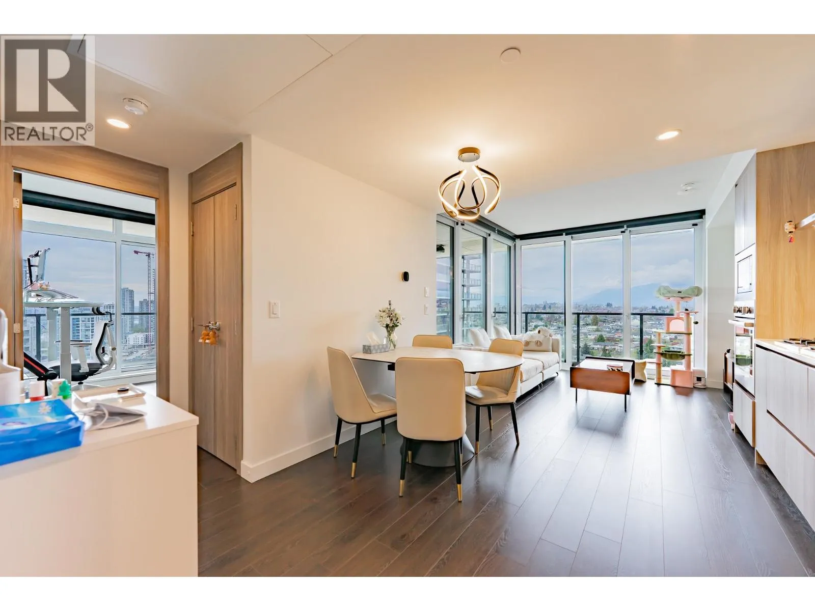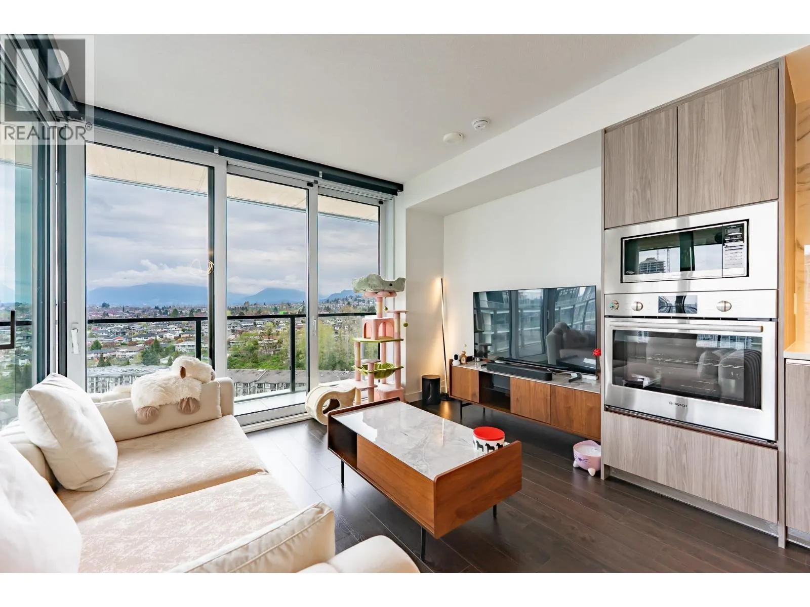 Welcome to this luxurious NW corner unit with stunning city and mountain views at Concord Brentwood Hillside East! Built by Concord Pacific, this 2-bed, 2-bath unit includes high-end integrated Bosch appliances, floor-to-ceiling windows, wide plank laminate flooring, central A/C, and closet organizers. Enjoy seamless indoor/outdoor living with an oversized 525 square ft covered wrap around balcony with a ceiling heater.