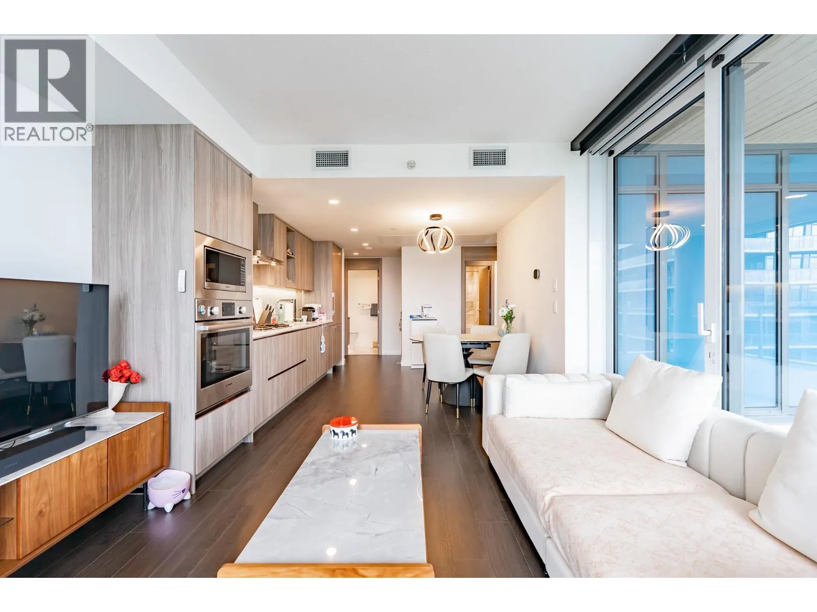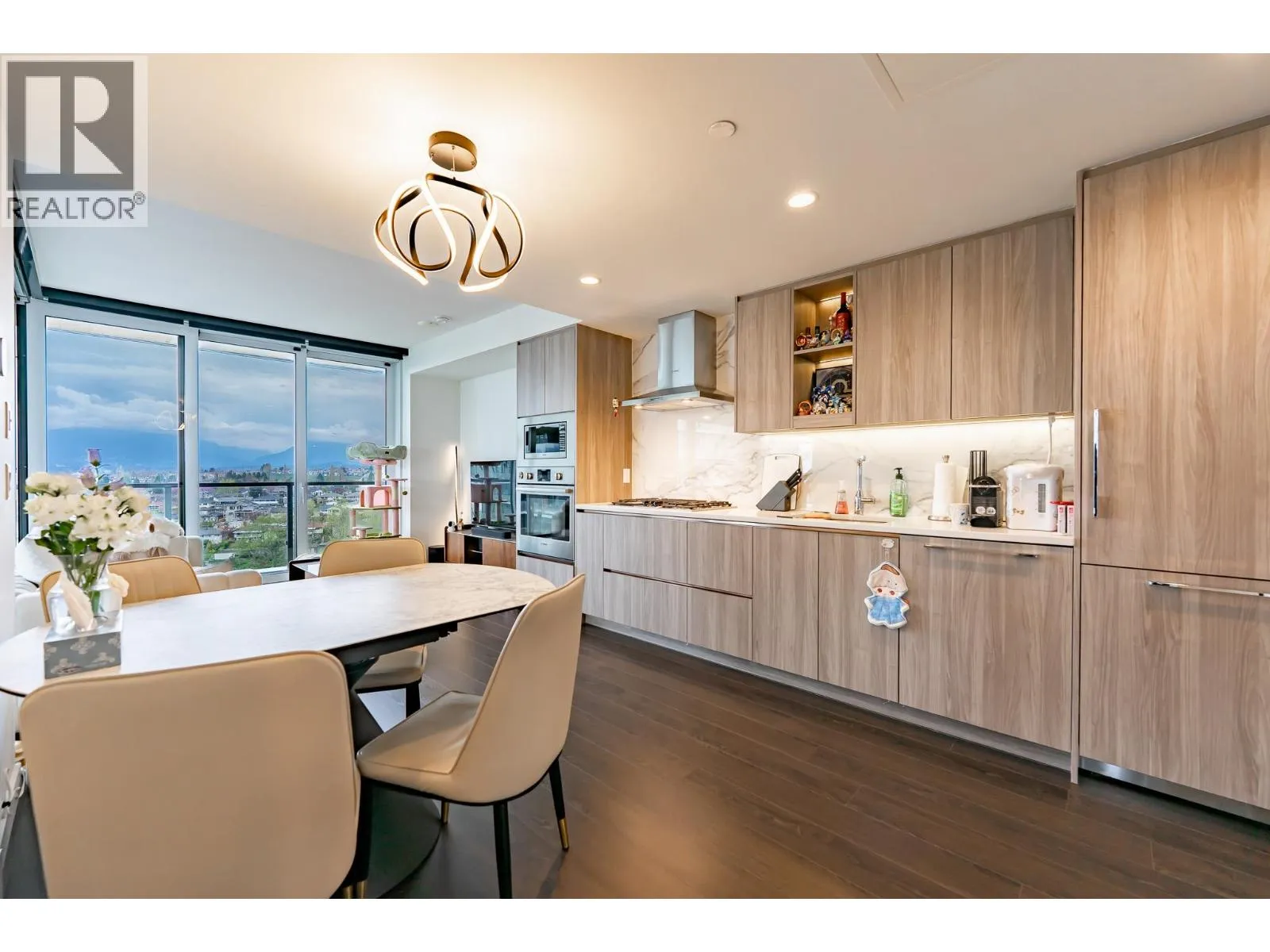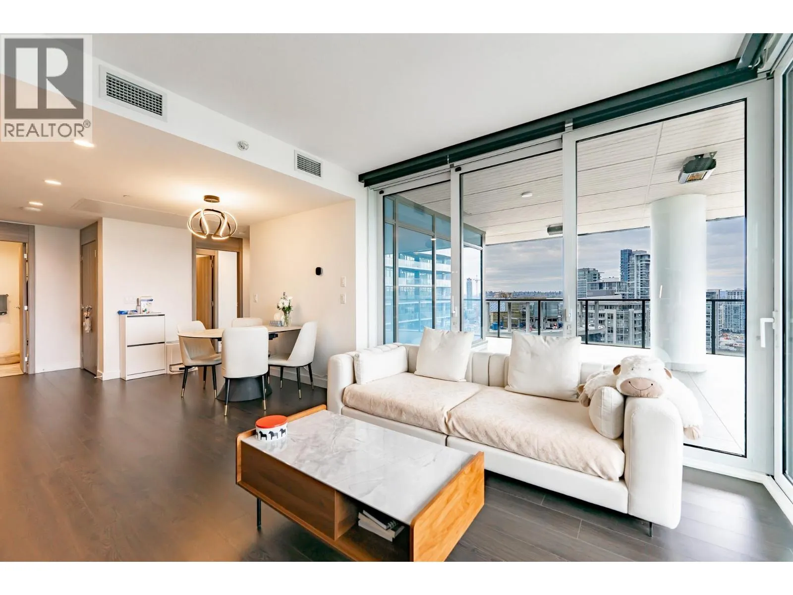 Welcome to this luxurious NW corner unit with stunning city and mountain views at Concord Brentwood Hillside East! Built by Concord Pacific, this 2-bed, 2-bath unit includes high-end integrated Bosch appliances, floor-to-ceiling windows, wide plank laminate flooring, central A/C, and closet organizers. Enjoy seamless indoor/outdoor living with an oversized 525 square ft covered wrap around balcony with a ceiling heater.