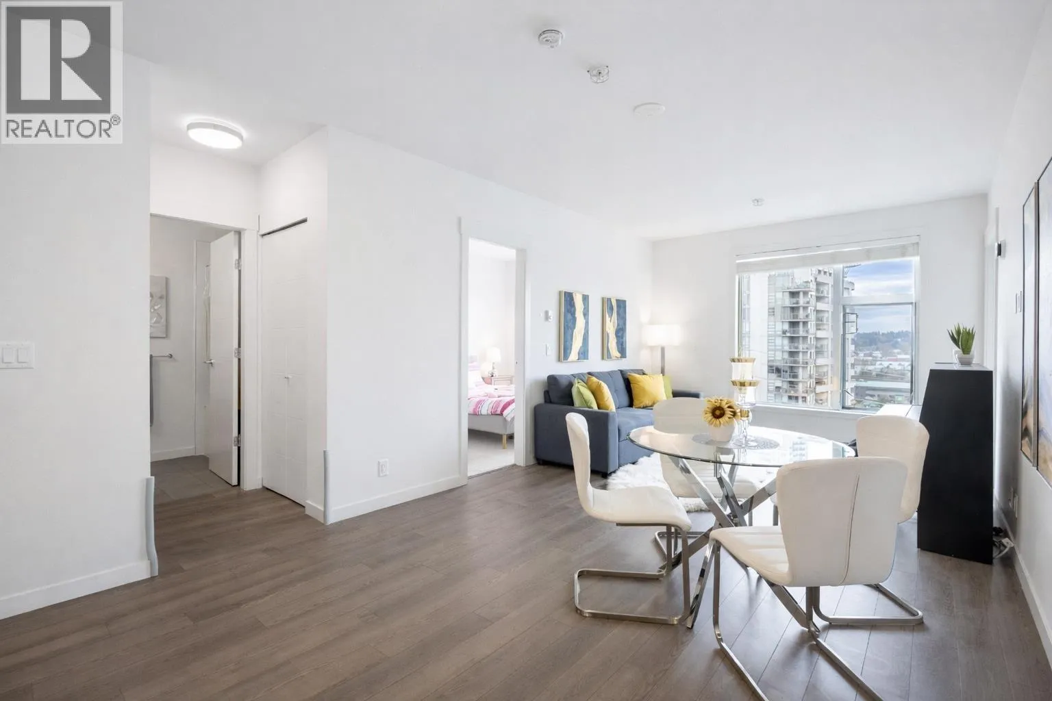 Capitol by Porte Homes, located in the vibrant core of Downtown New Westminster. This well-designed 2-bed, 2-bath home +1 den offers an open-concept layout based on the former display suite floor plan, featuring 9′ ceilings, in-suite laundry, wide-plank laminate flooring, soft-close cabinetry, full-size stainless steel appliances, quartz counters, tile backsplash, and a spacious balcony. Just steps to the SkyTrain, shops,
