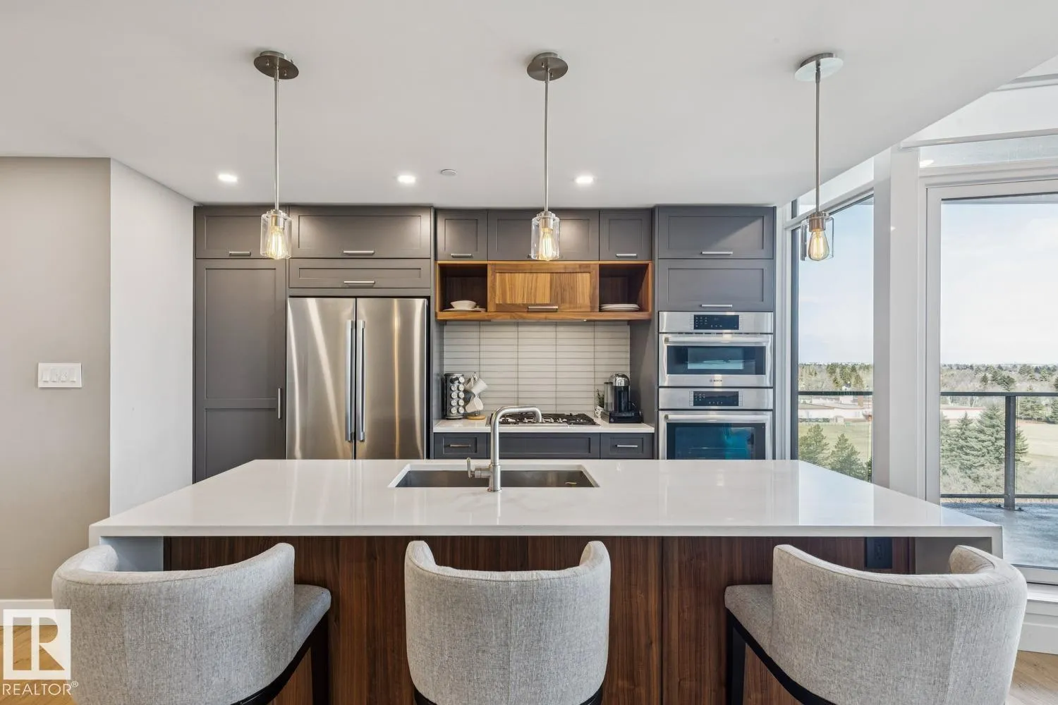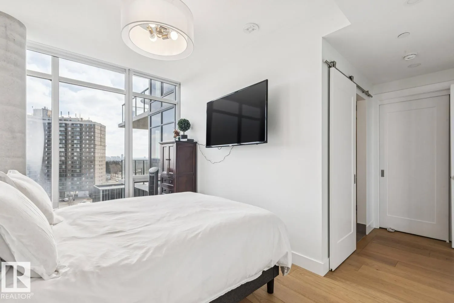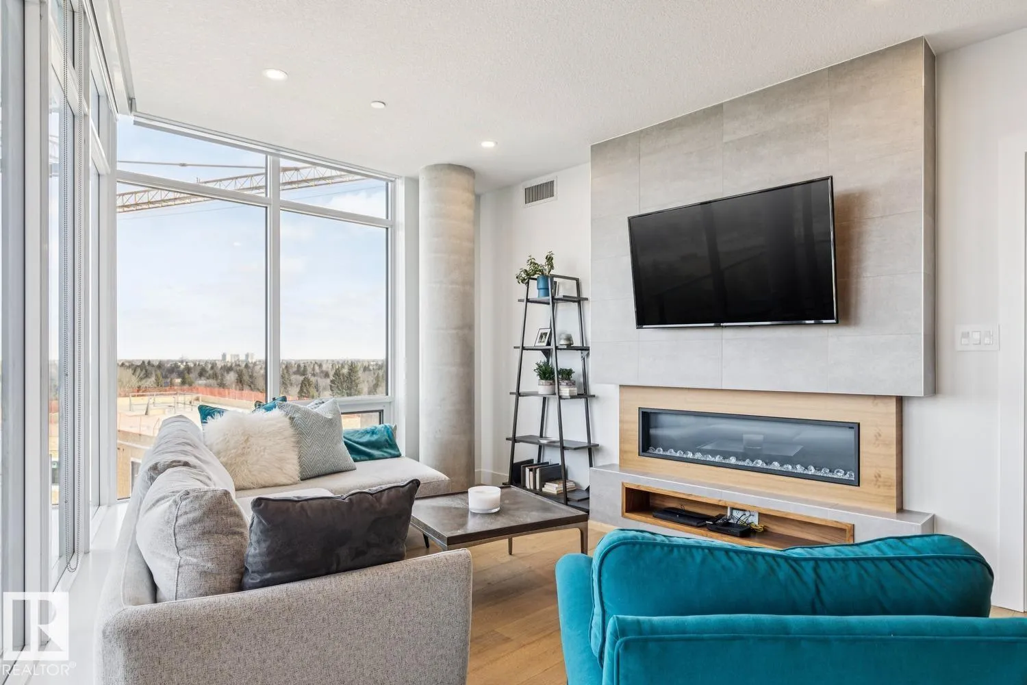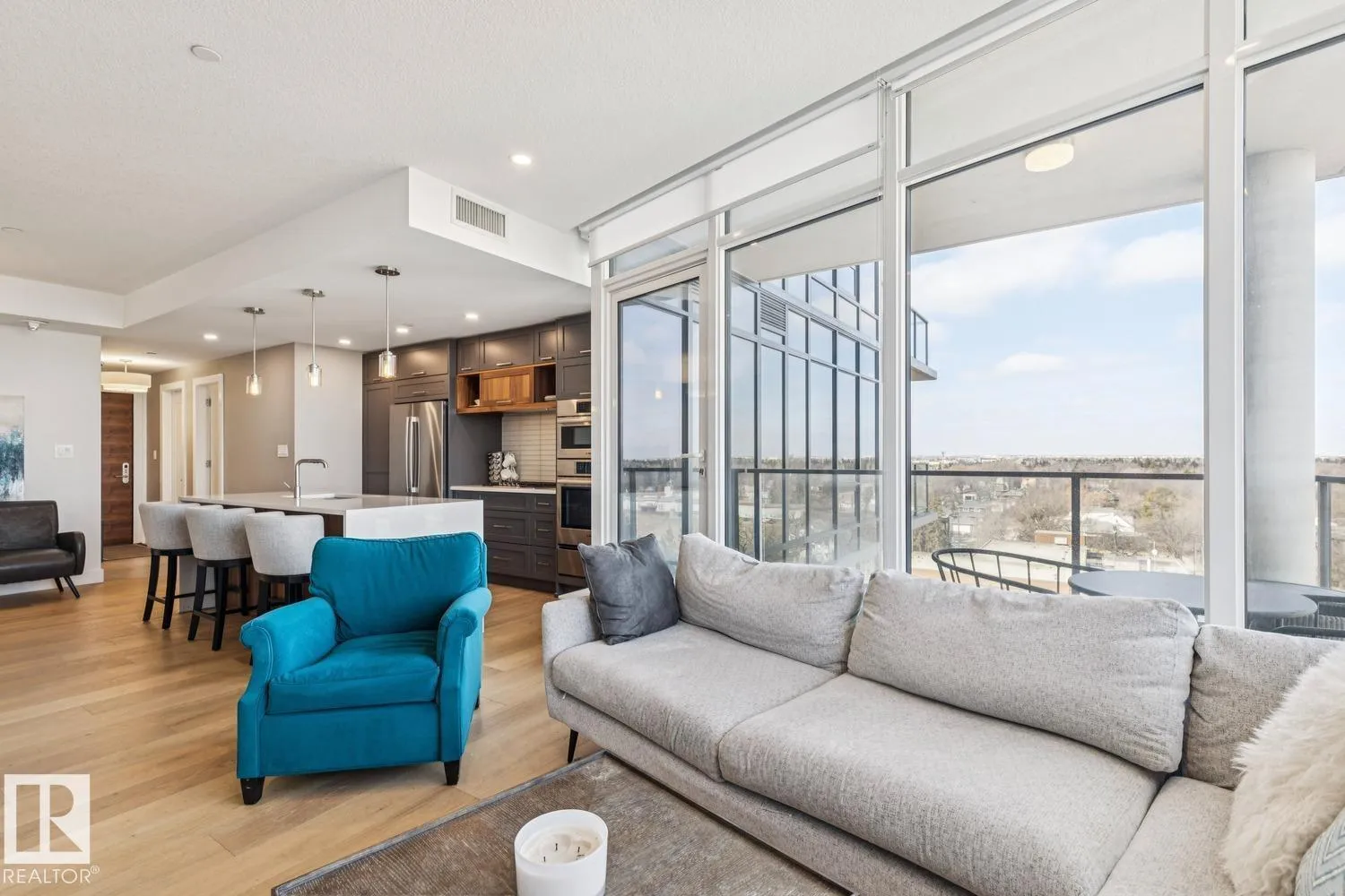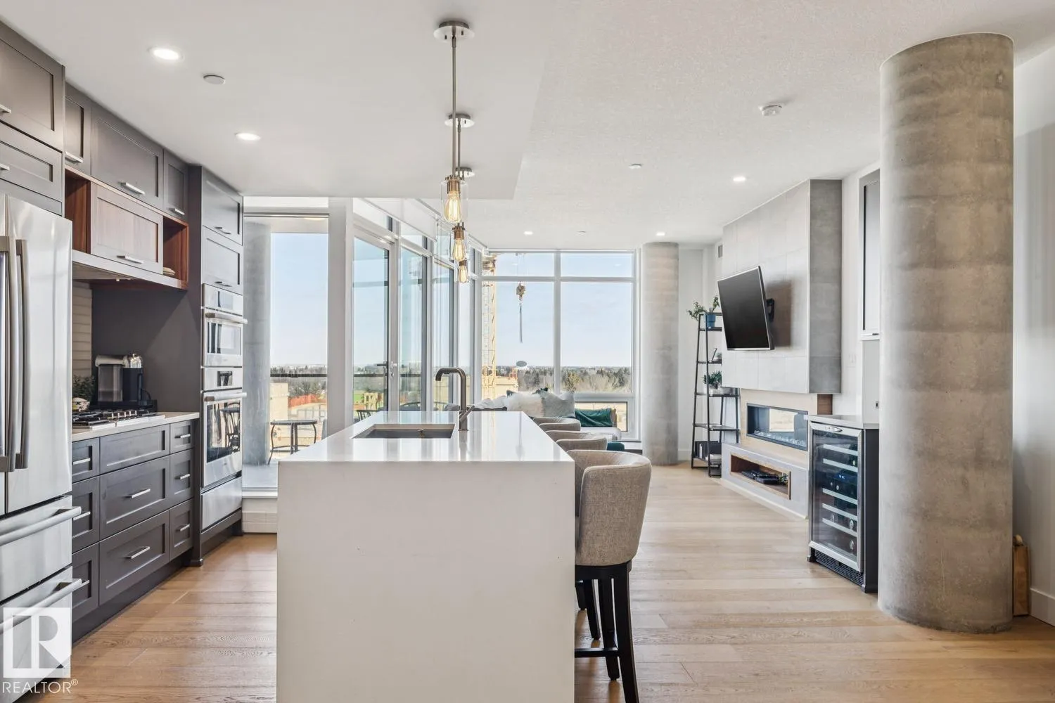 Luxury living at The West Block in Glenora, just minutes to downtown Edmonton. This stunning 7th-floor corner unit offers 2 bedrooms and 2 bathrooms, showcasing high-end finishes throughout, including wide plank hardwood floors and floor-to-ceiling windows with breathtaking skyline views from the northwest-facing balcony. The chef-inspired kitchen features quartz countertops, a gas stove, and a wine bar—perfect for entertaining. The