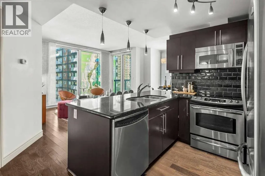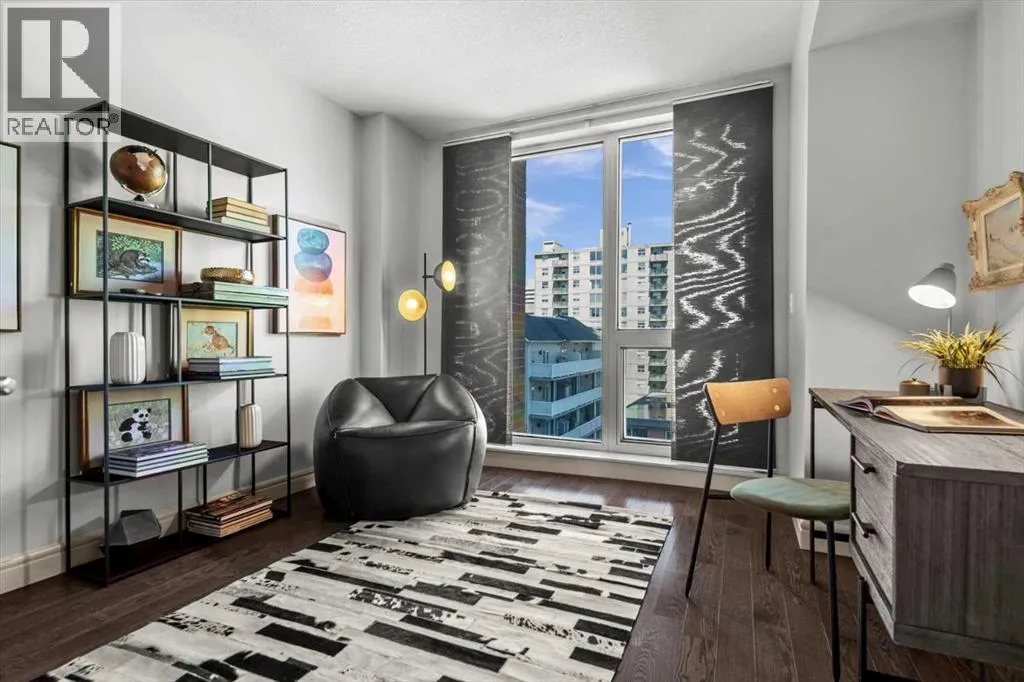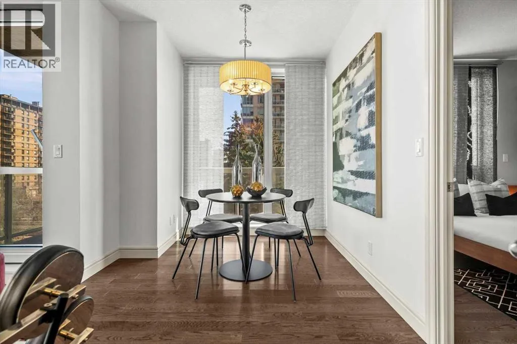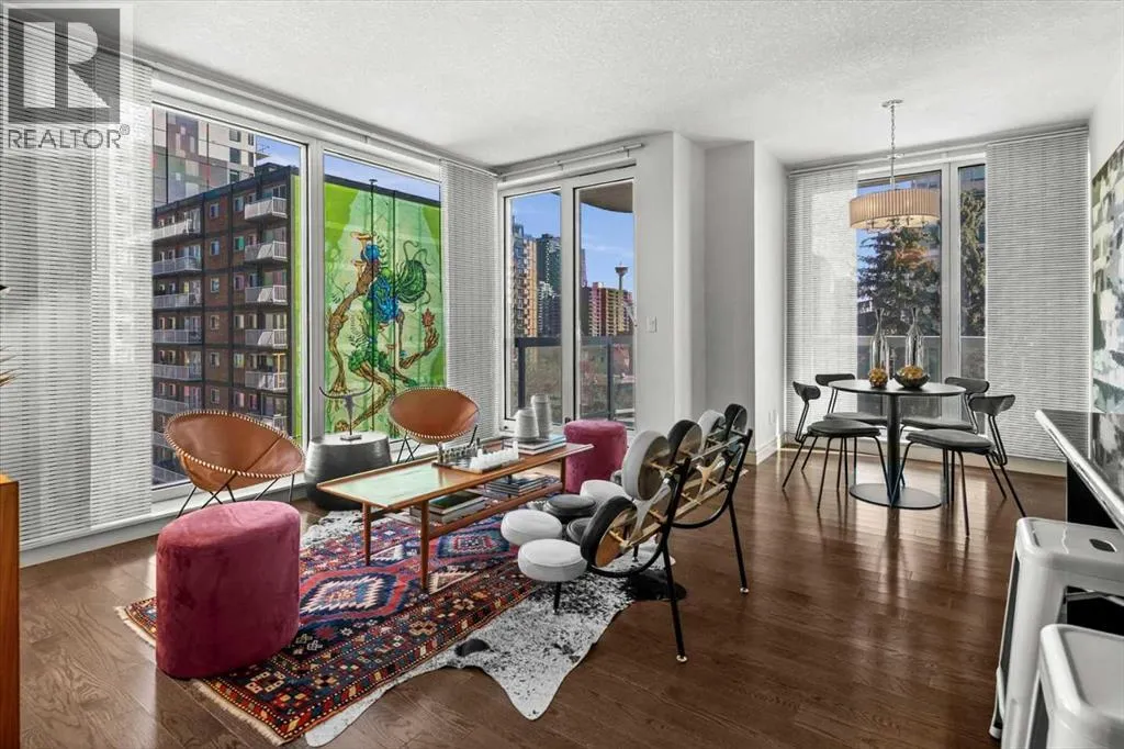 set back from the bustle of city life. Living here means embracing a truly walkable lifestyle. Start your mornings with coffee from a nearby café, pick up groceries or fresh produce just around the corner, or head to your favourite yoga studio or boutique gym, all without ever needing your car. Commuting is effortless, whether you work downtown, attend meetings across the core, or rely on nearby transit routes for easy access throughout the city. In the evenings, stroll to award-winning restaurants, lively patios, cocktail lounges, and local boutiques, then return home to a peaceful retreat elevated above the street. Inside, the open-concept layout is flooded with natural light thanks to floor-to-ceiling windows and a desirable corner orientation. Hardwood floors, central air conditioning and heating, in-suite laundry, and a thoughtful split-bedroom design create a space that feels both stylish and highly functional. The primary bedroom offers excellent privacy with a generous closet and a well-appointed ensuite, while the second bedroom and full bathroom are ideally positioned for guests, roommates, or a dedicated home office. Step onto the private balcony off the living room and enjoy your own outdoor space, complete with a gas BBQ hookup…perfect for relaxed evenings, summer grilling, or entertaining friends before heading out on 17th Ave. The home also includes titled underground parking and a separate storage locker, adding everyday convenience and peace of mind. The Montana is a standout building in Calgary’s urban landscape, known for its timeless architectural design an d quality concrete construction that provides superior soundproofing and long-term value. Residents enjoy a low-maintenance, luxury lifestyle with a 7-day concierge, a newly updated fitness centre, and condominium fees that include heat, water, insurance, and more. Beautifully maintained and move-in ready, this residence is ideal for professionals, downsizing, or urban enthusiasts seeking sophisticated downtown living without compromise. This is a home that truly complements the vibrant, connected lifestyle that downtown Calgary is known for. (id:64429)