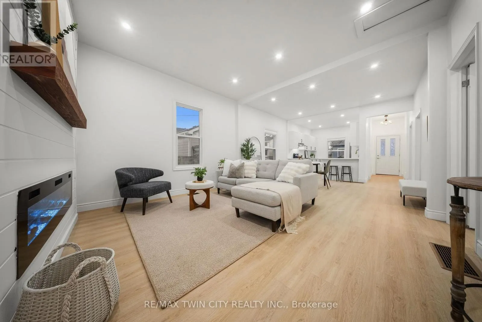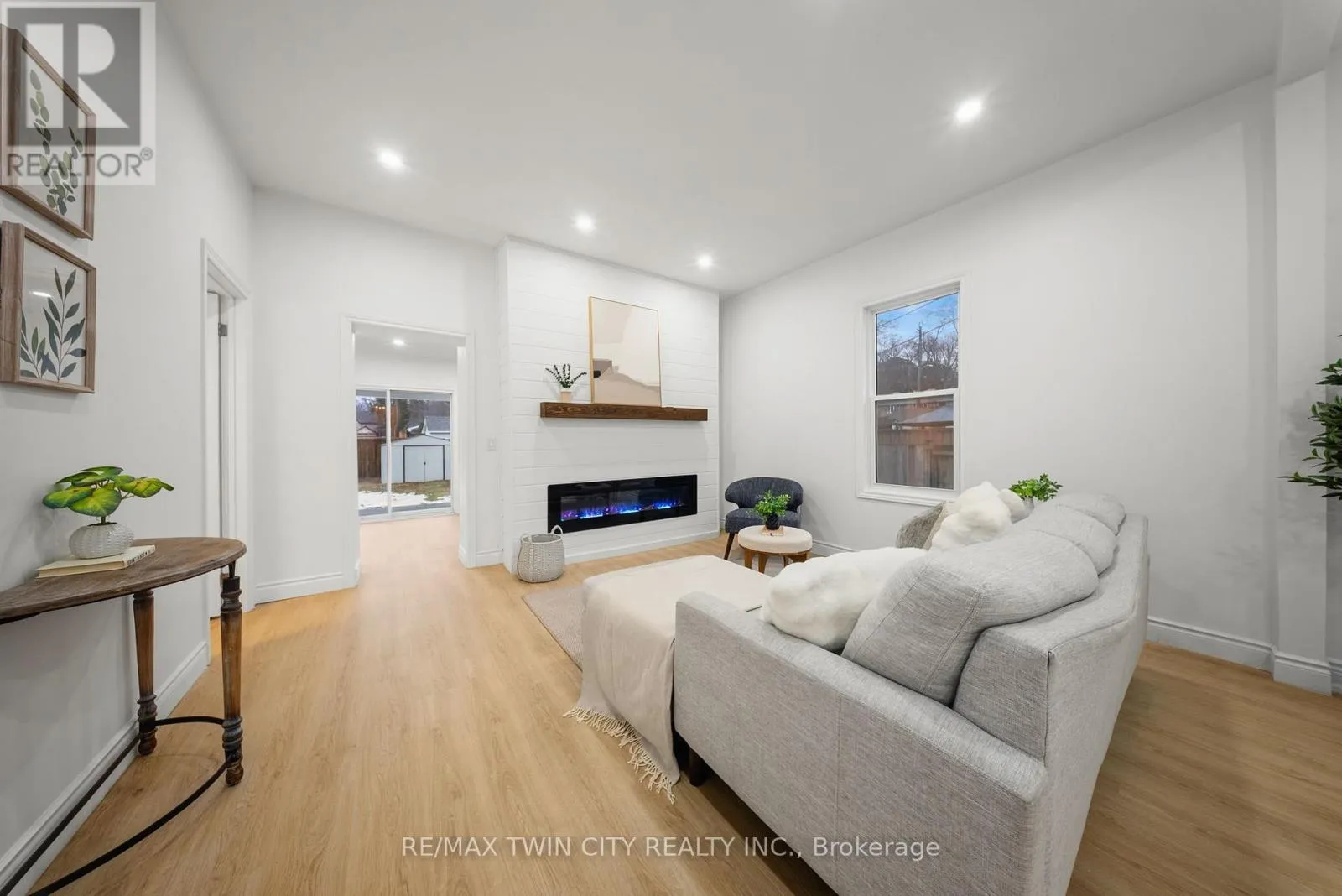 by an accent wall with a built-in fireplace. The modern kitchen is equipped with quartz countertops, a breakfast peninsula, and ample cabinetry, while high ceilings and large windows create a bright and inviting atmosphere throughout. Convenient main floor laundry adds to the home’s functionality. A second main-floor living room or rec-room offers additional space for relaxing or entertaining and features a patio door with direct access to the back deck. Recent updates include luxury vinyl plank flooring throughout, LED lighting, updated windows and doors, a 100-amp breaker panel, furnace, central air conditioning, and more. The unfinished basement offers excellent potential to add up to 1,000 square feet of additional living space, ideal for extra bedrooms, an in-law set-up, recreation space, or additional storage. Step outside to enjoy the large stamped concrete patio overlooking the expansive, private fenced backyard, perfect for entertaining on warm summer evenings. Schedule your private viewing today! (id:62650)