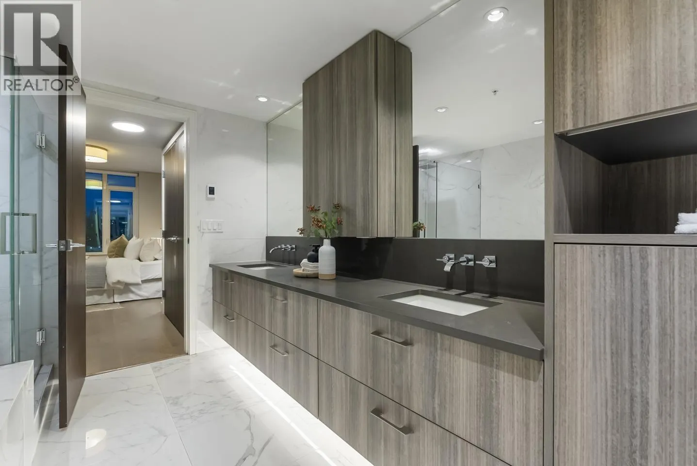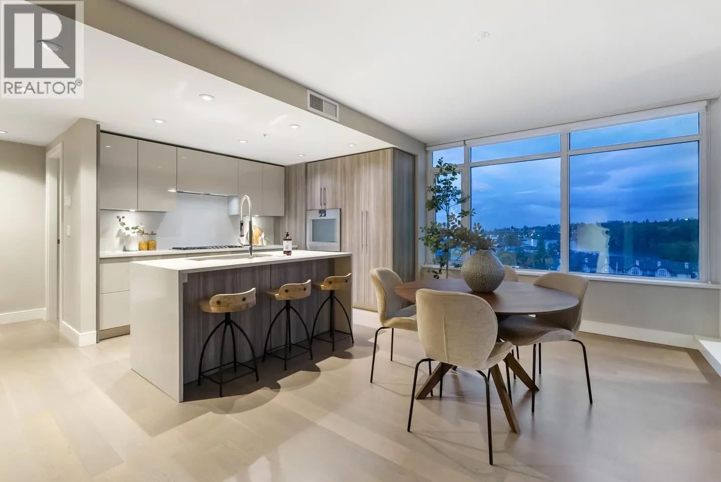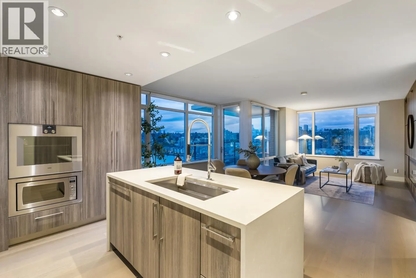 Experience waterfront luxury at The Peninsula, New Westminster´s crown jewel on the river. This luxurious 2 BDRM, 2 BATH home offers nearly 1200 square ft of refined elegance with custom millwork, herringbone hardwood floors & soaring floor-to-ceiling windows capturing breathtaking west-facing sunsets over the Fraser River & city skyline. A chef-inspired kitchen with integrated Gaggenau appliances, a quartz waterfall island,