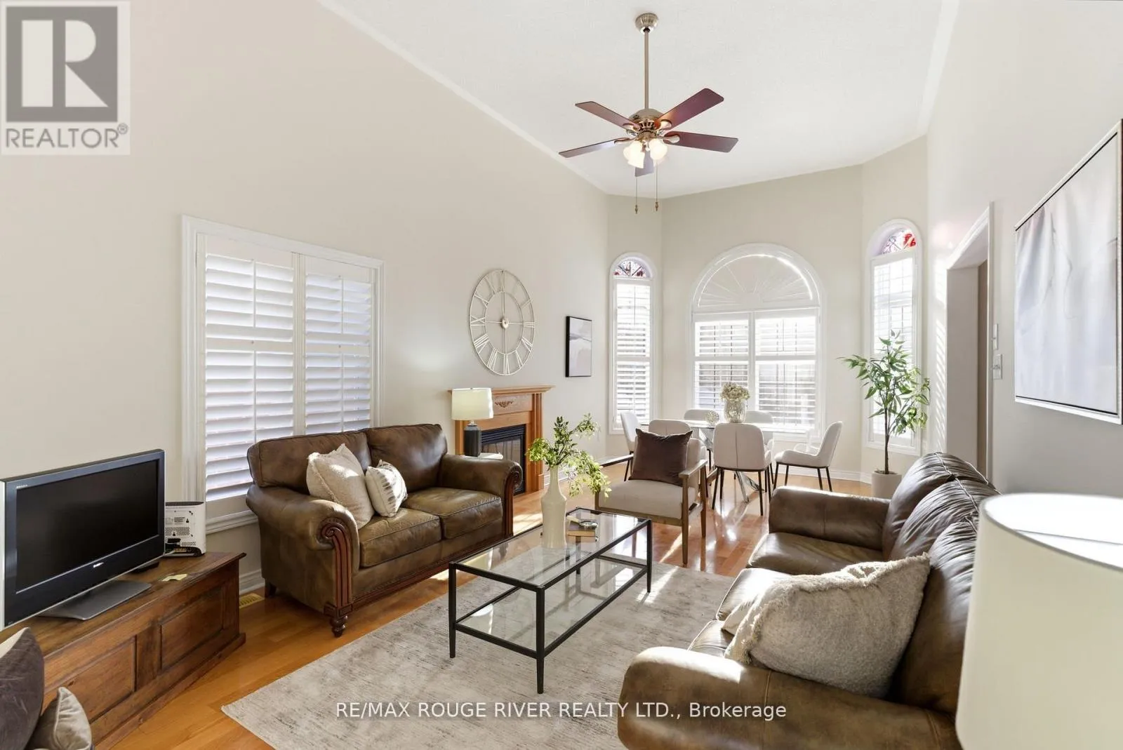 Welcome to this beautifully maintained home offering exceptional space and thoughtful features throughout. The bright and airy living and dining room showcases high ceilings, rich hardwood flooring, a cozy gas fireplace, and elegant California shutters, creating a warm yet sophisticated setting for both everyday living and entertaining. The dining area overlooks the front yard, adding natural light and charm to