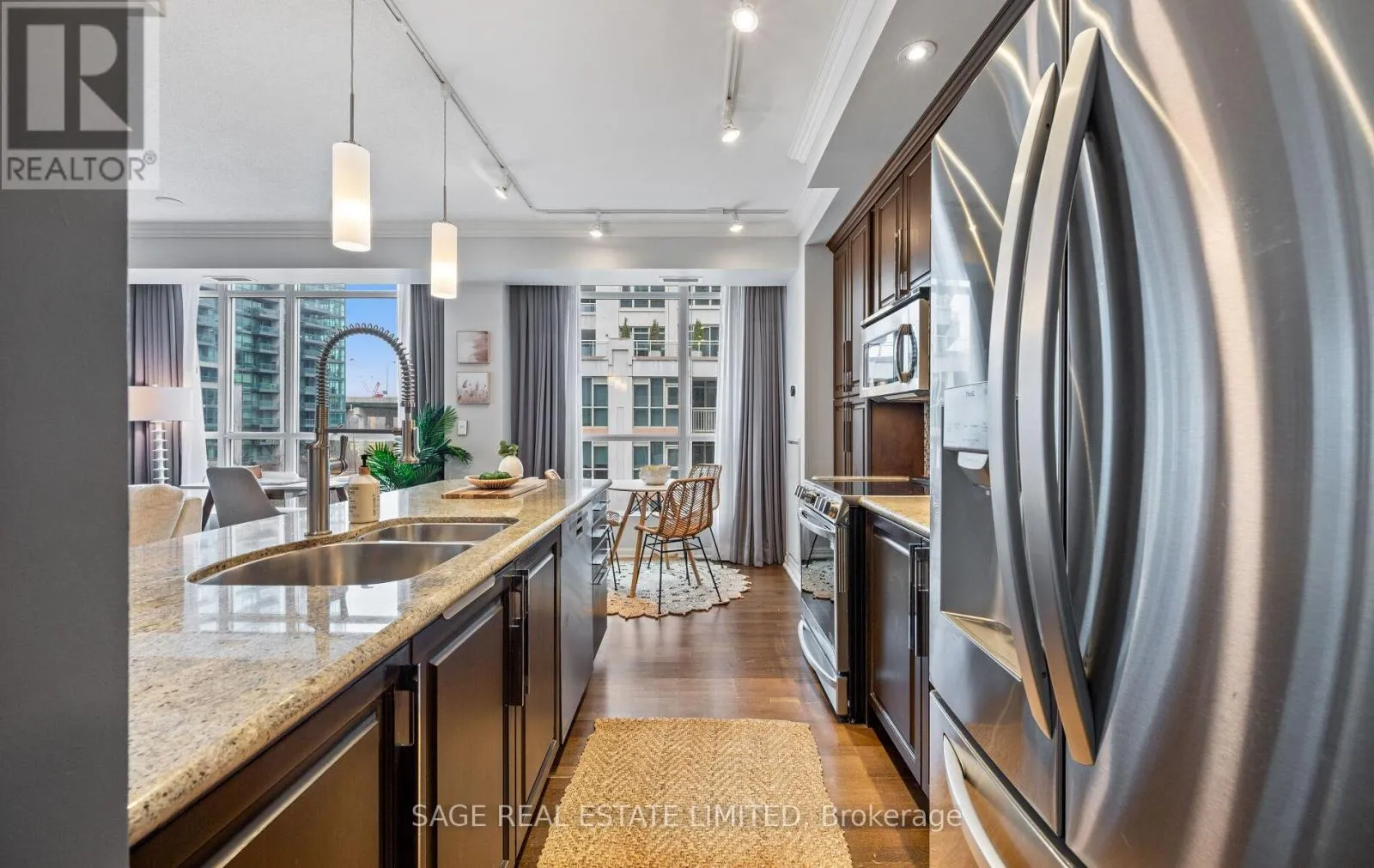 Luxury Waterfront Living at Its Finest! This elegant and spacious corner suite offers a bright, open-concept layout with 9-ft ceilings, large windows, and modern finishes throughout. Featuring 2+1bedrooms and 2 bathrooms, including a generous primary retreat with 4-piece ensuite and Lutron blackout blinds. The den with French doors is ideal for a home office or guest space. The upgraded kitchen