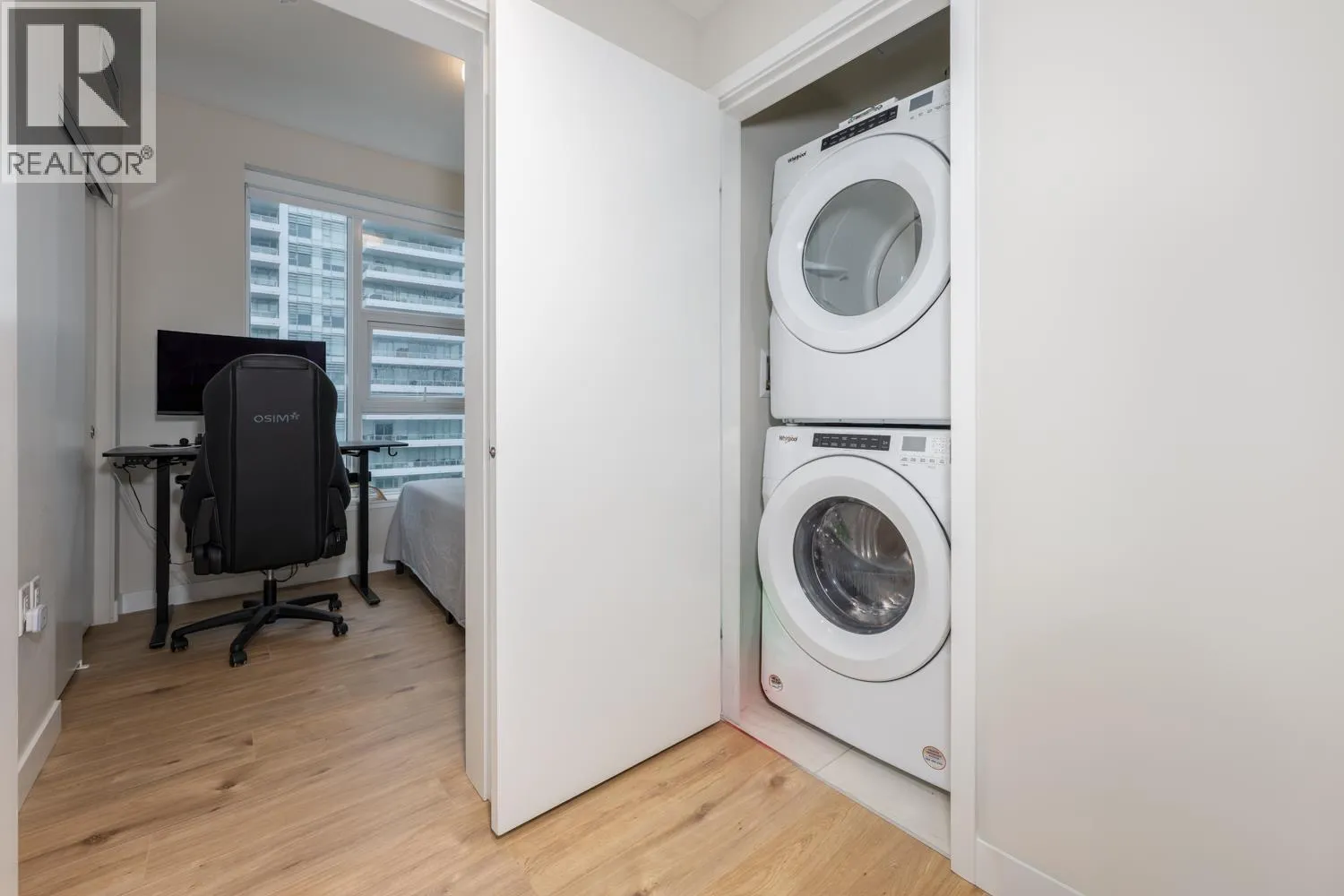 PARADIGM at River District by WesGroup! Mins walk to the scenic Riverwalk, 2 bedrooms + 1 den Northeast facing with river view and natural light. A high-efficiency heat pump providing both cooling and heating. Secure parking, and access to concierge, fitness, yoga, rooftop BBQ and a party lounge. A sleek, modern kitchen features stainless steel appliances, gas range, built-in oven,