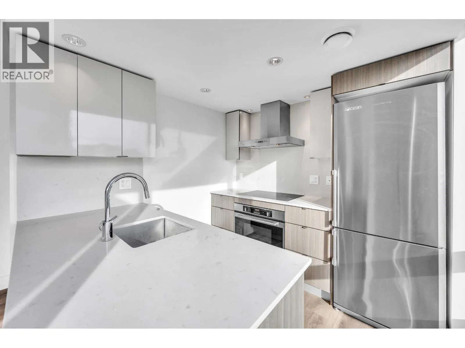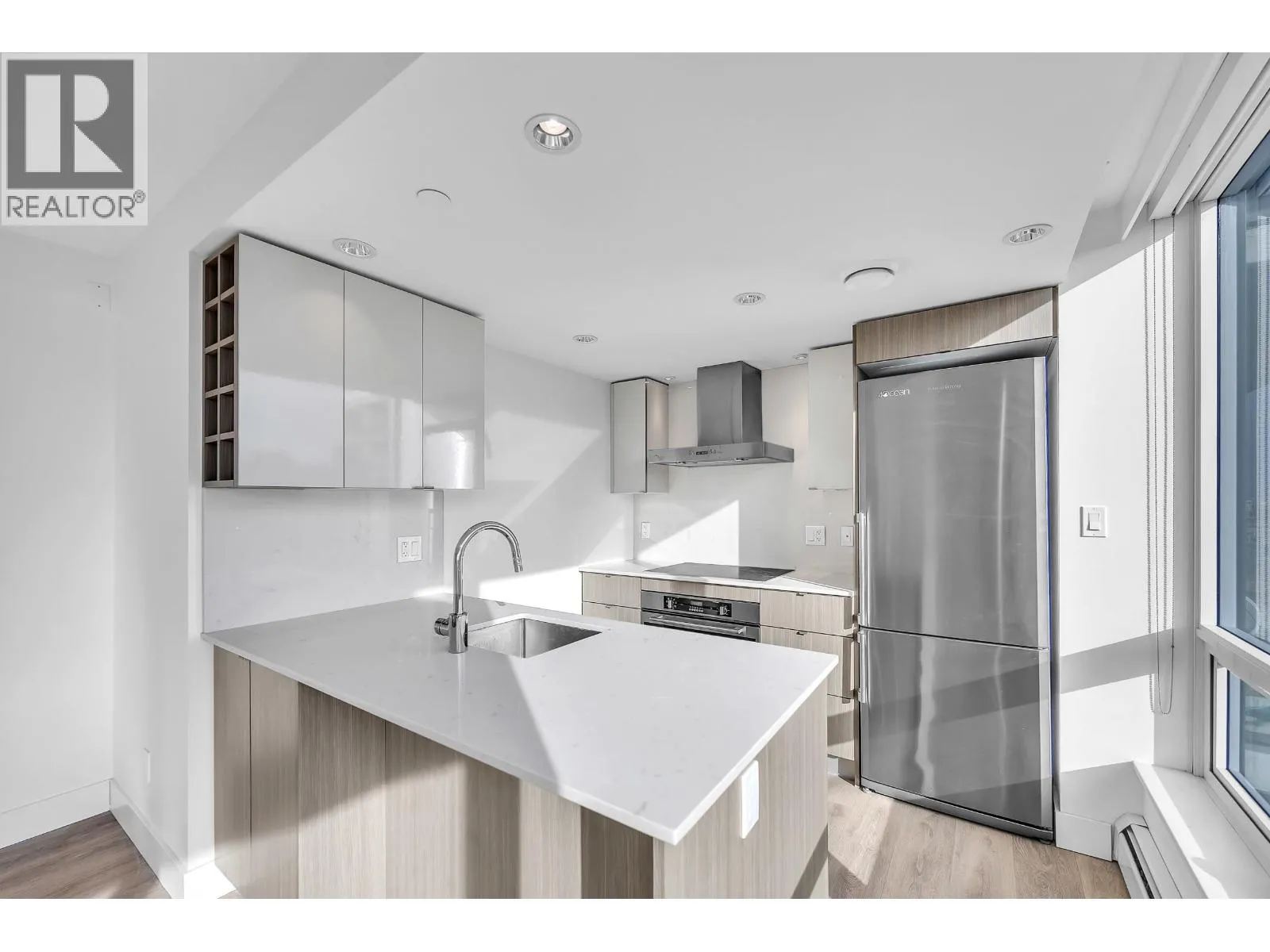 Olympic Village living at Epic at West, built in 2017 by Executive Group Development. This bright 1-bedroom + den home features floor-to-ceiling window walls that flood the space with natural light, plus double-glazed thermal and acoustic insulated windows. The contemporary kitchen offers Carrara marble-inspired quartz countertops and backsplash, European stainless steel appliances including a Blomberg fridge and dishwasher, and a